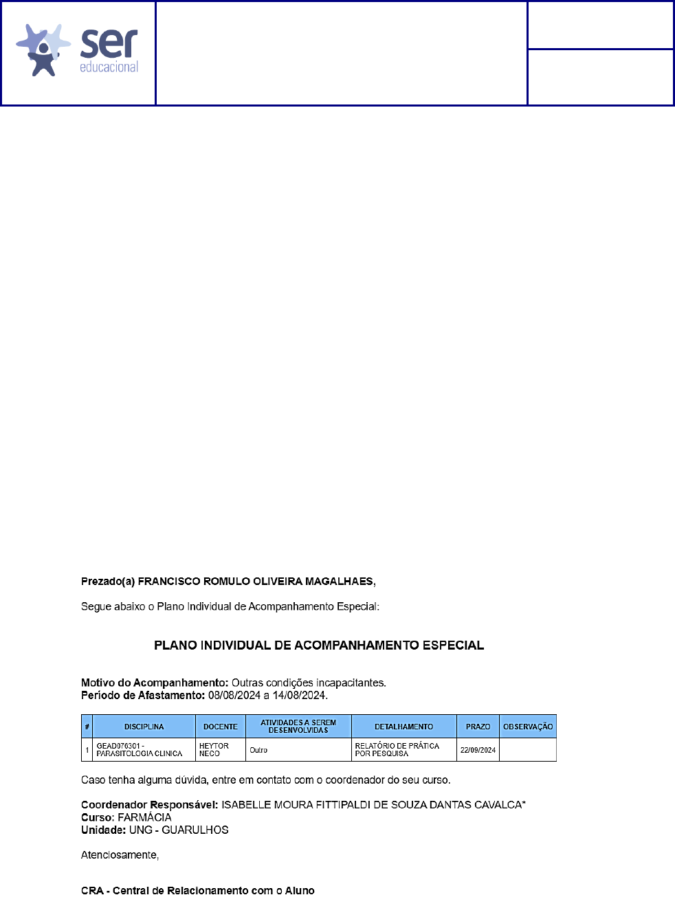 RELATÓRIO DE AULAS PRÁTICAS ENSINO DIGITAL RELATÓRIO 01 DATA: ______/______/______ RELATÓRIO DE PRÁTICA 01 Francisco Rômulo Oliveira Magalhães Matrícula: 28308109 O RELATÓRIO SEGUE O SOLICITADO PELO PLANO INDIVIDUAL DE ACOMPANHAMENTO ESPECIAL DO CHAMADO - 12415440, CONFORME A IMAGEM ABAIXO: RELATÓRIO DE AULAS PRÁTICAS ENSINO DIGITAL RELATÓRIO 01 DATA: ______/______/______ RELATÓRIO DE AULAS PRÁTICAS: Parasitologia Clínica DADOS DO(A) ALUNO(A): NOME: Francisco Rômulo Oliveira Magalhães MATRÍCULA: 28308109 CURSO: Farmácia POLO: Flamengo - RJ PROFESSOR(A) ORIENTADOR(A): ORIENTAÇÕES GERAIS: • O relatório deve ser elaborado individualmente e deve ser escrito de forma clara e • concisa; • O relatório deve conter apenas 01 (uma) lauda por tema; • Fonte: Arial ou Times New Roman (Normal e Justificado); • Tamanho: 12; Margens: Superior 3 cm; Inferior: 2 cm; Esquerda: 3 cm; Direita: 2 cm; • Espaçamento entre linhas: simples; • Título: Arial ou Times New Roman (Negrito e Centralizado). TEMA DE AULA: Rugai e Willis RELATÓRIO: 1. Descrever os principais aspectos da(s) técnica(s) utilizada(s) para ovos leves, abordando as principais diferenças. As técnicas para a detecção de ovos leves são utilizadas principalmente para identificar parasitas que apresentam ovos com densidade inferior à solução utilizada para a análise. A mais comum é a técnica de flutuação, que utiliza soluções com alta densidade, como solução saturada de açúcar, sulfato de zinco ou solução de cloreto de sódio, para concentrar os ovos de parasitas. Durante o processo, os ovos presentes nas fezes do hospedeiro flutuam e se acumulam na superfície da solução, facilitando a identificação. • Técnica de Flutuação de Willis: Uma das mais utilizadas, envolve misturar uma pequena quantidade de fezes em uma solução saturada de sal. O recipiente é então preenchido até a borda com a solução, criando um menisco RELATÓRIO DE AULAS PRÁTICAS ENSINO DIGITAL RELATÓRIO 01 DATA: ______/______/______ convexo. Uma lâmina de vidro é colocada sobre o menisco e, após um período, os ovos que flutuaram aderem à lâmina. • Técnica de Faust: Utiliza uma solução saturada de açúcar e é especialmente eficiente para detectar ovos e larvas de diferentes parasitas. A principal diferença em relação à técnica de Willis é a solução utilizada, que apresenta uma maior densidade, tornando-a eficaz para uma variedade maior de ovos de diferentes parasitas. • Técnica de Flotac: É uma técnica moderna que utiliza soluções de diferentes densidades em um dispositivo específico para a concentração de ovos. É considerada mais sensível e permite a detecção de uma ampla gama de parasitas em uma única amostra. A principal diferença entre essas técnicas reside na densidade das soluções utilizadas e na sensibilidade para a detecção de ovos. Técnicas como a de Faust são mais sensíveis para um espectro maior de parasitas devido à solução de açúcar. 2. Citar os principais parasitas detectados por essas técnicas. As técnicas de flutuação para ovos leves são eficazes para a detecção de vários parasitas, incluindo: • Ascaris lumbricoides (Ascaridíase) • Trichuris trichiura (Tricuríase) • Ancylostoma duodenale e Necator americanus (Ancilostomídeos) • Enterobius vermicularis (Oxiuríase) • Hymenolepis nana (Himenolepíase) Essas técnicas são essenciais na identificação de infecções intestinais, permitindo o diagnóstico e o tratamento adequado dos pacientes. RELATÓRIO DE AULAS PRÁTICAS ENSINO DIGITAL RELATÓRIO 01 DATA: ______/______/______ REFERÊNCIAS BENCHIMOL, D. Parasitologia Clínica: Seleção de Métodos e Técnicas de Exame. 1ª ed. Rio de Janeiro: Guanabara Koogan, 2016. NEVES, D. P.; EIRAS, D. F.; CURY, M. C. Parasitologia Humana. 13ª ed. São Paulo: Atheneu, 2011. GARCIA, L. S. Diagnostic Medical Parasitology. 6th ed. Washington, DC: ASM Press, 2016. MINISTÉRIO DA SAÚDE. Manual de Diagnóstico Laboratorial das Parasitoses Intestinais. 2ª ed. Brasília: Ministério da Saúde, 2014. RELATÓRIO DE AULAS PRÁTICAS ENSINO DIGITAL RELATÓRIO 02 DATA: ______/______/______ RELATÓRIO DE PRÁTICA 02 Francisco Rômulo Oliveira Magalhães Matrícula: 28308109 O RELATÓRIO SEGUE O SOLICITADO PELO PLANO INDIVIDUAL DE ACOMPANHAMENTO ESPECIAL DO CHAMADO - 12415440, CONFORME A IMAGEM ABAIXO: RELATÓRIO DE AULAS PRÁTICAS ENSINO DIGITAL RELATÓRIO 02 DATA: ______/______/______ RELATÓRIO DE AULAS PRÁTICAS: Parasitologia Clínica DADOS DO(A) ALUNO(A): NOME: Francisco Rômulo Oliveira Magalhães MATRÍCULA: 28308109 CURSO: Farmácia POLO: Flamengo - RJ PROFESSOR(A) ORIENTADOR(A): ORIENTAÇÕES GERAIS: • O relatório deve ser elaborado individualmente e deve ser escrito de forma clara e • concisa; • O relatório deve conter apenas 01 (uma) lauda por tema; • Fonte: Arial ou Times New Roman (Normal e Justificado); • Tamanho: 12; Margens: Superior 3 cm; Inferior: 2 cm; Esquerda: 3 cm; Direita: 2 cm; • Espaçamento entre linhas: simples; • Título: Arial ou Times New Roman (Negrito e Centralizado). TEMA DE AULA: Hoffman, Kato-Katz e Faust e col RELATÓRIO: 1. Descrever os principais aspectos das técnicas utilizadas para ovos pesados, abordando as principais diferenças As técnicas para a detecção de ovos pesados são utilizadas para identificar parasitas cujos ovos apresentam densidade superior à da solução de análise e, por isso, tendem a se depositar no fundo do recipiente. A técnica mais utilizada para este propósito é a técnica de sedimentação, que se baseia na centrifugação ou repouso para concentrar os ovos no sedimento. • Técnica de Sedimentação Espontânea (Hoffman, Pons e Janer): É um método simples e de baixo custo, em que a amostra de fezes é misturada com água e deixada em repouso por um determinado tempo. Os ovos pesados se depositam no fundo do recipiente, e o sedimento é analisado ao micros