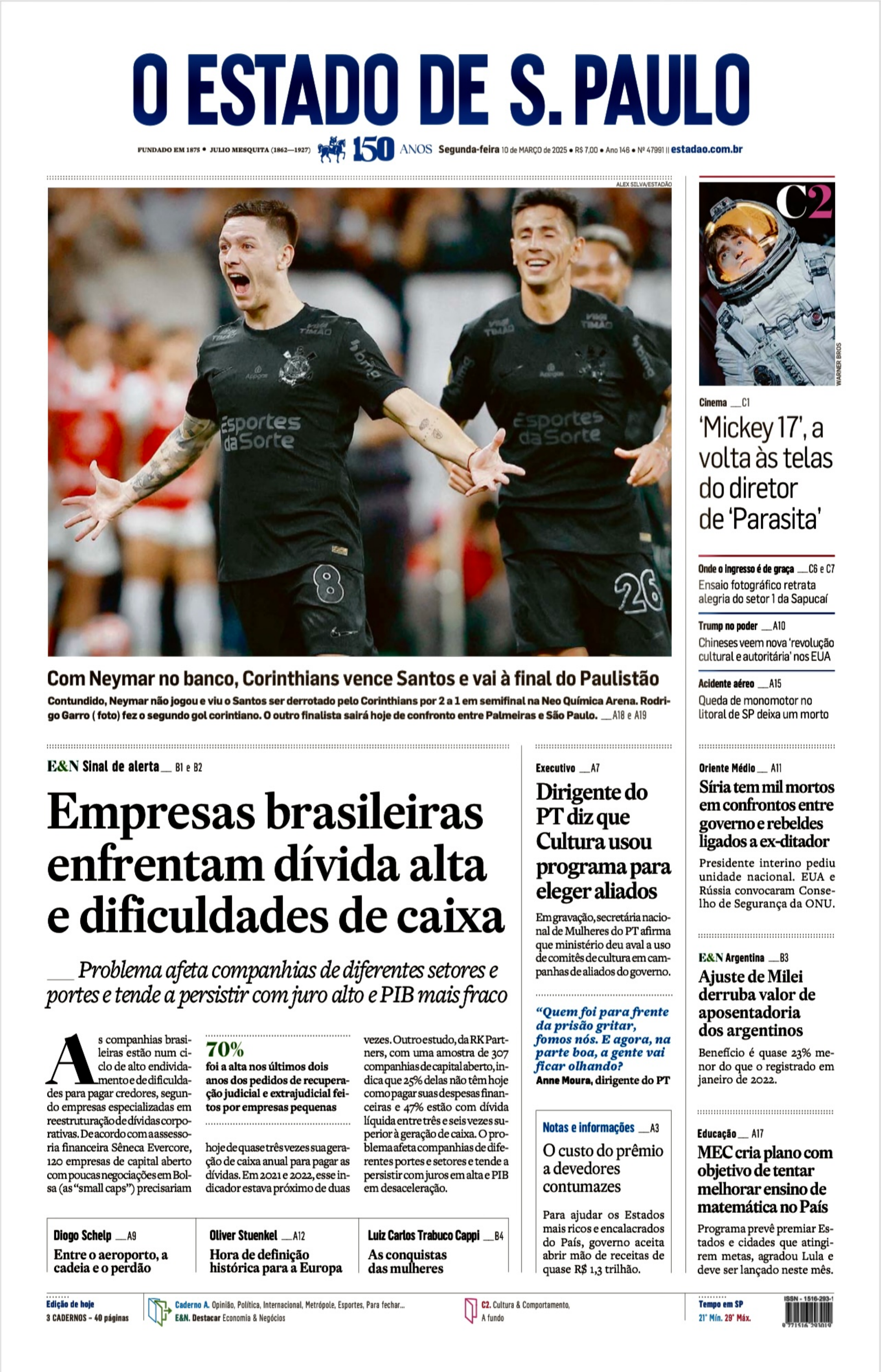 DE S. PAULO FUNDADO EM 1875 JULIO MESQUITA (1862-1927) 150 ANOS Segunda-feira 10 de MARÇO de 2025 R$ 7.00 . Ano 146 47991 estadao.com.br C2 Cinema C1 Esportes Esportes daSorte daSorte 17', a volta às telas do diretor de 'Parasita' Onde 0 é de graça C6 e C7 26 Ensaio fotográfico retrata alegria do setor 1 da Trump no poder A10 Chineses veem nova cultural e autoritária" nos EUA Com no banco, Corinthians vence Santos e vai à final do Paulistão Acidente aéreo A15 Contundido, Neymar não jogou e viu o Santos ser derrotado pelo Corinthians por 2 a 1 em semifinal na Neo Química Arena. Rodri- Queda de monomotor no go Garro (foto) fez o segundo gol corintiano. outro finalista sairá hoje de confronto entre Palmeiras e São Paulo. A18 A19 litoral de SP deixa um morto E&N Sinal de alerta B2 Executivo A7 Oriente All Dirigente do Síria tem mil mortos Empresas brasileiras em confrontos entre PT diz que governo e rebeldes Cultura usou ligados a ex-ditador enfrentam dívida alta programa para Presidente interino pediu unidade nacional. EUA e eleger aliados Rússia convocaram Conse- e dificuldades de caixa lho de Segurança da ONU. Em secretária nacio- nal de Mulheres do PT afirma que ministério deu aval a uso de comitês de cultura em cam- E&N Argentina B3 Problema afeta companhias de diferentes setores e panhas de aliados do governo. Ajuste de Milei portes e tende a persistir com juro alto e PIB mais fraco derruba valor de "Quem foi para frente aposentadoria da prisão gritar, S companhias brasi- vezes. Outroestudo, da RK Part- fomos nós. E agora, na dos argentinos A leiras estão num ci- 70% ners, com uma amostra de 307 parte boa, a gente vai Benefício é quase 23% me- clo de alto endivida- foi a alta nos últimos dois capitalaberto, in- ficar olhando? nor do que registrado em mentoe de edificulda- anos dos pedidos de recupera- dica que 25% delas não têm hoje Anne Moura, dirigente do PT janeiro de 2022. des para pagar credores, segun- ção judicial e extrajudicial fei- como pagar suas despesas finan- do empresas especializadas em tos por empresas pequenas ceiras e 47% estão com dívida reestruturação de dívidas corpo- líquida entre três seis vezes su- rativas. Deacordo com aassesso- perior à geração de caixa. o pro- Notas e informações A3 Educação A17 ria financeira Sêneca Evercore, hoje de quase três vezes sua agera- blemaafeta companhias de dife- o custo do prêmio 120 empresas de capital aberto ção de caixa anual para pagar as rentes portes e setores e tende a MEC cria plano com com poucas negociaçõesem Bol- dívidas. Em 2021 e 2022, esse in- a devedores persistir com juros em alta e PIB objetivo de tentar sa (as"small caps") precisariam dicador estava próximo de duas em desaceleração. contumazes melhorar ensino de matemática no País Para ajudar os Estados Oliver Stuenkel A12 mais ricos e encalacrados Diogo Schelp A9 Luiz Carlos Trabuco Cappi B4 Programa prevê premiar Es- do País, governo aceita tados e cidades que atingi- Entre o aeroporto, a Hora de definição As conquistas abrir mão de receitas de rem metas, agradou Lula e cadeia e o perdão histórica para a Europa das mulheres quase R$ 1,3 trilhão. deve ser lançado neste mês. ISSN Edição de hoje Caderno A. Opinião, Política, Para fechar.. C2. Cultura & Comportamento, Tempo em SP 3 CADERNOS 40 páginas E&N. Destacar Economia & Negócios A fundo 21' Min10 DE MARÇO DE 2025 A2 0 ESTADO DE S. PAULO ROSEANN KENNEDY Coluna do COM EDUARDO BARRETTO E IANDER PORCELLA Estadão Alexandre Silveira vai cobrar SINAIS PARTICULARES Ibama para perfuração na Bacia da Foz do Amazonas por Kleber Sales ministro de Minas e Energia, Alexandre Silveira, 0 decidiu agir pessoalmente para cobrar do Ibama (Instituto Brasileiro do Meio Ambiente e dos Re- cursos Naturais Renováveis) uma decisão rápida a favor da exploração de petróleo na Margem Equatorial. Ele disse à Coluna que irá à sede do órgão, nesta semana, para falar com presidente Rodrigo Agostinho, estar confiante de que ogestor rejeitará o parecer técnico contrário à perfuração do bloco FZA-M-59 no litoral do Amapá, na Bacia da Foz do Amazonas. o ministro alegou quea Petrobras já atendeu os requisitos solicitados para a concessão da licença ambiental e avaliou que o parecer técnico não tem solidez porque édiscricionário. "Olaudo não aponta uma ilegalidade, aponta uma convicção". DEMORA. "É prejuízo para a QUEM... A governadora de Per- maior companhia do uma nambuco, Raquel Lyra, filia-se péssima sinalização para hojeao PSD. Amudança de parti- mia nacional por causa da estag- do tem foco na reeleição. Ao dei- nação de investimentos estra- xar o PSDB, a ex-tucana se livra tégicos, e um crime lesa pátria da pecha de opositora ao gover- contra povo do Amapá". no federal, reforça a aproxima- ção com o presidente Lula e abre as sarticulações para compor cha- Alexandre Silveira, ministro de Minas e Energia COMPARAÇÃO. que adiantou pa com PT em 2026. demorar 11 anos para licenciar a linha de transmissão Manaus Boa Vista? Deixar as térmicas a começaa JUNTANDO.. Sindicato Nacio- PRONTO, FALEI! CLICK óleo de Manaus Boa Vista? Eago- ser desenhado no Estado aponta nal dos Funcionários do Banco INSTAGRAM ra nós vamos entregar. E óleo para a possibilidade de Raquel Central avalia processar autori- queimou durante 11 aumen- ter um petista concorrendo ao dadesque espalham mentiras so- tando o custo de energia para o Senado em seu palanque. Se isso bre o Pix. Após BC anunciar consumidor do Brasil". ocorrer, o PT ficará rachado. Ho- que os bancos terão de cancelar je partido de Lula é aliado do chaves Pix de pessoas ou empre- prefeito do Recife, João Campos sas com situação irregular na Re- COP 30. "Não há motivo para (PSB), apontado como principal ceita Federal, para evitar gol- constrangimento. o Brasil tem adversário da agovernadorae pes, o governo sofreu nova on- que se orgulhar de sua matriz rito nas pesquisa