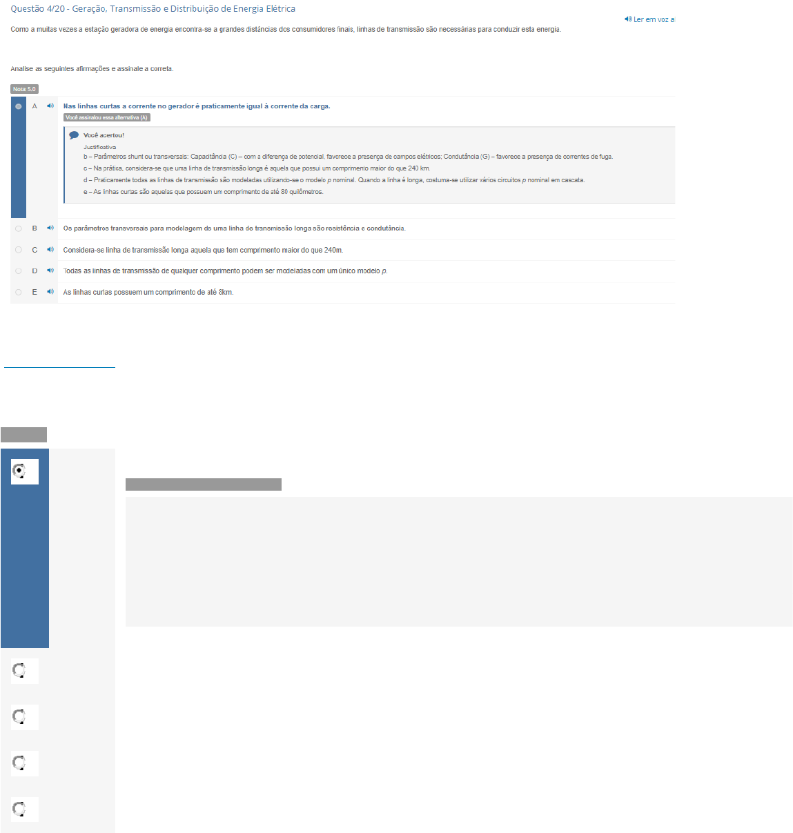 Questão 4/20 - Geração, Transmissão e Distribuição de Energia Elétrica Ler em voz alta Como a muitas vezes a estação geradora de energia encontra-se a grandes distâncias dos consumidores finais, linhas de transmissão são necessárias para conduzir esta energia. Analise as seguintes afirmações e assinale a correta. Nota: 5.0 A Nas linhas curtas a corrente no gerador é praticamente igual à corrente da carga. Você assinalou essa alternativa (A) Você acertou! Justificativa b – Parâmetros shunt ou transversais: Capacitância (C) – com a diferença de potencial, favorece a presença de campos elétricos; Condutância (G) – favorece a presença de correntes de fuga. c – Na prática, considera-se que uma linha de transmissão longa é aquela que possui um comprimento maior do que 240 km. d – Praticamente todas as linhas de transmissão são modeladas utilizando-se o modelo p nominal. Quando a linha é longa, costuma-se utilizar vários circuitos p nominal em cascata. e – As linhas curtas são aquelas que possuem um comprimento de até 80 quilômetros. B Os parâmetros transversais para modelagem de uma linha de transmissão longa são resistência e condutância. C Considera-se linha de transmissão longa aquela que tem comprimento maior do que 240m. D Todas as linhas de transmissão de qualquer comprimento podem ser modeladas com um único modelo p. E As linhas curtas possuem um comprimento de até 8km. image1.png image2.wmf image3.wmf