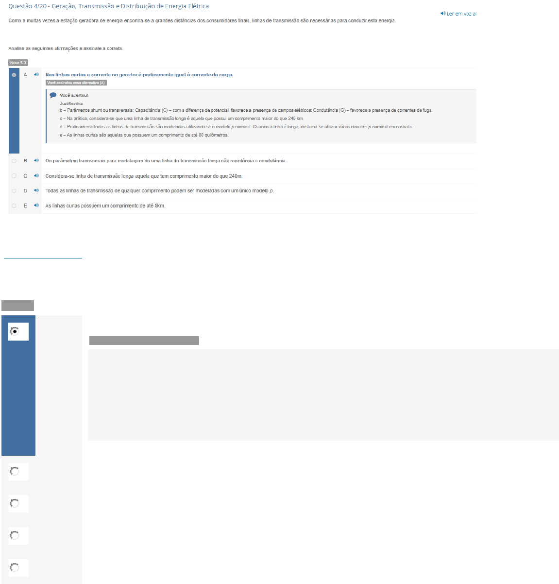 Questão 4/20 - Geração, Transmissão e Distribuição de Energia Elétrica Ler em voz alta Como a muitas vezes a estação geradora de energia encontra-se a grandes distâncias dos consumidores finais, linhas de transmissão são necessárias para conduzir esta energia. Analise as seguintes afirmações e assinale a correta. Nota: 5.0 A Nas linhas curtas a corrente no gerador é praticamente igual à corrente da carga. Você assinalou essa alternativa (A) Você acertou! Justificativa b – Parâmetros shunt ou transversais: Capacitância (C) – com a diferença de potencial, favorece a presença de c – Na prática, considera-se que uma linha de transmissão longa é aquela que possui um comprimento maior d d – Praticamente todas as linhas de transmissão são modeladas utilizando-se o modelo p nominal. Quando a li e – As linhas curtas são aquelas que possuem um comprimento de até 80 quilômetros. B Os parâmetros transversais para modelagem de uma linha de transmissão longa são resistência e cond C Considera-se linha de transmissão longa aquela que tem comprimento maior do que 240m. D Todas as linhas de transmissão de qualquer comprimento podem ser modeladas com um único model E As linhas curtas possuem um comprimento de até 8km. javascript:void(0)
