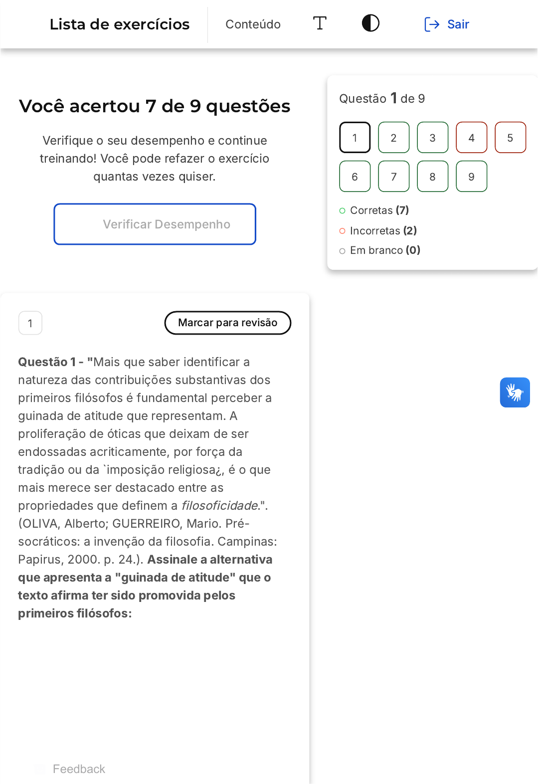 Você acertou 7 de 9 questões Verifique o seu desempenho e continue treinando! Você pode refazer o exercício quantas vezes quiser. Verificar Desempenho 1 Marcar para revisão Questão 1 - "Mais que saber identificar a natureza das contribuições substantivas dos primeiros filósofos é fundamental perceber a guinada de atitude que representam. A proliferação de óticas que deixam de ser endossadas acriticamente, por força da tradição ou da `imposição religiosa¿, é o que mais merece ser destacado entre as propriedades que definem a filosoficidade.". (OLIVA, Alberto; GUERREIRO, Mario. Pré- socráticos: a invenção da filosofia. Campinas: Papirus, 2000. p. 24.). Assinale a alternativa que apresenta a "guinada de atitude" que o texto afirma ter sido promovida pelos primeiros filósofos: Questão 1 de 9 Corretas (7) Incorretas (2) Em branco (0) 1 2 3 4 5 6 7 8 9 Lista de exercícios Conteúdo Sair Feedback A B C D E A análise crítica das ideias, imagens e posições, que podem ser modificadas ou reformuladas. A desconfiança na capacidade da razão em virtude da ¿proliferação de pontos de vista¿ conflitantes entre si. A aceitação sem crítica das explicações tradicionais relativas aos acontecimentos naturais. A busca por uma verdade única e não- questionável, que substituísse a verdade imposta pela religião A confiança na tradição e na autoridade religiosa como alicerces para o conhecimento verdadeiro. Resposta correta Parabéns, você selecionou a alternativa correta. Confira o gabarito comentado! Gabarito Comentado A análise crítica das ideias, imagens e posições, que podem ser modificadas ou reformuladas. O texto afirma que os primeiros filósofos promoveram uma guinada de atitude ao deixarem de endossar acriticamente as óticas tradicionais, por força da tradição ou da imposição religiosa. Isso significa que eles passaram a analisar criticamente as A B C D E ideias, imagens e posições, que podem ser modificadas ou reformuladas. 2 Marcar para revisão A Fenomenologia da Religião reflete sobre a experiência religiosa e o sagrado, a partir de um método analítico. É um conjunto de teorias, autores, conceitos, livros e textos que, unidos por semelhanças, procuraram pensar sobre a experiência religiosa e o sagrado. Apesar de estudar detalhadamente o fenômeno religioso, NÃO SE CLASSIFICA COMO: Doutrina Religiosa que busca estudar o fenômeno religioso Escola teórica que constrói classificações de formas religiosas. Escola teórica que busca as estruturas mais universais e profundas dos fenômenos religiosos. Orientação de natureza filosófica originada dos influxos do pensamento de Husserl. Método analítico que se baseia em uma explicação das formas religiosas mais essenciais. Resposta correta Parabéns, você selecionou a alternativa correta. Confira o A B gabarito comentado! Gabarito Comentado Apesar de estudar detalhadamente o fenômeno religioso, não é uma Doutrina Religiosa, mas uma escola teórica. ----- 3 Marcar para revisão Questão 3 - "Zeus ocupa o trono do universo. Agora o mundo está ordenado. Os deuses disputaram entre si, alguns triunfaram. Tudo o que havia de ruim no céu etéreo foi expulso, ou para a prisão do Tártaro ou para a Terra, entre os mortais. E os homens, o que acontece com eles? Quem são eles?". (VERNANT, Jean-Pierre. O universo, os deuses, os homens. São Paulo: Companhia das Letras, 2000. p. 56.). O texto acima é parte de um relato mítico. Tendo em vista que o mito pode ser considerado uma forma de conhecimento, assinale a alternativa correta. A verdade do mito segue a regras universais do pensamento racional, por exemplo, a lei de não-contradição. O mito busca explicações definitivas sobre o homem, a vida e o mundo, e sua verdade independe de provas e refutações. C D E O conhecimento mítico fundamenta-se em um rigoroso procedimento lógico- analítico para estabelecer suas verdades. As explicações míticas são construídas de maneira argumentativa e autocrítica, com o uso de cadeias causais lógicas. A verdade do mito obedece a critérios empíricos e científicos de comprovação das suas verdades internas. Resposta correta Parabéns, você selecionou a alternativa correta. Confira o gabarito comentado! Gabarito Comentado O mito busca explicações definitivas sobre o homem, a vida e o mundo, e sua verdade independe de provas e refutações. O mito é uma forma de conhecimento que busca explicações definitivas sobre o homem, a vida e o mundo. Sua verdade independe de provas e refutações, pois é baseada em crenças e valores que são aceitos pela comunidade que o produz. 4 Marcar para revisão Questão 2 - Um professor de história das Religiões, trouxe dois relatos sobre a criação do mundo e da vida: Relato 1 - Um relato do povo maia quiche (1000 A.C. América Central): "Admirável é o relato da época em que tudo foi formado no céu e na terra: o quarteamento de seus sinais, sua medida e alinhamento e estabelecimento de paralelas [...]. Vede! Tudo estava incerto, tudo era calma e silêncio; nada se movia, tudo era tranquilo, e imensos eram os céus. Vede! A primeira palavra e o primeiro diálogo. Ainda não existia o homem, nem o animal; não havia pássaros, nem barranco; não havia vegetação, nem charco; só o céu existia [...] Só havia imobilidade e silêncio na escuridão e na noite. Sozinhos estavam o Criador e o Autor [...]". (ELIADE, Mircea. O conhecimento sagrado de todas as eras. São Paulo: Editora Mercúrio, 1995, p. 69-70). Relato 2 - Um relato cristão do Livro do Gênesis (Bíblia Cristã) (900 A.C. Oriente Médio): "No princípio criou Deus os céus e a terra. E a terra era sem forma e vazia; e havia trevas sobre a face do abismo; e o Espírito de Deus se movia sobre a face das águas. E disse Deus: Haja luz; e houve luz. E viu Deus que era boa a luz; e fez Deus separação entre a luz e as trevas. E Deus chamou à luz Dia; e às trevas chamou Noite. [.