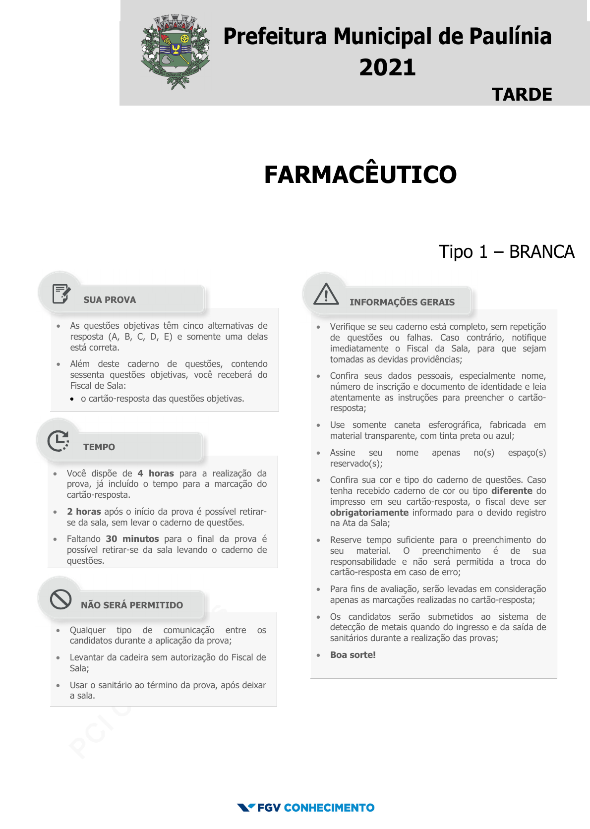 pcimarkpci MjgwNDoyNWFjOjAzMTM6YWQwMDowZDI4OjFkNzM6NmU1MjphOGQ2:U3VuLCAyMiBEZWMgMjAyNCAwMDoyNDowMyAtMDMwMA== www.pciconcursos.com.br Prefeitura Municipal de Paulínia 2021 TARDE FARMACÊUTICO Tipo 1 – BRANCA • As questões objetivas têm cinco alternativas de resposta (A, B, C, D, E) e somente uma delas está correta. • Além deste caderno de questões, contendo sessenta questões objetivas, você receberá do Fiscal de Sala: • o cartão-resposta das questões objetivas. • • Verifique se seu caderno está completo, sem repetição de questões ou falhas. Caso contrário, notifique imediatamente o Fiscal da Sala, para que sejam tomadas as devidas providências; • Confira seus dados pessoais, especialmente nome, número de inscrição e documento de identidade e leia atentamente as instruções para preencher o cartão- resposta; • Use somente caneta esferográfica, fabricada em material transparente, com tinta preta ou azul; • Assine seu nome apenas no(s) espaço(s) reservado(s); • Confira sua cor e tipo do caderno de questões. Caso tenha recebido caderno de cor ou tipo diferente do impresso em seu cartão-resposta, o fiscal deve ser obrigatoriamente informado para o devido registro na Ata da Sala; • Reserve tempo suficiente para o preenchimento do seu material. O preenchimento é de sua responsabilidade e não será permitida a troca do cartão-resposta em caso de erro; • Para fins de avaliação, serão levadas em consideração apenas as marcações realizadas no cartão-resposta; • Os candidatos serão submetidos ao sistema de detecção de metais quando do ingresso e da saída de sanitários durante a realização das provas; • Boa sorte! • Você dispõe de 4 horas para a realização da prova, já incluído o tempo para a marcação do cartão-resposta. • 2 horas após o início da prova é possível retirar- se da sala, sem levar o caderno de questões. • Faltando 30 minutos para o final da prova é possível retirar-se da sala levando o caderno de questões. • Qualquer tipo de comunicação entre os candidatos durante a aplicação da prova; • Levantar da cadeira sem autorização do Fiscal de Sala; • Usar o sanitário ao término da prova, após deixar a sala. SUA PROVA TEMPO NÃO SERÁ PERMITIDO INFORMAÇÕES GERAIS pcimarkpci MjgwNDoyNWFjOjAzMTM6YWQwMDowZDI4OjFkNzM6NmU1MjphOGQ2:U3VuLCAyMiBEZWMgMjAyNCAwMDoyNDowMyAtMDMwMA== www.pciconcursos.com.br pcimarkpci MjgwNDoyNWFjOjAzMTM6YWQwMDowZDI4OjFkNzM6NmU1MjphOGQ2:U3VuLCAyMiBEZWMgMjAyNCAwMDoyNDowMyAtMDMwMA== www.pciconcursos.com.br Concurso Público Paulínia 2021 FGV Conhecimento E2NS18 Farmacêutico Τ2 Tipo 1 – Cor BRANCA – Página 3 Língua Portuguesa 1 Analise a definição a seguir. Ópera é quando um sujeito recebe uma facada nas costas e, em vez de sangrar, canta. Essa definição não segue o modelo oficial de dar o significado do termo a ser definido, mas cita um exemplo de situação das óperas. Assinale a opção que apresenta a definição que segue o modelo acima. (A) A arte é a mais bela das mentiras. (B) A arte é a magia livre da mentira de ser verdade. (C) A pintura é poesia silenciosa. (D) A arte é o amarelo de Van Gogh. (E) A arte é a busca do inútil. 2 Em todas as frases abaixo temos, destacada, uma oração adjetiva. Assinale a opção que apresenta a proposta adequada de substituição de uma dessas orações. (A) Não há acaso no governo das coisas humanas, e a fortuna é apenas uma palavra que não tem sentido nenhum / insensível. (B) Não sei se as outras pessoas são como eu, mas logo que acordo gosto de desprezar os que dormem / dorminhocos. (C) O arqueiro que ultrapassa o alvo falha tanto como aquele que não o alcança / preciso. (D) Outrora os analfabetos eram os que não iam à escola; hoje são os que a frequentam / preguiçosos. (E) O barômetro é um instrumento engenhoso que indica o tempo que estamos tendo / ocioso. 3 Todas as frases abaixo estão ligadas ao mundo do futebol e nelas se destaca uma expressão popular. Assinale a opção em que a mudança proposta de substituição de uma dessas expressões por linguagem formal está adequada. (A) “O Mundial de Futebol é competição e competição é guilhotina. Quem perder, dança.” / está eliminado. (B) “Não me considero um jogador violento. O problema é que às vezes fico de cabeça quente e tenho reações inesperadas.” / preocupado. (C) “Para ser técnico num país de 150 milhões de técnicos, só mesmo tendo um saco de ouro.” / bom-humor. (D) “O futebol brasileiro virou a casa da mãe Joana.” / espaço de corrupção. (E) “Os jornalistas de esporte só têm 50 perguntas que fazem em quaisquer circunstâncias. O diabo é que, se você der oportunidade, eles fazem todas elas.” / interessante. 4 Em todos os pensamentos abaixo, o enunciador teve a preocupação de construir frases com paralelismo sintático. Assinale a opção que apresenta a frase em que essa preocupação acaba por gerar um erro gramatical. (A) Eu pego as lendas e as transformo em coisas comuns; Mozart pega as coisas comuns e as transforma em lendas. (B) Sucesso é conseguir o que você quer e felicidade é gostar do que você conseguiu. (C) As grandes épocas dizem: a arte. As épocas medíocres dizem: as artes. (D) A crítica é fácil e a arte é difícil. (E) Felicidade é alguém para amar, algo para fazer e algo para aspirar. 5 Nas opções a seguir aparecem adjetivos em sequência; assinale a frase em que essa sequência mostra uma intensificação no sentido dos adjetivos. (A) A mera preocupação gramatical só produz escritores entanguidos, enfezados, pesadões e desluzidos. (B) Autores são como gatos porque são quietos, amáveis e sábias criaturas, e os gatos se parecem com os autores pelas mesmas razões. (C) O avião é ainda o meio mais seguro, rápido, sofisticado e caro para se chegar atrasado a qualquer lugar. (D) Quantas bonitas, belas, lindas árvores deram sua vida para que o e