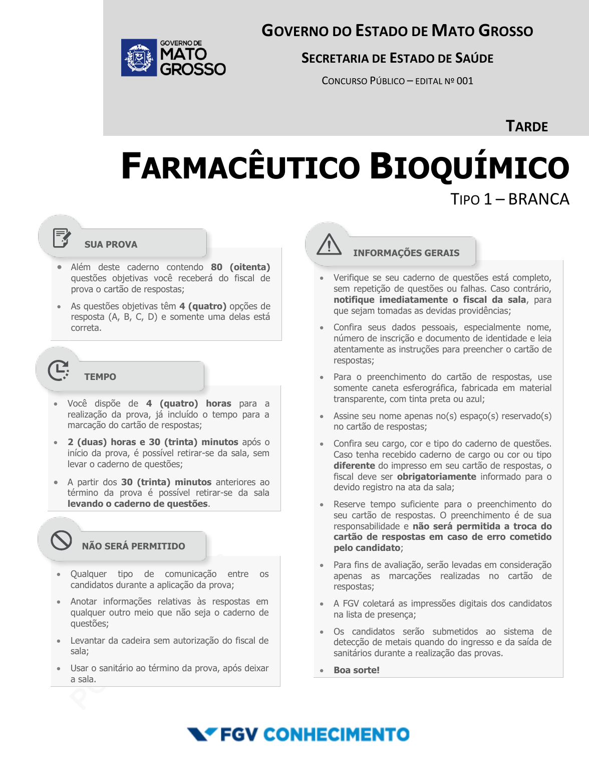 pcimarkpci MjgwNDoyNWFjOjAzMTM6YWQwMDowZDI4OjFkNzM6NmU1MjphOGQ2:U3VuLCAyMiBEZWMgMjAyNCAwMDoxMzo0MiAtMDMwMA== www.pciconcursos.com.br GOVERNO DO ESTADO DE MATO GROSSO SECRETARIA DE ESTADO DE SAÚDE CONCURSO PÚBLICO – EDITAL Nº 001 TARDE FARMACÊUTICO BIOQUÍMICO TIPO 1 – BRANCA Além deste caderno contendo 80 (oitenta) questões objetivas você receberá do fiscal de prova o cartão de respostas; As questões objetivas têm 4 (quatro) opções de resposta (A, B, C, D) e somente uma delas está correta. Verifique se seu caderno de questões está completo, sem repetição de questões ou falhas. Caso contrário, notifique imediatamente o fiscal da sala, para que sejam tomadas as devidas providências; Confira seus dados pessoais, especialmente nome, número de inscrição e documento de identidade e leia atentamente as instruções para preencher o cartão de respostas; Para o preenchimento do cartão de respostas, use somente caneta esferográfica, fabricada em material transparente, com tinta preta ou azul; Assine seu nome apenas no(s) espaço(s) reservado(s) no cartão de respostas; Confira seu cargo, cor e tipo do caderno de questões. Caso tenha recebido caderno de cargo ou cor ou tipo diferente do impresso em seu cartão de respostas, o fiscal deve ser obrigatoriamente informado para o devido registro na ata da sala; Reserve tempo suficiente para o preenchimento do seu cartão de respostas. O preenchimento é de sua responsabilidade e não será permitida a troca do cartão de respostas em caso de erro cometido pelo candidato; Para fins de avaliação, serão levadas em consideração apenas as marcações realizadas no cartão de respostas; A FGV coletará as impressões digitais dos candidatos na lista de presença; Os candidatos serão submetidos ao sistema de detecção de metais quando do ingresso e da saída de sanitários durante a realização das provas. Boa sorte! Você dispõe de 4 (quatro) horas para a realização da prova, já incluído o tempo para a marcação do cartão de respostas; 2 (duas) horas e 30 (trinta) minutos após o início da prova, é possível retirar-se da sala, sem levar o caderno de questões; A partir dos 30 (trinta) minutos anteriores ao término da prova é possível retirar-se da sala levando o caderno de questões. Qualquer tipo de comunicação entre os candidatos durante a aplicação da prova; Anotar informações relativas às respostas em qualquer outro meio que não seja o caderno de questões; Levantar da cadeira sem autorização do fiscal de sala; Usar o sanitário ao término da prova, após deixar a sala. SUA PROVA TEMPO NÃO SERÁ PERMITIDO INFORMAÇÕES GERAIS pcimarkpci MjgwNDoyNWFjOjAzMTM6YWQwMDowZDI4OjFkNzM6NmU1MjphOGQ2:U3VuLCAyMiBEZWMgMjAyNCAwMDoxMzo0MiAtMDMwMA== www.pciconcursos.com.br pcimarkpci MjgwNDoyNWFjOjAzMTM6YWQwMDowZDI4OjFkNzM6NmU1MjphOGQ2:U3VuLCAyMiBEZWMgMjAyNCAwMDoxMzo0MiAtMDMwMA== www.pciconcursos.com.br SECRETARIA DE ESTADO DE SAÚDE DO MATO GROSSO FGV CONHECIMENTO CNS318 - FARMACÊUTICO BIOQUÍMICO – TARDE TIPO BRANCA – PÁGINA 3 CONHECIMENTOS GERAIS Língua Portuguesa 1 Leia o texto a seguir. Os homens não estão cientes do calor que emana de seu coração, embora ele dê vida e movimento a todas as outras partes do seu corpo. [...] O mesmo se dá com a vaidade: ela é tão natural para o homem que ele não a percebe. E, embora seja isso que dê, por assim dizer, vida e movimento à maioria dos seus pensamentos e desígnios, isso ocorre de um modo que é imperceptível para o sujeito. [...] Os homens não percebem que é a vaidade que dá ímpeto à maioria de suas ações. A respeito do significado ou da estruturação desse fragmento, assinale a afirmativa inadequada. (A) O comentário inicial sobre o calor do coração serve de ponto de comparação para o papel da vaidade. (B) A semelhança entre o calor do coração e a vaidade é que ambos são imperceptíveis para os homens. (C) Ao indicar a vaidade como fonte da maioria das ações humanas, o autor do texto as desvaloriza. (D) O homem deve tornar a vaidade uma força consciente para o seu progresso. 2 Leia o texto a seguir. Em seu coração, os homens desejam ser estimados, mas eles cuidadosamente ocultam esse desejo porque querem se passar por virtuosos e porque o desejo de receber da virtude qualquer vantagem além dela mesma não seria ser virtuoso, mas amar a estima e o elogio – ou seja, ser vaidoso. Os homens são muito vaidosos, mas não há nada que eles mais detestem do que serem considerados vaidosos. Assinale a afirmativa adequada ao seu significado ou à sua estruturação. (A) A discussão no texto opõe a essência (os homens serem vaidosos) à aparência (quererem passar por virtuosos). (B) A vaidade humana só não é vista como um defeito porque os homens fazem questão de ocultá-la. (C) Os homens têm o desejo de serem estimados, ou seja, pretendem alcançar a estima e o elogio, sem serem motivados pela vaidade. (D) O fato de serem considerados vaidosos faz com que a imagem pública dos homens cresça ao olhar dos outros. 3 Assinale a opção que apresenta a frase em que os dois termos sublinhados não são antônimos. (A) Juízes implacáveis são todos aqueles que antes foram réus. (B) O homem não teria alcançado o possível se, repetidas vezes, não tivesse tentado o impossível. (C) Você não será nada se quiser ser tudo. (D) Só tenho por seguro o que é incerto. 4 Analise a frase a seguir. É claro que a justiça, sendo cega, não vê se é vista, e então não cora. (Machado de Assis) As opções a seguir apresentam formas de reescrever a frase acima sem modificação do seu sentido original, à exceção de uma. Assinale-a. (A) É claro que a justiça, sendo cega, não cora, já que não vê se é vista. (B) Sendo cega, é claro que a justiça não vê se é vista, e então não cora. (C) É claro que, sendo cega, a justiça não vê se é vista, e então não cora. (D) É claro que a justiça não vê se é vi