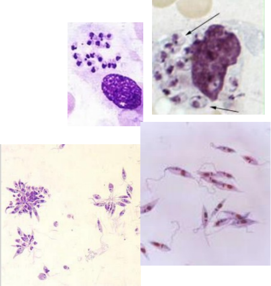 Parasitologia Valentina Radavelli Roman - LVII LEISHMANIOSE Agente etiológico: leishmania spp. · Doença negligenciada – ocorre em países mais vulneráveis · Duas formas: Tegumentar e visceral *causada por espécies diferentes · No brasil, maior prevalência da tegumentar no NORTE e da visceral no NORDESTE LEISHMANIA TEGUMENTAR AMERICANA · Acomete humanos e animais silvestres · Doença polimórfica e espectral da PELE E MUCOSAS · No Brasil, é comum no Norte · Diminuiu um pouco com o aumento ao acesso a saúde e melhores condições de vida · Mais comum na faixa etária de 20-34 anos maior exposição Em homens ASPECTOS BIOLÓGICOS · Gênero: leishmania Subgênero: Viannia ou Leishmania Mais comum Leishmania Viannia brasilienses Leishmania Viannia guyanensis Leishmania Leishmania amazonensis MORFOLOGIA · AMASTIGOTA ovóides ou esféricas Vacúolos no citoplasma Núcleo único em um dos polos com cinetoplasto próximo Sem flagelos Encontradas no interior de cél. Fagocitárias ou livres · PROMASTIGOTA alongadas Somente dentro do mosquito Flagelo livre ANTERIOR Cinetoplasto ANTERIOR Granulações no citoplasma e vacúolos Núcleo centralizado Estagio infeccioso · PARAMASTIGOTA – ovais ou arredondadas Cinetoplasto margeando o núcleo ou POSTERIOR a ele PEQUENO flagelo Encontrada aderida ao epitélio do intestino do vetor (flagelo – hemidesmossomos) CICLO BIOLÓGICO · Dois hospedeiros – invertebrado (vetor) e vertebrado (reservatório) · Vetores invertebrados: flebotomíneos Dipteria Lutzomyia intermedia, neivae, whitmani, wellcomei, pessoai, umbratilis, ubiquitalis Há muitas espécies vetores = mais dispersão Características: cabeça formando ângulo de 90 graus com o tórax Asas lanceoladas, corpo coberto por pelos finos Peça bucal picador pungitivo Criadouros – solo úmido, detritos ricos em matéria org, água · Hospedeiros vertebrados – reservatórios: mamíferos Grande diversidade de reservatórios também = mais dispersão 1. Mosquito lutzmania infectada injeta PROMASTIGOTO no humano 2. Promastigotas são fagocitados por macrófagos (4-8hrs) e aqui dentro delas se transformam em AMASTIGOTA que resiste ao lisossomos BIPARTIÇÃO 3. AMASTIGOTAS multiplicam até romper a membrana do macrófago e infectam outras Aqui a infecção torna-se sintomática 4. Flebotomíneos se infectam ingerindo células infectadas ao se alimentarem 5. NO VETOR amastigota se transforma em PROMASTIGOTA 6. Promastigotas sofrem divisão binária e desenvolvem-se em PARAMASTIGOTAS Isso ocorre no intestino posterior para leishmania viannia Intestino médio para leishmania leishmania 7. Promastigotas migram para Probóscide promastigotas PATOGENIA · Período de incubação 2 semanas a 3 meses · Lesões iniciais regridem espontaneamente OU permanecem estacionárias OU evolui para histiocitoma, tuberculóide e úlcera leishmaniótica · MANIFESTAÇÕES CLÍNICAS · CUTÂNEA – úlcera únicas ou múltiplas na epiderme e derme Úlceras leishmanióticas, verrucosas ou framboesiformes Cutâneo-disseminada é uma variação relacionada a pacientes imunossuprimidos · CUTÂNEO-MUCOSA – leishmania brasilienses Lesões em mucosas e cartilagens Afeta nariz, faringe, boca e laringe Eritema, infiltrado inflamatório, coriza, processo ulcerativo · CUTÂNEA DIFUSA – L. amazonensis Lesões difusas não ulceradas por toda a pele Associada a imunossuprimidos PROFILAXIA · Controle com inseticidas apenas em áreas de surto · Mosquiteiro, repelente · Limpeza de quintais e terrenos · Casas com distância mínima de 500m de florestas (vetor tem baixa capacidade de voo) DIAGNÓSTICO · Clínico pela característica da lesão e histórico (residência/contato com região endêmica) · Laboratorial com pesquisa do parasito Esfregaços (lesões iniciais há amastigotas na região) Histopatológico PCR Metódos imunológicos para avaliar resposta celular (Teste de Montenegro – com inoculação do antígeno, se + há reação inflamatória no local com formação de nódulo RIFI, ELISA TRATAMENTO · Antimoniais pentavalentes – Antimoniato de N-metilglucamina- Glucantime® Estibugluconato de sódio - Pentostan® · Isotianato de pentamidina e Anfotericina B para cardíacos e gravidas LEISHMANIOSE VISCERAL OU CALAZAR · Crônica, grave e de alta letalidade · Mais comum no nordeste · Mais prevalente entre 35 a 50 anos e em crianças · É mais letal por afetar órgãos e vem aumentando o número de casos pois há mais pessoas sem imunidade ASPECTOS BIOLÓGICOS · Leishmania Leishmania infantum chagasi Leishmania Leishmania donovani · Vetor (hospedeiro invertebrado) – lutzomyia longipalpis Apenas 1 vetor = dificulta disseminação · Hospedeiro vertebrado – cães e raposas Apenas 2 = dificulta disseminação TRANSMISSÃO · Pelo vetor · Acidentes de lab · Transfusão sanguínea · Uso de drogas injetáveis · Congênita e venéreas · Aumenta após períodos de chuva, pois aumenta o número de flebotomíneos PATOGENIA Ciclo biológico é igual · A pele é a porta de entrada, a picada do mosquito atrai células fagocitarias no local · Há reação inflamatória local e formação de nódulo · Dissemina pelo sangue e linfa (amastigotas) · Afeta principalmente tecidos esplênico, hepático, sanguíneo, pulmonar e renal · Período de incubação de 2-7 meses depende da virulência, carac genética do hospedeiro e estado nutricional-imunológico · Difícil diagnosticar · ASSINTOMATICO – áreas endêmicas · OLOIGOSSINTOMÁTICA OU SUBCLINICA – febre BAIXA, tosse seca, sudorese · AGUDA – febre ALTA, tosse seca, sudorese · CRONICA – esplenomegalia e hepatomegalia PROFILAXIA Tratamento de casos de humanos infectados Diagnostico e tratamento de cães infectados Vacinação de cães Uso de coleira repelente Combate ao vetor image4.png image5.png image6.png image7.png image8.png image9.png image1.png image2.png image3.png