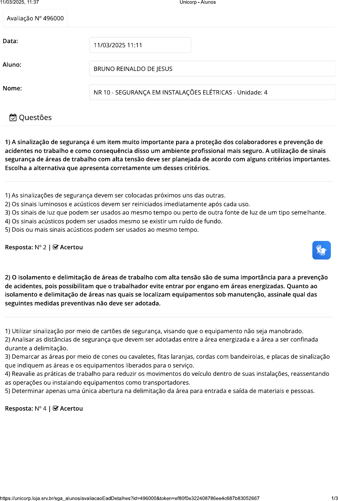 11/03/2025, 11:37 Unicorp Alunos Avaliação N° 496000 Data: 11/03/2025 11:11 Aluno: BRUNO REINALDO DE JESUS Nome: NR 10 SEGURANÇA EM INSTALAÇÕES ELÉTRICAS Unidade 4 Questões 1) A sinalização de segurança é um item muito importante para a proteção dos colaboradores e prevenção de acidentes no trabalho e como consequência disso um ambiente profissional mais seguro. A utilização de sinais segurança de áreas de trabalho com alta tensão deve ser planejada de acordo com alguns critérios importantes. Escolha a alternativa que apresenta corretamente um desses critérios. 1) As sinalizações de segurança devem ser colocadas próximos uns das outras. 2) Os sinais luminosos e acústicos devem ser reiniciados imediatamente após cada uso. 3) Os sinais de luz que podem ser usados ao mesmo tempo ou perto de outra fonte de luz de um tipo semelhante. 4) Os sinais acústicos podem ser usados mesmo se existir um ruído de fundo. 5) Dois ou mais sinais acústicos podem ser usados ao mesmo tempo. Resposta: N° 2 Acertou 2) o isolamento e delimitação de áreas de trabalho com alta tensão são de suma importância para a prevenção de acidentes, pois possibilitam que o trabalhador evite entrar por engano em áreas energizadas. Quanto ao isolamento e delimitação de áreas nas quais se localizam equipamentos sob manutenção, assinale qual das seguintes medidas preventivas não deve ser adotada. 1) Utilizar sinalização por meio de cartões de segurança, visando que o equipamento não seja manobrado. 2) Analisar as distâncias de segurança que devem ser adotadas entre a área energizada e a área a ser confinada durante a delimitação. 3) Demarcar as áreas por meio de cones ou cavaletes, fitas laranjas, cordas com bandeirolas, e placas de sinalização que indiquem as áreas e os equipamentos liberados para o serviço. 4) Reavalie as práticas de trabalho para reduzir os movimentos do veículo dentro de suas instalações, reassentando as operações ou instalando equipamentos como transportadores. 5) Determinar apenas uma única abertura na delimitação da área para entrada e saída de materiais e pessoas. Resposta: N° 4 Acertou 1/311/03/2025, 11:37 Unicorp Alunos 3) Os primeiros socorros referem-se ao atendimento de emergência ou imediato que deve ser fornecido quando uma pessoa está ferida ou doente, até que o tratamento médico completo esteja disponível. Ao se deparar com uma cena de acidente envolvendo vítimas, o agente deverá priorizar, durante as ações de primeiros socorros, os sinais vitais com base na observação das seguintes alterações: 1) Dilatação da pupila, perda dos sentidos (ausência de consciência), palidez, sudorese inferior. 2) Lesão na pele, hemorragia, sangramento periférico, perda dos sentidos (audição e tato). 3) Sangramento periférico, respiração ofegante, falta de circulação (pulso ausente), cefaleia sinalizador STRIB, fita condutora e banqueta. 4) Existência de hemorragias, identificação da vítima (documentos pessoais), circulação. 5) Falta de respiração, falta de circulação (pulso ausente), hemorragia abundante; perda dos sentidos (ausência de consciência). Resposta: N° 4 Errou Alternativa Correta: 4) As normas de segurança de uma empresa devem ser muito bem explicadas para todos os colaboradores, visando que todos eles estejam seguros durante suas atividades, tendo em vista as zonas de perigo das máquinas e equipamentos. No que diz respeito aos aspectos de segurança, são requerimentos gerais, durante o de máquinas e equipamento elétricos em instalações de alta tensão: 1) Os dispositivos de acionamento e parada das máquinas devem oferecer acesso apenas a seu operador. 2) As zonas de perigo das máquinas e equipamentos devem estar sob vigilância automática, ou seja, monitorado, de acordo com a categoria de segurança requerida, sendo esse requisito aplicado a dispositivos de segurança exclusivamente mecânicos. 3) Os dispositivos de acionamento das máquinas devem apresentar dispositivos automáticos de funcionamen 4) Deve-se paralisar os movimentos perigosos e demais riscos só quando ocorrerem falhas ou situações anormais de trabalho. 5) As zonas de perigo das máquinas e equipamentos devem estar sob a responsabilidade técnica de profissional legalmente habilitado. Resposta: N° 3 x Errou Alternativa Correta: N° 2 2/311/03/2025, 11:37 Unicorp Alunos 5) Uma pessoa que não está autorizada a realizar uma tarefa específica deve realizá-la apenas quando estiver sob o nível apropriado de supervisão de uma pessoa autorizada a realizar a função. o nível e o padrão de controle exercido sobre uma pessoa que não possui a autorização necessária devem ser identificados por meio de avaliação de risco e podem ser classificados. Assinale a alternativa correta. 1) Supervisão direta é o trabalho preventivo com o objetivo de entender os processos e o ambiente de controle das instituições. É feito por meio de instrumentos como aplicação de questionários com foco nos negócios e visitas para verificação in loco de assuntos específicos, quando necessário. 2) Supervisão geral é uma situação na qual o trabalhador supervisor não está constantemente revisando o trabalhador não autorizado, mas permanece em contato face a face frequente durante a tarefa para confirmar que eles estão trabalhando dentro dos requisitos necessários. 3) Supervisão ampla inclui supervisão dedicada de todas as atividades realizadas durante a supervisão direta com o trabalhador de supervisão permanecendo em contato visual e audível direto em todos os momentos. 4) Supervisão direta só é adequada para trabalhadores que já demonstraram habilidade para realizar trabalho autônomo. Nessa situação, o trabalhador supervisor precisa apenas fazer contato cara a cara ocasional, mas deve continuar a fornecer instruções. 5) Supervisão ampla é o monitoramento contínuo por meio de instrumentos como anális