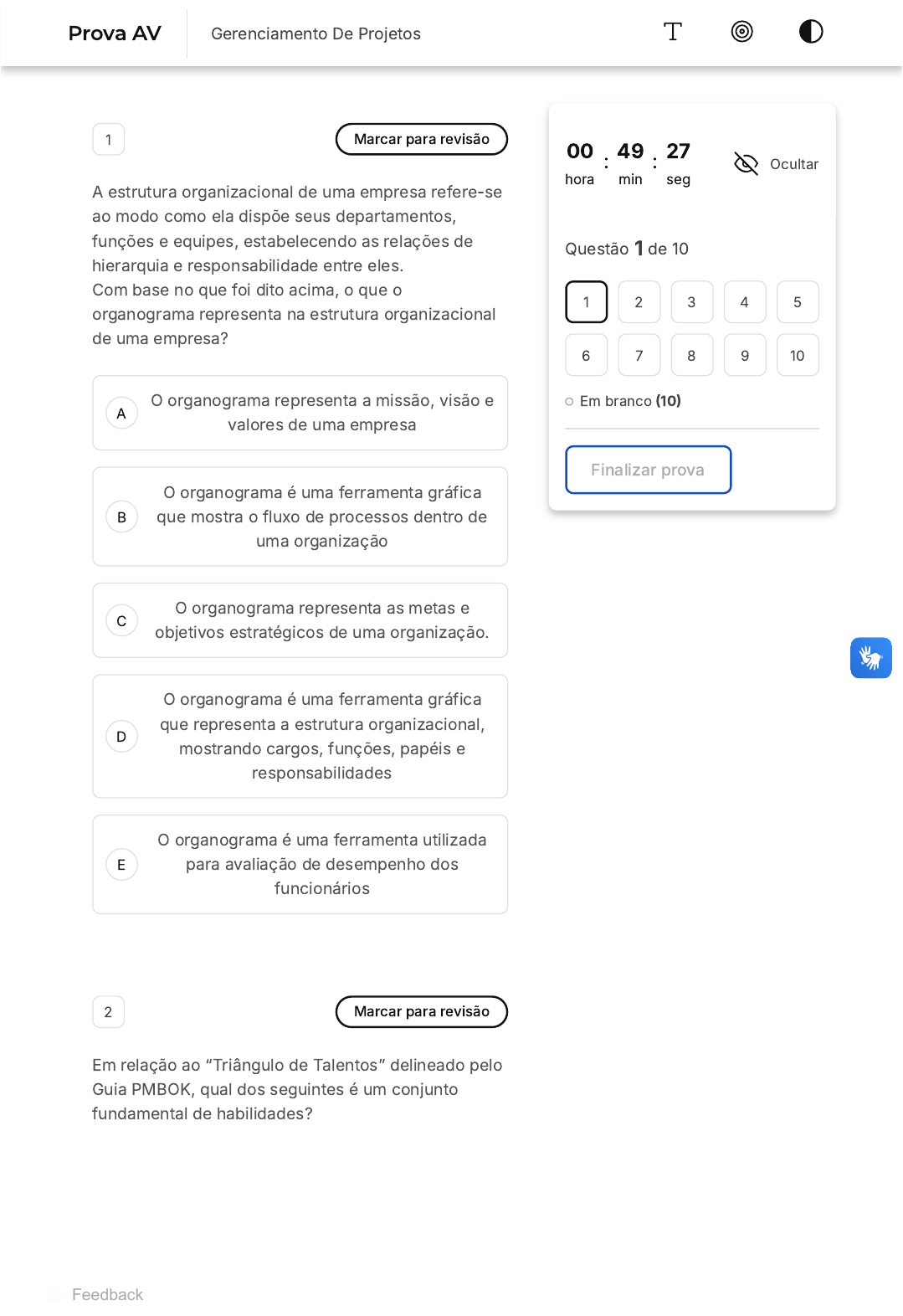 A B C D E 1 Marcar para revisão A estrutura organizacional de uma empresa refere-se ao modo como ela dispõe seus departamentos, funções e equipes, estabelecendo as relações de hierarquia e responsabilidade entre eles. Com base no que foi dito acima, o que o organograma representa na estrutura organizacional de uma empresa? O organograma representa a missão, visão e valores de uma empresa O organograma é uma ferramenta gráfica que mostra o fluxo de processos dentro de uma organização O organograma representa as metas e objetivos estratégicos de uma organização. O organograma é uma ferramenta gráfica que representa a estrutura organizacional, mostrando cargos, funções, papéis e responsabilidades O organograma é uma ferramenta utilizada para avaliação de desempenho dos funcionários 2 Marcar para revisão Em relação ao “Triângulo de Talentos” delineado pelo Guia PMBOK, qual dos seguintes é um conjunto fundamental de habilidades? 00 hora : 49 min : 27 seg Ocultar Questão 1 de 10 Em branco (10) Finalizar prova 1 2 3 4 5 6 7 8 9 10 Prova AV Gerenciamento De Projetos Feedback A B C D E A B C Conhecimento em automação e robótica Conhecimento, habilidades e comportamentos relativos a domínios específicos de Gerenciamento de Projetos, programas e portfólios Experiência em gestão financeira e orçamentária Capacidade de implementar processos de TI e segurança Habilidades avançadas em linguagens de programação 3 Marcar para revisão Em um projeto de construção de um edifício residencial, a gestão do cronograma é fundamental para garantir o cumprimento dos prazos estabelecidos, evitando atrasos e possíveis prejuízos. Sobre a gestão do cronograma em um projeto, analise as afirmativas abaixo. I - É preciso definir as atividades necessárias e sua sequência correta. II - Deve-se realizar uma estimativa de recursos necessários para cada atividade. III - É possível ignorar desvios de cronograma, uma vez que não afetam diretamente o resultado final. Marque a alternativa que apresenta a(s) afirmativa(s) correta(s). As afirmativas I, II e III estão corretas. Apenas as afirmativas I e III estão corretas. Apenas as afirmativas I e II estão corretas. D E A B C D E Apenas as afirmativas II e III estão corretas. Apenas a afirmativa I está correta. 4 Marcar para revisão Qual das seguintes afirmativas estão relacionadas ao comportamento eficaz para um alto desempenho da equipe de projeto? Deixar que os conflitos da equipe de projetos se resolvam por si só. Criar oportunidades para desenvolvimento das equipes. Criar um ambiente em que todos trabalhem e não se relacionem no horário de trabalho. Fazer comunicações sucintas e sem muita relevância. Tomar decisões autocráticas sem ouvir a equipe de projetos. 5 Marcar para revisão Determinado projeto tem uma atividade que consiste em colocar os móveis em um novo escritório. Esta atividade depende da pintura das paredes e desse modo a colocação dos móveis é uma atividade sucessora à pintura das paredes, no diagrama de rede do projeto. Ocorre, porém, que os móveis somente poderão ser colocados depois que a tinta das paredes esteja completamente seca, o que ocorrerá três dias após o término da atividade de pintura das paredes. Que modificação no relacionamento lógico está ocorrendo neste caso? A B C D E A B C D E Antecipação ou avanço, visando adiantar a atividade predecessora Atraso, visando retardar a atividade sucessora Flutuação Folga Gold plating 6 Marcar para revisão O que são informações restritas? São informações que somente podem ser acessadas dentro da organização. São informações acessadas apenas por alguns fornecedores da organização. São informações que não precisam ser protegidas. São informações que são destinadas a um grupo específico dentro da organização. São informações que são divulgadas nas mídias (TV e Internet). 7 Marcar para revisão Quando falamos do processo de Lições Aprendidas, é correto dizer que: A B C D E A B C Por se tratar de algo que precisa reunir tudo o que foi aprendido ao longo do Projeto, é importante que as Lições sejam coletadas apenas quando houver certeza de que houve a conclusão do Projeto. Quando falamos em Lição Aprendida, devemos tratar unicamente dos Problemas ocorridos seguindo-se uma reflexão sobre como faremos diferente para que não volte a ocorrer em novos Projetos. As Lições devem ser registradas a partir da assinatura do Contrato, pois é deste momento em diante que os problemas começam a ocorrer. As Lições Aprendidas devem ser registradas ao longo do desenvolvimento do Projeto. O Processo de Lições Aprendidas deve ter a participação exclusiva do pessoal que trabalha na área da qualidade da empresa, pois são eles que têm contato com as não conformidades. 8 Marcar para revisão Selecione o item abaixo que representa uma prática de melhoria contínua do código minimizando problemas como, por exemplo, duplicidade de código. Jogo de Planejamento Ritmo sustentável Refatoração D E A B C D E Metáforas Pequenas entregas 9 Marcar para revisão Na área da Qualidade, há diversas ferramentas e técnicas utilizadas para comparação, gerar sugestões, investigar causas de problemas e outras aplicações. Com base no que foi apresentado, é correto dizer que: A Folha de Verificação é utilizada para apoiar a verificação de modo estruturado, garantindo assim que nada foi esquecido. O Diagrama 5W1H que utiliza uma planilha onde devemos responder: O que? / Por que? / Quem / Onde / Quando e Como é utilizado para identificar as causas raízes dos problemas. Por meio do Diagrama de Pareto consigo identificar as causas raízes pois decomponho em causas primárias, secundárias e terciárias. O Diagrama de Causa e Efeito, também conhecido como Diagrama de Espinha de Peixe, objetiva determinar as causas reais de um efeito a partir da análise das causas de diversas categorias. O D