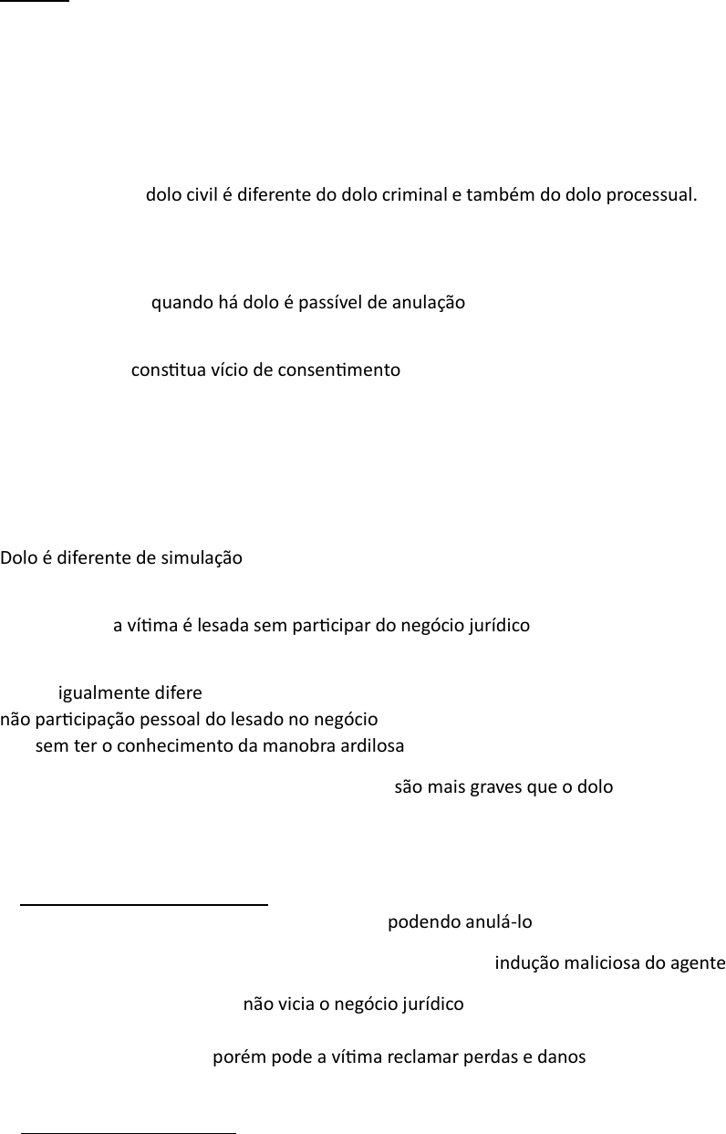 Módulo 4 - Defeito dos Negócios Jurídicos - 2ª parte 3 - Dolo Dolo é o artifício utilizado para induzir alguém à prática de um ato que lhe é prejudicial, o qual interessa ao agente/autor do dolo ou terceiro. Enquanto o erro é espontâneo, sendo que a vítima se engana sozinha, o dolo é provocado intencionalmente pelo agente, visando objetivamente causar prejuízo, levando a outra parte a se equivocar. Ressalta-se que o dolo civil é diferente do dolo criminal e também do dolo processual. Em regra, tanto no erro quanto no dolo, há uma ilusão da vítima, sendo que no primeiro ela se engana sozinha, e na segunda ela é levada ao equívoco pelo agente do dolo. O negócio jurídico quando há dolo é passível de anulação, podendo inclusive levar o autor do dolo a indenizar os prejuízos sofridos pela vítima. Para que o dolo constitua vício de consentimento é necessário: (i) que haja intenção de induzir o declarante a realizar o negócio jurídico; (ii) que os artifícios sejam graves; (iii) que estes sejam a causa determinante da declaração de vontade; (iv) que procedam do outro contratante, ou sejam deste conhecido, se procedentes de terceiro; (v) que haja prejuízo econômico ou moral da vítima. 3.1 Dolo x simulação x fraude Dolo é diferente de simulação: no primeiro, a vítima participa diretamente do negócio, mas somente o autor do dolo conhece o artifício utilizado e age de má-fé. Na simulação a vítima é lesada sem participar do negócio jurídico. As partes fingem ou simulam uma situação com o intuito de fraudar a lei ou prejudicar terceiros. O dolo igualmente difere da fraude. A fraude, assim como na simulação, caracteriza-se pela não participação pessoal do lesado no negócio. No dolo, o lesado participa da realização do ato, sem ter o conhecimento da manobra ardilosa do autor do dolo. A fraude e simulação, do ponto de vista jurídico, são mais graves que o dolo, que apenas gera a anulabilidade do negócio, enquanto as demais podem gerar a nulidade (art. 167 CC). 3.2 Espécies a) Dolo principal e dolo acidental: somente o dolo principal, como causa determinante da declaração de vontade, vicia o negócio jurídico, podendo anulá-lo (art. 145 CC). Isto porque o negócio jurídico só é realizado porque houve a indução maliciosa do agente. O dolo acidental (art. 146 CC) não vicia o negócio jurídico, pois este seria realizado independentemente da malícia empregada pelo agente, mas de forma diversa. Não é causa de anulabilidade do negócio, porém pode a vítima reclamar perdas e danos. Ex: compra de imóvel por valor superior ao que vale. b) Dolus bônus e dolus malus Wilian souto Sublinhado Wilian souto Sublinhado Wilian souto Sublinhado Wilian souto Sublinhado Wilian souto Realce Wilian souto Sublinhado Wilian souto Realce Wilian souto Sublinhado Wilian souto Realce Wilian souto Realce Wilian souto Realce Wilian souto Realce Wilian souto Realce Wilian souto Realce Wilian souto Realce Wilian souto Sublinhado Wilian souto Sublinhado Wilian souto Realce Wilian souto Realce Wilian souto Realce Wilian souto Sublinhado Wilian souto Realce Dolus bonus é o dolo tolerável, de pouca gravidade, não apto a viciar a declaração de vontade. Ex: o comerciante que exagera quanto aos atributos de um produto, para que a venda se efetive. Não torna anulável o negócio jurídico. Dolus malus é aquele que tem gravidade, exercido com a intenção de ludibriar e de prejudicar. Este pode ser anulado, pois consiste em vício de consentimento. Pode até mesmo haver obrigação de indenizar perdas e danos. c) Dolo positivo ou comissivo e dolo negativo ou omissivo: o dolo pode ser exercido através de ações maliciosas ou em comportamentos omissivos (art. 147 CC). Frise-se que o Código Civil pátrio equipara omissão dolosa à ação dolosa, em ambas podendo ser anulado o negócio jurídico. d) Dolo de terceiro: é aquele proveniente de terceira pessoa, estranha ao negócio (art. 148 CC). A parte a quem aproveita deve ter conhecimento para que o negócio seja anulável. Pode haver obrigação de indenizar a vítima, por parte do terceiro que ludibriou. e) Dolo do representante: o representante de uma das partes não é terceiro, pois ele atua em nome do representado. O art. 149 CC estabelece tratamentos diferentes ao dolo do representante: se for representação legal, o representado ficará obrigado a responder civilmente até a importância do proveito que auferiu. Se a representação for convencional, a responsabilidade do representado será solidária. f) Dolo bilateral: é o dolo de ambas as partes. O art. 150 CC dispõe que se houve dolo de ambas as partes, nenhuma dela poderá invocá-lo para anular o negócio jurídico, ou pedir indenização. g) Dolo de aproveitamento: ocorre quando alguém se aproveita da situação de necessidade ou da inexperiência do outro pra obter lucro ou vantagem, desproporcional a natureza do negócio (art. 157 CC). 4 - Estado de Perigo Considera-se estado de perigo a situação de extrema necessidade que faz com que alguém celebre negócio jurídico em que assume obrigação desproporcional e excessiva. A anulabilidade do negócio jurídico efetuado em estado de perigo se justifica por diversos dispositivos do CC, como o que prevê a boa-fé objetiva e a função social dos contratos. 4.1 – Elementos do estado de perigo a) situação de necessidade: necessidade de salvar-se ou a pessoa de sua família b) iminência de dano atual e grave: capaz de incutir à vítima o temor de que, se não praticar tal ato, consequências ocorrerão. A gravidade do dano será avaliada objetivamente pelo juiz, ou seja, de acordo com o caso concreto. c) Nexo de causalidade entre a declaração e o perigo de grave dano: basta que o declarante pense estar em perigo, e tal suposição dever ser de conhecimento da outra parte. d) incidência da ameaça do dano sobre a pessoa ou sua família: dano pode ser físico ou moral. Ar