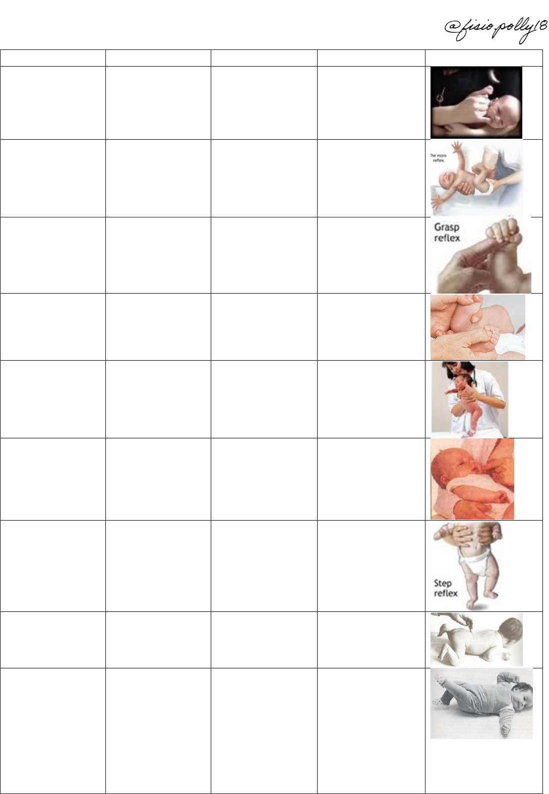 Reflexos Primitivos Reflexo Idade Estimulo Resposta Imagem Reflexo de sucção. 0 a 5 meses Toca o lábios e a parte interna da boca. Movimentos rítmicos, língua em cânula, movimentos, ondulatórios. Reflexo de moro. 0 a 5 meses É desencadeado por queda súbita da cabeça, amparada pela mão do examinador. extensão e abdução dos membros superiores seguida por choro. Reflexo de pressão palmar. 0 a 4/5 meses É desencadeado pela pressão da palma da mão. Observa-se flexão dos dedos. Reflexo de pressão plantar. É desencadeado pela pressão da base dos artelhos. Observa-se flexão dos dedos. Reflexo de apoio positivo. 0 a 2 meses Apoio o calcanhar em superfície plana e rígida. Extensão dos MMII. Reflexo de busca. 0 a 3 meses Tocar a região perioral quando o bebe está com forme. Virar a cabeça e os lábios na direção do estimulo. Reflexo da marcha automática. 0 a 4 meses É desencadeado por inclinação do tronco do RN após obtenção do apoio plantar. Observa-se cruzamento das pernas, uma à frente da outra . Reflexo de galant. 0 a 3 meses É desencadeado por estímulo tátil na região dorso lateral. Observa-se encurvamento do tronco ipsilateral ao estímulo. RTCA – Reflexo tônico cervical simétrico. 0 a 5 meses Rotação da cabeça. Observa-se extensão do MMSS ipsilateral à rotação e flexão do MMSS contralateral. A resposta dos MMII obedece ao mesmo padrão, mas é mais sutil. Reflexos Primitivos Reflexo de fuga e asfixia. 0 a 3 meses Criança em decúbito ventral no leito, com a face voltada para o colchão. Vira o rosto liberando as vias aéreas para respirar adequadamente. Reflexo cutâneo plantar. Após 2 anos e patológico. Estimulo na plantar do pé a partir do calcâneo nos sentidos dos artelhos. Extensão do halux e abertura dos dedos formando um leque. Reflexo tônico cervical assimétrico 0 a 4 meses criança em decúbito ventral, ligeiramente suspensa pelo abdome, flexão ou extensão passiva ou ativa da cabeça. flexão dos MMSS e extensão dos membros inferiores para extensão: extensão dos MMII e flexão dos inferiores. Reação cervical de retificação. 0 a 6 meses Criança em decúbito dorsal com braços e pernas estendidas, Rotação ativa ou passiva da cabeça. rotação “em bloco” do tronco. Reflexo tônico labiríntico. 0 a 4 meses Criança em decúbito dorsal e ventral Própria postura. Dorsal: Aumento do Tônus extensor. Ventral: Aumento do Tônus flexor. Reflexo de landau. Criança em suspensão ventral, extensão passiva ou ativa da cabeça. desencadeamento do tônus extensor, havendo extensão de tronco, quadril, MMSS e inferiores. Referencia: Olhweiler, Lygia, Silva, Alexandre Rodrigues da e Rotta, Newra TellecheaEstudo dos reflexos primitivos em pacientes recém-nascidos pré-termo normais no primeiro ano de vida. Arquivos de Neuro-Psiquiatria [online]. 2005, v. 63, n. 2a, pp. 294-297. Damasceno, Alfredo et al. Reflexos primitivos e função cognitiva. Arquivos de Neuro-Psiquiatria [online]. 2005, v. 63, n. 3a, pp. 577-582. Zampieri, Livia Marcello. Desenvolvimento Motor e Reflexos Primitivos. Disponível em: https://edisciplinas.usp.br/pluginfile.php/355900/mod_resource/content/1/Aula%20DNM%202015.pdf. https://edisciplinas.usp.br/pluginfile.php/355900/mod_resource/content/1/Aula%20DNM%202015.pdf