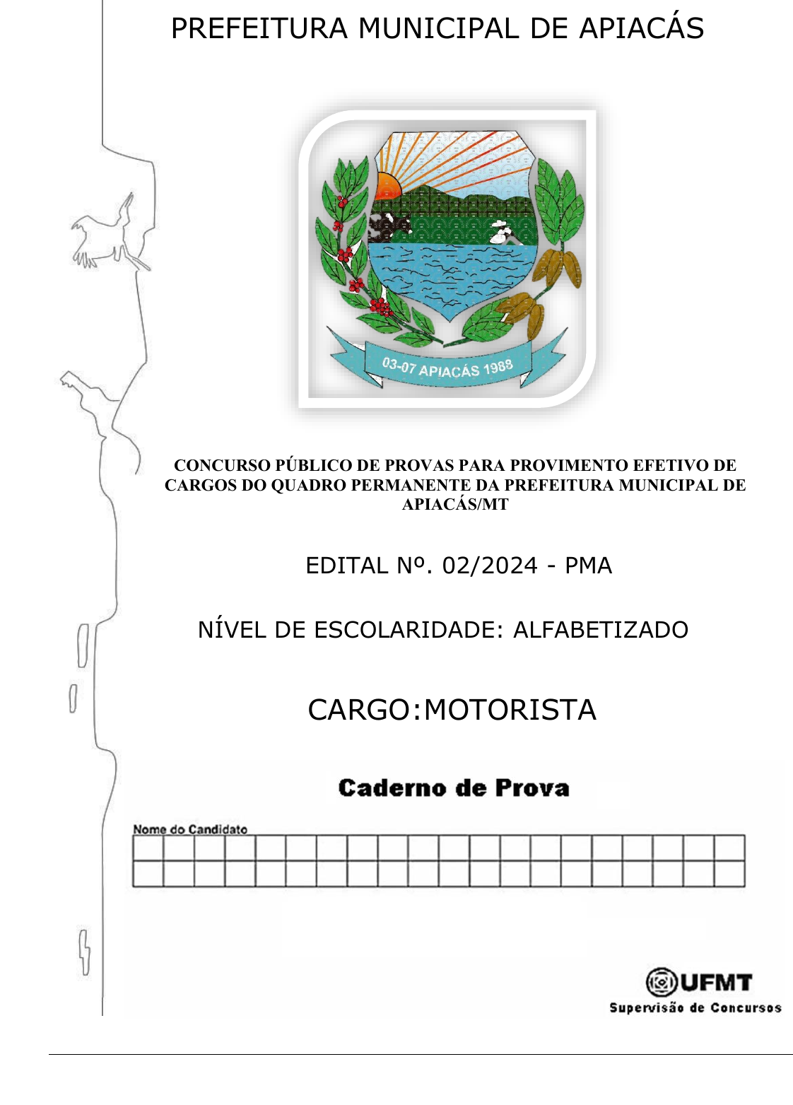 pcimarkpci MDAwMDowMDAwOjAwMDA6MDAwMDowMDAwOmZmZmY6YjExZTo4Nzgz:VHVlLCAxMSBNYXIgMjAyNSAxNzo1MToyNSAtMDMwMA== www.pciconcursos.com.br PREFEITURA MUNICIPAL DE APIACÁS EDITAL Nº. 02/2024 - PMA CARGO:MOTORISTA CONCURSO PÚBLICO DE PROVAS PARA PROVIMENTO EFETIVO DE CARGOS DO QUADRO PERMANENTE DA PREFEITURA MUNICIPAL DE APIACÁS/MT NÍVEL DE ESCOLARIDADE: ALFABETIZADO pcimarkpci MDAwMDowMDAwOjAwMDA6MDAwMDowMDAwOmZmZmY6YjExZTo4Nzgz:VHVlLCAxMSBNYXIgMjAyNSAxNzo1MToyNSAtMDMwMA== www.pciconcursos.com.br I N S T R U Ç Õ E S LEIA COM ATENÇÃO 1. Este Caderno de Prova, com páginas numeradas de 1 a 11, é constituído de 30 (trinta) questões objetivas, cada uma com 4 (quatro) alternativas, assim distribuídas: 01 a 10 – Língua Portuguesa 11 a 15 – Informática Básica 16 a 20 – Legislação Básica 21 a 30 – Conhecimentos Específicos 2. Caso o Caderno de Prova esteja incompleto ou tenha qualquer defeito de impressão, solicite ao fiscal que o substitua. 3. Sobre a Marcação do Cartão de Respostas As respostas deverão ser, obrigatoriamente, transcritas com caneta esferográfica de tinta azul ou preta não porosa, fabricada em material transparente, para o Cartão de Respostas, que será o único documento válido para correção. Não haverá substituição do Cartão de Respostas por erro do candidato. 3.1. Para cada questão existe apenas uma alternativa que a responde acertadamente. Para a marcação da alternativa escolhida no CARTÃO DE RESPOSTAS, pinte completamente o círculo correspondente. Exemplo: Suponha que para determinada questão a alternativa C seja a escolhida. Nº da Questão A B C D 3.2. Marque apenas uma alternativa para cada questão. 3.3. Será invalidada a questão em que houver mais de uma marcação, marcação rasurada ou emendada, ou não houver marcação. 3.4. Não rasure nem amasse o CARTÃO DE RESPOSTAS. 4. Todos os espaços em branco, neste caderno, podem ser utilizados para rascunho. 5. A duração da prova é 4 (quatro) horas, já incluído o tempo destinado ao preenchimento do CARTÃO DE RESPOSTAS. 6. Somente após decorridas 2 horas e 30 minutos do início da prova, o candidato, depois de entregar seu Caderno de Prova e seu Cartão de Respostas, poderá retirar-se da sala de prova. O candidato que insistir em sair da sala de prova antes desse tempo deverá assinar Termo de Ocorrência declarando sua desistência do concurso. 7. Na página 11 deste Caderno de Prova, encontra-se a Folha de Anotação do Candidato, a qual poderá ser utilizada para a transcrição das respostas das questões objetivas. Essa folha poderá ser levada pelo candidato para posterior conferência com o gabarito somente após decorridas 2 horas e 30 minutos do início da prova. 8. Será permitida a saída de candidatos levando o Caderno de Prova somente na última meia hora de prova. 9. Após o término da prova, o candidato deverá, obrigatoriamente, entregar ao fiscal o CARTÃO DE RESPOSTAS devidamente assinado (no espaço próprio) e preenchido. pcimarkpci MDAwMDowMDAwOjAwMDA6MDAwMDowMDAwOmZmZmY6YjExZTo4Nzgz:VHVlLCAxMSBNYXIgMjAyNSAxNzo1MToyNSAtMDMwMA== www.pciconcursos.com.br 1 de 11 – Prefeitura Municipal de Apiacás – Mecânico LÍNGUA PORTUGUESA Instrução: Leia o texto e responda às questões 01 e 02. O homem pantaneiro é muito ligado à terra. Muitos moradores não pretendem sair da região. E não é pra menos: além das paisagens, e do mais lindo pôr-do-sol do Brasil Central, o Pantanal é um santuário de animais selvagens. Um morador do Pantanal do rio Cuiabá, olhando para um bando de aves, voando sobre veados e capivaras, exclamou: “O Pantanal parece com o mundo no primeiro dia da criação”. (SALDANHA, P. Os pantanais. Rio de Janeiro: Ediouro, 1995.) QUESTÃO 01 Esse texto tem como intenção [A] descrever animais selvagens. [B] mostrar quantos animais o Pantanal abriga. [C] comparar o Pantanal com o paraíso bíblico. [D] exaltar as belezas naturais de uma região brasileira. QUESTÃO 02 Sobre classe de palavras empregadas no texto, assinale a afirmativa correta. [A] As palavras pantaneiro e selvagens são substantivos comuns. [B] As palavras Pantanal e Cuiabá são denominadas substantivos próprios. [C] As palavras capivaras e mundo são adjetivos. [D] As palavras muito e primeiro são adjetivos. Instrução: Leia o texto e responda às questões de 03 a 06. As festas de carnaval O carnaval é uma festa brasileira muito conhecida em todo o mundo. Nela, as pessoas se fantasiam de diversas formas. Quem vai a esse tipo de comemoração, o folião, costuma se divertir muito ao longo de todo o evento. Além de fantasias, a festa possui sempre algum tipo de música que é tocada em volume muito alto, para que muitas pessoas possam ouvi-la. Na região Nordeste do Brasil, as músicas mais tocadas durante o carnaval são aquelas consideradas do estilo “Axé”. Na região Sudeste, o “funk” é o principal ritmo presente na comemoração. Há também os desfiles de escolas de samba, que reúnem uma grande quantidade de pessoas para que sejam realizados todos os anos. Artistas famosos e outras celebridades costumam desfilar em carros dessas escolas de samba. O carnaval é um evento que atrai muitos turistas estrangeiros para o país. Diversos trabalhadores também conseguem lucrar com a venda de produtos nessa época do ano. Em cidades do interior do país, há a realização de blocos onde os foliões se divertem de forma diferente dos demais locais. Geralmente os blocos costumam reunir muitas pessoas em torno de um carro chamado trio-elétrico, onde há sempre um ou mais cantores que animam a festa. Até mesmo quem trabalha nos dias de carnaval costuma se divertir durante as comemorações. Muitas pessoas fazem novas amizades nessa época do ano. (Disponível em: www.lingua.com/pt. Acesso em: 27/02/2024.) QUESTÃO 03 Sobre o carnaval brasileiro, o texto NÃO faz referência [A] aos garis que, mesmo limpando as avenidas, sambam. [B] às diferentes m