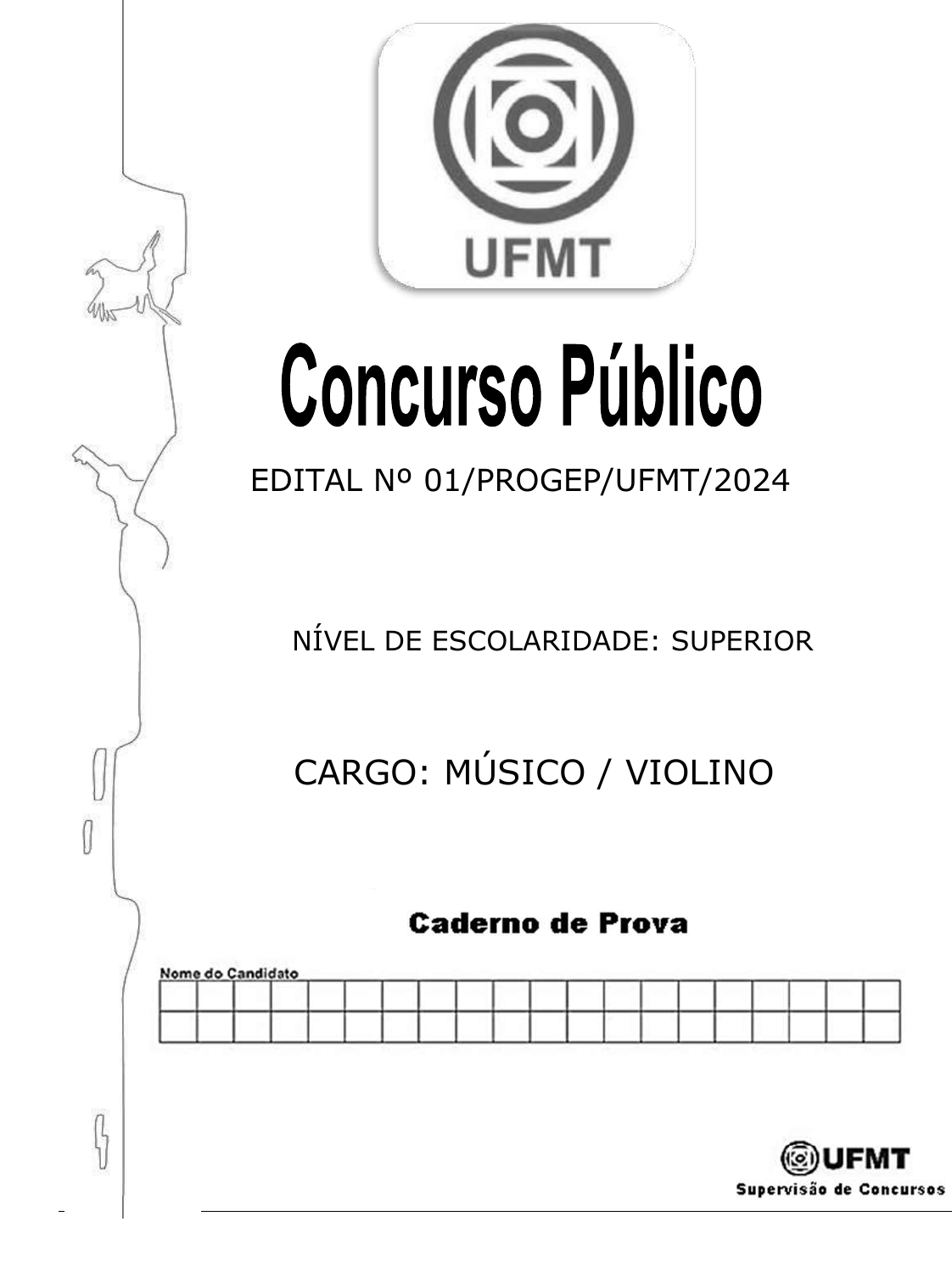 pcimarkpci MDAwMDowMDAwOjAwMDA6MDAwMDowMDAwOmZmZmY6YjExZTo4Nzgz:VHVlLCAxMSBNYXIgMjAyNSAxNzo1MjowNSAtMDMwMA== www.pciconcursos.com.br EDITAL Nº 01/PROGEP/UFMT/2024 CARGO: MÚSICO / VIOLINO NÍVEL DE ESCOLARIDADE: SUPERIOR pcimarkpci MDAwMDowMDAwOjAwMDA6MDAwMDowMDAwOmZmZmY6YjExZTo4Nzgz:VHVlLCAxMSBNYXIgMjAyNSAxNzo1MjowNSAtMDMwMA== www.pciconcursos.com.br I N S T R U Ç Õ E S LEIA COM ATENÇÃO 1. Este Caderno de Prova, com páginas numeradas de 1 a 23, é constituído de 50 (cinquenta) questões objetivas, cada uma com 4 (quatro) alternativas, assim distribuídas: 01 a 10 – Língua Portuguesa 11 a 20 – Informática Básica 21 a 30 – Conhecimentos Diversos 31 a 50 – Conhecimentos Específicos 2. Caso o Caderno de Prova esteja incompleto ou tenha qualquer defeito de impressão, solicite ao fiscal que o substitua. 3. Sobre a Marcação do Cartão de Respostas As respostas deverão ser, obrigatoriamente, transcritas com caneta esferográfica de tinta azul ou preta não porosa, fabricada em material transparente, para o Cartão de Respostas, que será o único documento válido para correção. Não haverá substituição do Cartão de Respostas por erro do candidato. 3.1. Para cada questão existe apenas uma alternativa que a responde acertadamente. Para a marcação da alternativa escolhida no CARTÃO DE RESPOSTAS, pinte completamente o círculo correspondente. Exemplo: Suponha que para determinada questão a alternativa C seja a escolhida. Nº da Questão A B C D 3.2. Marque apenas uma alternativa para cada questão. 3.3. Será invalidada a questão em que houver mais de uma marcação, marcação rasurada ou emendada, ou não houver marcação. 3.4. Não rasure nem amasse o CARTÃO DE RESPOSTAS. 4. Todos os espaços em branco, neste caderno, podem ser utilizados para rascunho. 5. A duração da prova é 4 (quatro) horas, já incluído o tempo destinado ao preenchimento do CARTÃO DE RESPOSTAS. 6. Somente após decorridas 2 horas e 30 minutos do início da prova, o candidato, depois de entregar seu Caderno de Prova e seu Cartão de Respostas, poderá retirar-se da sala de prova. O candidato que insistir em sair da sala de prova antes desse tempo deverá assinar Termo de Ocorrência declarando sua desistência do concurso. 7. Na página 23 deste Caderno de Prova, encontra-se a Folha de Anotação do Candidato, a qual poderá ser utilizada para a transcrição das respostas das questões objetivas. Essa folha poderá ser levada pelo candidato para posterior conferência com o gabarito somente após decorridas 2 horas e 30 minutos do início da prova. 8. Será permitida a saída de candidatos levando o Caderno de Prova somente na última meia hora de prova. 9. Após o término da prova, o candidato deverá, obrigatoriamente, entregar ao fiscal o CARTÃO DE RESPOSTAS devidamente assinado (no espaço próprio) e preenchido. pcimarkpci MDAwMDowMDAwOjAwMDA6MDAwMDowMDAwOmZmZmY6YjExZTo4Nzgz:VHVlLCAxMSBNYXIgMjAyNSAxNzo1MjowNSAtMDMwMA== www.pciconcursos.com.br 1 de 23 – Fundação Universidade Federal de Mato Grosso – Superior – Músico / Violino LÍNGUA PORTUGUESA Instrução: Leia o texto a seguir e responda às questões de 01 a 03. Sempre me angustiou a situação das pessoas que são objeto das diferentes formas de tráfico. Quem dera que se ouvisse o grito de Deus, perguntando a todos nós: “Onde está o teu irmão?” (Gn 4, 9). Onde está o teu irmão escravo? Onde está o irmão que estás matando cada dia na pequena fábrica clandestina, na rede de prostituição, nas crianças usadas para a mendicidade? Naquele que tem de trabalhar às escondidas porque não foi regularizado? Não nos façamos de distraídos! Há muita cumplicidade... A pergunta é para todos! Nas nossas cidades, está instalado este crime mafioso e aberrante, e muitos têm as mãos cheias de sangue devido a uma cômoda e muda cumplicidade. (Exortação apostólica do Sumo Pontífice Francisco. Evangelii Gaudium. São Paulo: Edições Loyola Jesuítas, 2013.) QUESTÃO 01 A respeito das ideias veiculadas no texto, marque V para as verdadeiras e F para as falsas. ( ) O tráfico humano é praticado de maneiras diferenciadas, não só da mesma maneira. ( ) Há cumplicidade das pessoas em não se envolver na questão do tráfico humano. ( ) As pessoas são conclamadas a não serem cúmplices do crime de tráfico humano. ( ) Nem todas as pessoas são consideradas irmãs, são classificadas em livres e escravas. Assinale a sequência correta. [A] V, F, F, V [B] F, F, V, V [C] V, V, V, F [D] F, V, F, F QUESTÃO 02 Sobre recursos discursivos usados no texto, analise as afirmativas. I. No trecho Quem dera que se ouvisse o grito de Deus, é expresso um desejo ou ordem, portanto está no modo imperativo. II. Em muitos têm as mãos cheias de sangue devido a uma cômoda e muda cumplicidade., há presença de sinestesia, pois evidenciam-se sensações percebidas pelo corpo humano, como visão, olfato, audição e tato. III. A citação de um trecho bíblico “Onde está teu irmão?” (Gn 4, 9) traz para o texto o recurso da intertextualidade. IV. Por ser um texto de caráter religioso, a frase Não nos façamos de distraídos! é uma ordem a ser cumprida pelos fiéis. V. As perguntas feitas no texto podem ser denominadas perguntas retóricas, pois objetivam expressar crítica e estimular uma reflexão no leitor, sem necessariamente esperar respostas. Estão corretas as afirmativas [A] II, III e V, apenas. [B] I, II, IV e V, apenas. [C] I, III e IV, apenas. [D] I, II, III e V, apenas. QUESTÃO 03 Há, na língua portuguesa, sufixos que formam substantivos de adjetivos, como altivez e beleza. Geralmente são nomes abstratos e indicam qualidade, estado, propriedade e modo de ser. Qual palavra do texto é exemplo dessa formação? [A] cumplicidade [B] mafioso [C] aberrante [D] prostituição pcimarkpci MDAwMDowMDAwOjAwMDA6MDAwMDowMDAwOmZmZmY6YjExZTo4Nzgz:VHVlLCAxMSBNYXIgMjAyNSAxNzo1MjowNSAtMDMwMA== www.pciconcursos.com.br 2