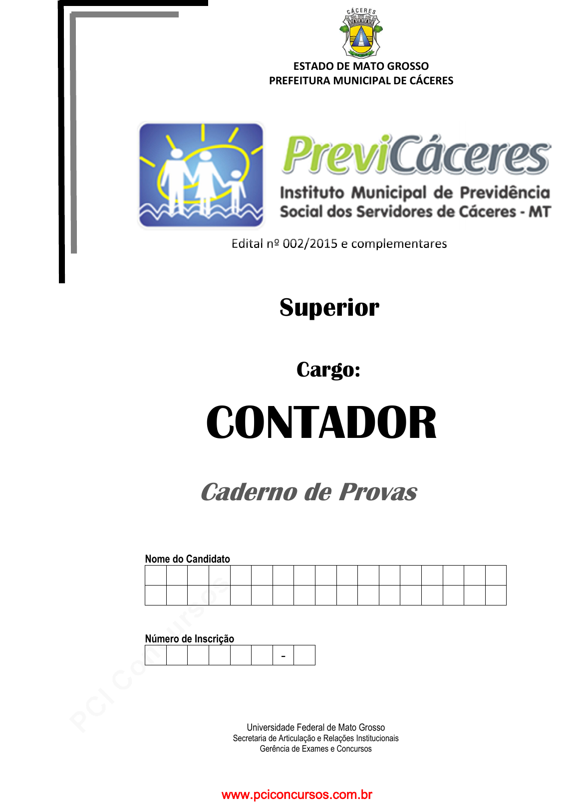 pcimarkpci MDAwMDowMDAwOjAwMDA6MDAwMDowMDAwOmZmZmY6YjExZTo4Y2M1:VHVlLCAxMSBNYXIgMjAyNSAxNzoxMDoyNSAtMDMwMA== www.pciconcursos.com.br ESTADO DE MATO GROSSO PREFEITURA MUNICIPAL DE CÁCERES Superior Caderno de Provas Nome do Candidato Número de Inscrição - Cargo: CONTADOR Universidade Federal de Mato Grosso Secretaria de Articulação e Relações Institucionais Gerência de Exames e Concursos www.pciconcursos.com.br pcimarkpci MDAwMDowMDAwOjAwMDA6MDAwMDowMDAwOmZmZmY6YjExZTo4Y2M1:VHVlLCAxMSBNYXIgMjAyNSAxNzoxMDoyNSAtMDMwMA== www.pciconcursos.com.br I N S T R U Ç Õ E S LEIA COM ATENÇÃO 1. Este Caderno de Provas, com páginas numeradas de 1 a 15, é constituído de: � uma Prova Objetiva com 40 (quarenta) questões de múltipla escolha, cada uma com quatro alternativas, assim distribuídas: • 01 a 10 – Língua Portuguesa • 11 a 15 – Informática • 16 a 20 – Legislação Básica • 21 a 40 – Conhecimentos Específicos � uma Prova de Redação. 2. Caso o Caderno de Provas esteja incompleto ou tenha qualquer defeito de impressão, solicite ao fiscal que o substitua. 3. Sobre a Marcação do Cartão de Respostas As respostas das questões da Prova Objetiva devem ser, obrigatoriamente, transcritas com caneta esferográfica de tinta azul ou preta não porosa, fabricada em material transparente, para o Cartão de Respostas, que será o único documento válido para correção. 3.1. Para cada questão existe apenas uma alternativa que a responde acertadamente. Para a marcação da alternativa escolhida no CARTÃO DE RESPOSTAS, pinte completamente o círculo correspondente. Exemplo: Suponha que para determinada questão a alternativa C seja a escolhida. N.º da Questão A B C D 3.2. Será invalidada a questão em que houver mais de uma marcação, marcação rasurada ou emendada, ou não houver marcação. 4. Na elaboração da Redação, poderá ser usada para rascunho a página 13 deste Caderno, mas o texto definitivo deverá ser transcrito na Folha de Redação. Use caneta esferográfica de tinta azul ou preta não porosa. 5. Todos os espaços em branco, neste caderno, podem ser utilizados para rascunho. 6. Não haverá substituição do CARTÃO DE RESPOSTAS e da FOLHA DE REDAÇÃO por erro do candidato. 7. A duração das Provas é 4 (quatro) horas, já incluído o tempo destinado ao preenchimento do CARTÃO DE RESPOSTAS da Prova Objetiva e da FOLHA DE REDAÇÃO da Prova de Redação. 8. Somente após decorridas 2 horas e 30 minutos do início das provas, o candidato poderá retirar-se da sala de provas. O candidato que insistir em sair da sala de provas antes de decorrido esse tempo deverá assinar Termo de Ocorrência declarando sua desistência do concurso. 9. Será permitida a saída de candidatos levando o Caderno de Provas somente quando estiver faltando 30 minutos para o término das provas. 10. Na página 15 deste Caderno de Provas, encontra-se a Folha de Anotação do Candidato, a qual poderá ser utilizada para a transcrição das respostas das questões objetivas. Essa folha poderá ser levada pelo candidato para posterior conferência com o gabarito somente após decorridas 2 horas e 30 minutos do início das provas. 11. Terminadas as provas, o candidato deverá, obrigatoriamente, entregar ao fiscal este Caderno de Provas, o CARTÃO DE RESPOSTAS e a FOLHA DE REDAÇÃO. www.pciconcursos.com.br pcimarkpci MDAwMDowMDAwOjAwMDA6MDAwMDowMDAwOmZmZmY6YjExZTo4Y2M1:VHVlLCAxMSBNYXIgMjAyNSAxNzoxMDoyNSAtMDMwMA== www.pciconcursos.com.br 1/15 – Concurso Público PREVI-Cáceres – CONTADOR – SUPERIOR PROVA OBJETIVA Língua Portuguesa INSTRUÇÃO: Leia o texto e responda às questões de 01 a 03. De 11 de julho de 2013 para cá, o juiz Sérgio Moro tornou-se uma celebridade nacional. Não há semana que não tenha convite para falar em algum evento, e a inclusão de seu nome na lista de palestrantes é garantia de casa cheia. Não há lugar público – restaurante, aeroporto, fila de táxi – em que ele não seja aplaudido por populares. Em 2015, sua figura ganhou ainda mais preeminência em função do contraste entre sua distinção pública e as mentiras e pontapés e manobras e bandalheiras gerais que cobriram Brasília de escárnio. Com a notoriedade, Moro teve de abandonar o hábito de ir para o trabalho de bicicleta. Está um pouco mais gordo e, apesar da timidez pétrea, um pouco mais desinibido. Ganhou traquejo no trato com a imprensa, que sempre o cerca nos eventos públicos com flashes e perguntas, e também se habituou ao assédio do público, que o cumula de pedidos de selfies e autógrafos. (Revista Veja, ed. 2.458.) QUESTÃO 01 Sobre o trecho: Em 2015, sua figura ganhou ainda mais preeminência em função do contraste entre sua distinção pública e as mentiras e pontapés e manobras e bandalheiras gerais que cobriram Brasília de escárnio., marque V para as afirmativas verdadeiras e F para as falsas. ( ) Quando uma circunstância é empregada no início da frase, fora de sua posição canônica, deve-se isolá-la com uma vírgula, a exemplo de Em 2015,. ( ) Os elementos coesivos sua e que retomam o mesmo sentido anteriormente citado no texto: o juiz Sérgio Moro. ( ) Exceto a primeira ocorrência da palavra e, as demais foram usadas intencionalmente repetidas para enfatizar o encadeamento de ações vergonhosas. ( ) A palavra mais precedida de ainda forma uma expressão adverbial que enfatiza sobremaneira o modo de ser preeminente do juiz. Assinale a sequência correta. (A) V, V, F, F (B) F, F, F, V (C) F, V, V, F (D) V, F, V, V QUESTÃO 02 Muitas locuções adjetivas, ao serem substituídas por adjetivos, tomam a forma erudita, a exemplo de pétrea, usado no texto, cuja locução é de pedra. Assinale a alternativa em que a locução adjetiva NÃO apresenta correspondente adjetivo na forma erudita. (A) de chuva → pluvial (B) de cinza → cinéreo (C) de guerra → bélico (D) de hospital → hospitalar QUESTÃO 03 Nos trechos lugar público, distin