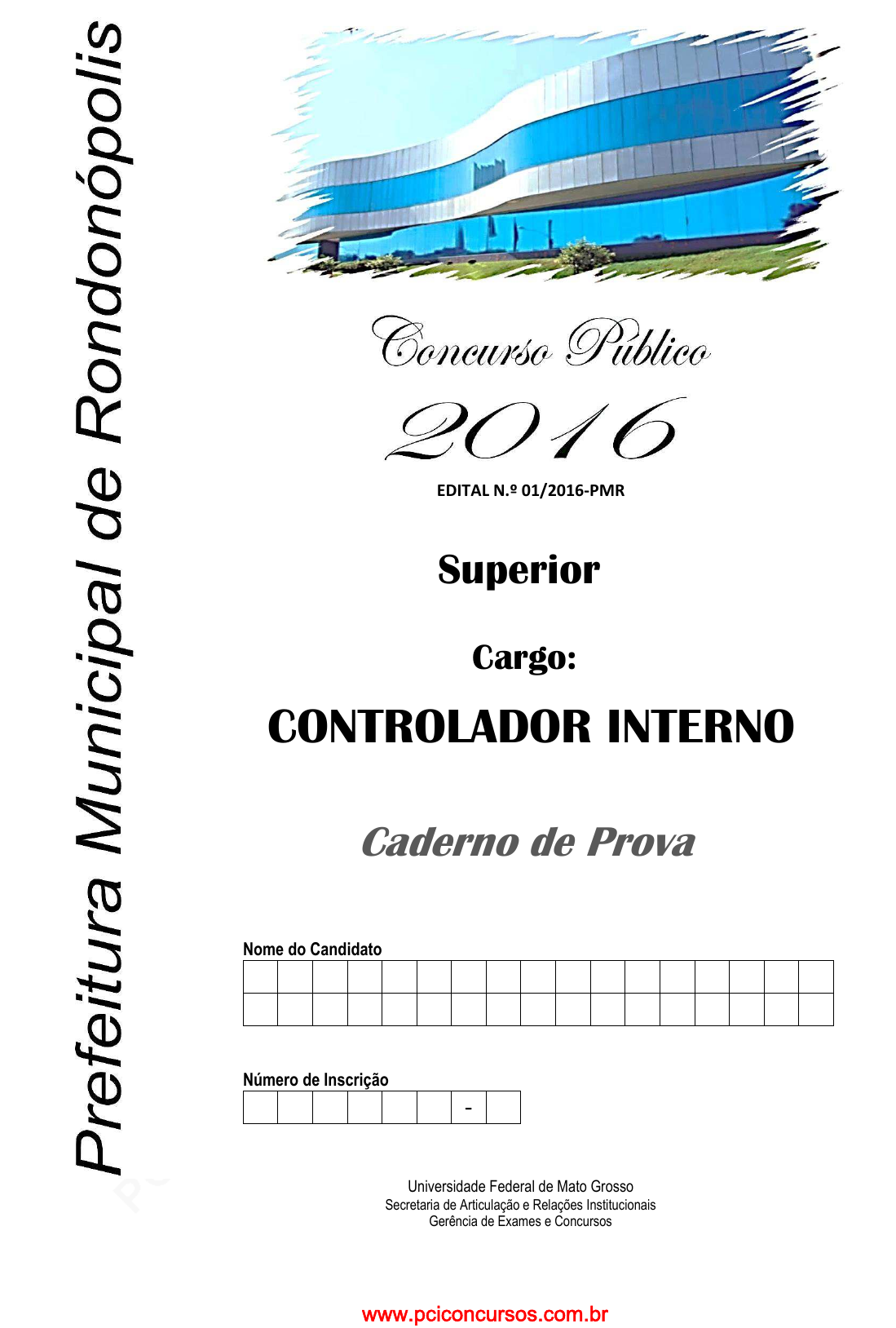 pcimarkpci MDAwMDowMDAwOjAwMDA6MDAwMDowMDAwOmZmZmY6YjExZTo4Y2M1:VHVlLCAxMSBNYXIgMjAyNSAxNzoxMTo1MiAtMDMwMA== www.pciconcursos.com.br EDITAL N.º 01/2016-PMR Superior Caderno de Prova Nome do Candidato Número de Inscrição - Cargo: CONTROLADOR INTERNO Universidade Federal de Mato Grosso Secretaria de Articulação e Relações Institucionais Gerência de Exames e Concursos www.pciconcursos.com.br pcimarkpci MDAwMDowMDAwOjAwMDA6MDAwMDowMDAwOmZmZmY6YjExZTo4Y2M1:VHVlLCAxMSBNYXIgMjAyNSAxNzoxMTo1MiAtMDMwMA== www.pciconcursos.com.br I N S T R U Ç Õ E S LEIA COM ATENÇÃO 1. Este Caderno de Prova, com páginas numeradas de 1 a 15, é constituído de 40 (quarenta) questões objetivas, cada uma com quatro alternativas, assim distribuídas: 01 a 10 – Língua Portuguesa 11 a 20 – Informática Básica 21 a 40 – Conhecimentos Específicos 2. Caso o Caderno de Prova esteja incompleto ou tenha qualquer defeito de impressão, solicite ao fiscal que o substitua. 3. Sobre a Marcação do Cartão de Respostas As respostas da Prova Objetiva deverão ser, obrigatoriamente, transcritas com caneta esferográfica de tinta azul ou preta não porosa, fabricada em material transparente, para o Cartão de Respostas, que será o único documento válido para correção. Não haverá substituição do Cartão de Respostas por erro do candidato. 3.1. Para cada questão existe apenas uma alternativa que a responde acertadamente. Para a marcação da alternativa escolhida no CARTÃO DE RESPOSTAS, pinte completamente o campo correspondente. Exemplo: Suponha que para determinada questão a alternativa C seja a escolhida. N.º da Questão A B C D 3.2. Será invalidada a questão em que houver mais de uma marcação, marcação rasurada ou emendada, ou não houver marcação. 3.3. Não rasure nem amasse o CARTÃO DE RESPOSTAS. 4. A duração da prova é de quatro horas, já incluído o tempo destinado ao preenchimento do CARTÃO DE RESPOSTAS e a coleta de impressão digital de candidatos. 5. Todos os espaços em branco, neste caderno, podem ser utilizados para rascunho. 6. Será permitida a saída de candidatos da sala de prova somente após decorridas duas horas e trinta minutos do início da prova. Nesse caso, o candidato deverá entregar, obrigatoriamente, ao fiscal o Caderno de Prova e o Cartão de Respostas. 7. O candidato que insistir em sair da sala de prova antes de transcorridas duas horas e trinta minutos do início da prova deverá assinar Termo de Ocorrência declarando desistência do Concurso. 8. Ao candidato somente será permitido levar seu Caderno de Prova na última meia hora de prova. 9. Na página 15 deste Caderno de Prova, encontra-se a Folha de Anotação do Candidato, a qual poderá ser utilizada para a transcrição das respostas das questões objetivas. Essa folha poderá ser levada pelo candidato para posterior conferência com o gabarito somente após decorridas duas horas e trinta minutos do início da prova. 10. Terminada a prova, o candidato deverá, obrigatoriamente, entregar ao fiscal o CARTÃO DE RESPOSTAS. www.pciconcursos.com.br pcimarkpci MDAwMDowMDAwOjAwMDA6MDAwMDowMDAwOmZmZmY6YjExZTo4Y2M1:VHVlLCAxMSBNYXIgMjAyNSAxNzoxMTo1MiAtMDMwMA== www.pciconcursos.com.br 1/15 – Concurso Público da Prefeitura Municipal de Rondonópolis – CONTROLADOR INTERNO LÍNGUA PORTUGUESA INSTRUÇÃO: Leia trecho do artigo Saúde, de Ruth de Aquino, e responda às questões de 01 a 03. Quando brindamos, o primeiro voto é “saúde” – e não por acaso. Só depois vem “paz, amor”. Sem saúde, o resto não é possível. Por que, então, o Brasil é tão cruel com seus doentes? Crises na Saúde não são produzidas de um dia para outro. O caos nos hospitais do Rio de Janeiro é apenas a vitrine de um sistema falido e desumano [...]. O Estado brasileiro nunca deu assistência médica digna à massa da população. Jamais transformou a Saúde em prioridade. No Brasil profundo, não é novidade a falta de médicos, leitos, remédios e equipamentos. [...] Os governos federal, estaduais e municipais empurram com a barriga, há mais tempo do que a nossa memória alcança, os péssimos índices de desenvolvimento humano no Brasil. E aí se incluem também educação, saneamento e transporte. A negligência se explica. Os políticos não usam hospital público, escola pública e transporte público. Eles enriquecem muito no poder. A vida real passa ao largo de quem manda. (Revista ÉPOCA, ed. 917.) QUESTÃO 01 Nos trechos Sem saúde e Crises na Saúde, a palavra saúde foi escrita de modos diferentes. Sobre esse fato, analise as afirmativas. I - O sentido da palavra saúde, seja com inicial maiúscula ou minúscula, é inalterado, expressa a boa condição física e mental de um indivíduo; as diferentes grafias devem-se à informalidade da linguagem. II - As iniciais minúscula, no primeiro trecho, e maiúscula, no segundo, atribuem sentido diferenciado para a mesma palavra, revelado na situação de uso. III - O termo saúde, no primeiro trecho, refere-se ao estado de um indivíduo cujas funções orgânicas, físicas e mentais estão em situação normal. IV - O termo Saúde, no segundo trecho, significa Ministério da Saúde, assim grafado devido ao registro formal da linguagem. Está correto o que se afirma em (A) I, apenas. (B) II e III, apenas. (C) II, III e IV, apenas. (D) I e IV, apenas. QUESTÃO 02 Quanto aos recursos linguísticos e expressivos no texto, assinale a afirmativa correta. (A) Na primeira frase do texto, a conjunção Quando introduz sentido de tempo posterior e pode ser substituída por No momento em que. (B) A veemência da crítica da articulista é marcada também pelo uso de advérbios e adjetivos com valor semântico de caráter negativo, a exemplo de não, jamais, nunca, falido, desumano, péssimos. (C) No segmento há mais tempo do que a nossa memória alcança, foi usado pronome possessivo na primeira pessoa com a finalidade de distanciar os leitores da posição defendida
