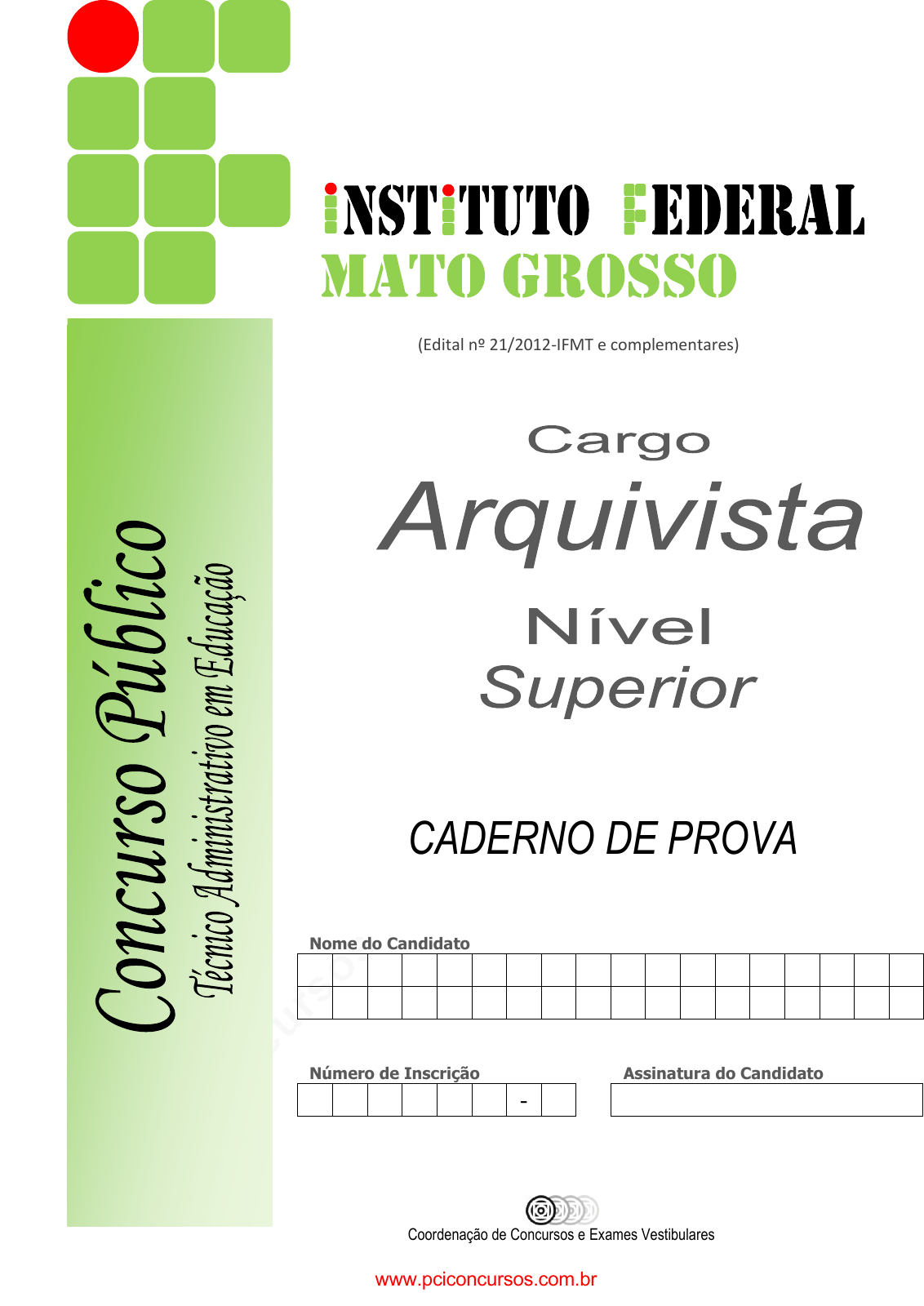 pcimarkpci MDAwMDowMDAwOjAwMDA6MDAwMDowMDAwOmZmZmY6YjViZjozZTlj:VHVlLCAxMSBNYXIgMjAyNSAxNTo0MTo0NSAtMDMwMA== www.pciconcursos.com.br (Edital nº 21/2012-IFMT e complementares) Nome do Candidato Número de Inscrição Assinatura do Candidato - Coordenação de Concursos e Exames Vestibulares CADERNO DE PROVA www.pciconcursos.com.br pcimarkpci MDAwMDowMDAwOjAwMDA6MDAwMDowMDAwOmZmZmY6YjViZjozZTlj:VHVlLCAxMSBNYXIgMjAyNSAxNTo0MTo0NSAtMDMwMA== www.pciconcursos.com.br Instruções LEIA COM ATENÇÃO 1. Este Caderno de Prova, com páginas numeradas de 1 a 13, é constituído de uma Prova Objetiva com 40 (quarenta) questões de múltipla escolha, cada uma com quatro alternativas, assim distribuídas: 01 a 10 – Língua Portuguesa 11 a 20 – Informática Básica 21 a 40 – Conhecimentos Específicos 2. Caso o Caderno de Prova esteja incompleto ou tenha qualquer defeito de impressão, solicite ao fiscal que o substitua. 3. Sobre a Marcação do Cartão de Respostas As respostas das questões da Prova Objetiva devem ser, obrigatoriamente, transcritas com caneta esferográfica de tinta preta não porosa para o Cartão de Respostas, que será o único documento válido para correção. Não haverá substituição do Cartão de Respostas por erro do candidato. 3.1. Para cada questão existe apenas uma alternativa que a responde acertadamente. Para a marcação da alternativa escolhida no CARTÃO DE RESPOSTAS, pinte completamente o círculo correspondente. Exemplo: Suponha que para determinada questão a alternativa C seja a escolhida. N.º da Questão A B C D 3.2. Será invalidada a questão em que houver mais de uma marcação, marcação rasurada ou emendada, ou não houver marcação. 3.3. Não rasure nem amasse o CARTÃO DE RESPOSTAS. 4. Todos os espaços em branco, neste caderno, podem ser utilizados para rascunho. 5. A duração da prova é 4 (quatro) horas, já incluído o tempo destinado ao preenchimento do CARTÃO DE RESPOSTAS. 6. Será permitida a saída de candidatos da sala de prova somente após decorridas 2:30 h (duas horas e trinta minutos) do início da Prova Objetiva. 7. O candidato que insistir em sair da sala de prova antes de transcorridas 2:30 h (duas horas e trinta minutos) do início da Prova Objetiva deverá assinar Termo de Ocorrência declarando desistência do Concurso. 8. Antes de se retirar da sala de prova, o candidato deverá, obrigatoriamente, entregar ao fiscal este Caderno de Prova e o Cartão de Respostas. Este Caderno de Prova poderá ser levado pelo candidato somente na última meia hora de prova. 9. É vedado ao candidato copiar as marcações feitas no Cartão de Respostas. www.pciconcursos.com.br pcimarkpci MDAwMDowMDAwOjAwMDA6MDAwMDowMDAwOmZmZmY6YjViZjozZTlj:VHVlLCAxMSBNYXIgMjAyNSAxNTo0MTo0NSAtMDMwMA== www.pciconcursos.com.br 1/13 – Arquivista: SUPERIOR LÍNGUA PORTUGUESA INSTRUÇÃO: Leia o artigo abaixo e responda às questões de 01 a 05. Mundo que vai 1 5 10 15 20 Não é todo dia que se assiste a uma página virada na história do mundo. O modesto estado americano de Indiana (modesto em relação à federação a que pertence) começará a virá-la a partir do início do próximo ano letivo, em setembro, quando suas escolas deixarão de ensinar obrigatoriamente a letra de mão aos alunos. Já há algum tempo corre nos Estados Unidos o debate sobre a utilidade de ensiná-la. O tempo aí empregado seria mais bem aproveitado em disciplinas hoje bem mais pertinentes, a começar pelo manejo do teclado do computador. Mas Indiana é o primeiro estado a tornar a medida oficial, por meio de instrução às escolas. Obrigatório será o ensino do teclado. A letra de mão, que também atende pelo bonito nome de cursiva, com origem em “correr” e “corrente”, terá ensino facultativo. Ela hoje corre bem menos, coitada, e é bem menos corrente que os caracteres do computador. O traçado cursivo, como até os chimpanzés saberiam prever, foi atropelado impiedosamente pela eletrônica. Que as crianças precisam desde cedo familiarizar-se com o computador é ponto pacífico. Discutível é se o abandono do cursivo trará perdas às novas gerações. Especialistas acenam com possível involução na capacidade motora e na coordenação entre olho e mão. Outros perguntam como as crianças de hoje assinarão os cheques que as esperam na vida adulta – se é que ainda haverá cheques, e se é que algum truque digital não virá substituir as assinaturas. A máquina de escrever já foi um golpe na letra de mão. A rigor, a imprensa de Gutemberg, muito antes já fora um golpe. Mas nenhum deles acertou em cheio. O computador sim, com seu avanço totalizante sobre a vida. A morte do cursivo pode resultar no fenômeno, inédito na história, de uma criança de hoje não conseguir ler o que o pai escreveu na escola, ou numa carta, ou num diário. Aqueles traçados redondos, argolas inclinadas para a direita como matagal ao vento, engatadas umas às outras, como vagões de trem, que diabos seriam? O cursivo difere bastante da letra de forma. O filho achará que o pai escrevia em árabe. A ilegibilidade de um texto em letra de mão não é ocorrência nova na história. Documentos do século XVI só os paleógrafos são capazes de decifrar. Mas sempre se passou um tempo considerável, até que uma maneira de escrever caducasse aos olhos dos vindouros. O que se desenha de inédito no horizonte é o fenômeno se dar no espaço de apenas uma geração. Os avanços tecnológicos têm ocorrido velozmente, mas corte tão nítido e abrupto, muro geracional intransponível, ainda estava por vir. É um mundo que vai embora. (TOLEDO, Roberto P. de. Revista Veja, 27/07/2011. Adaptado) Questão 01 Sobre o artigo, pode-se afirmar: [A] Discute as mudanças do ensino da escrita do inglês no estado americano de Indiana. [B] Enfatiza o debate sobre o ensino da letra maiúscula nos Estados Unidos. [C] Questiona se o abandono do traçado cursivo trará benefícios às crianças. [D] Propõ