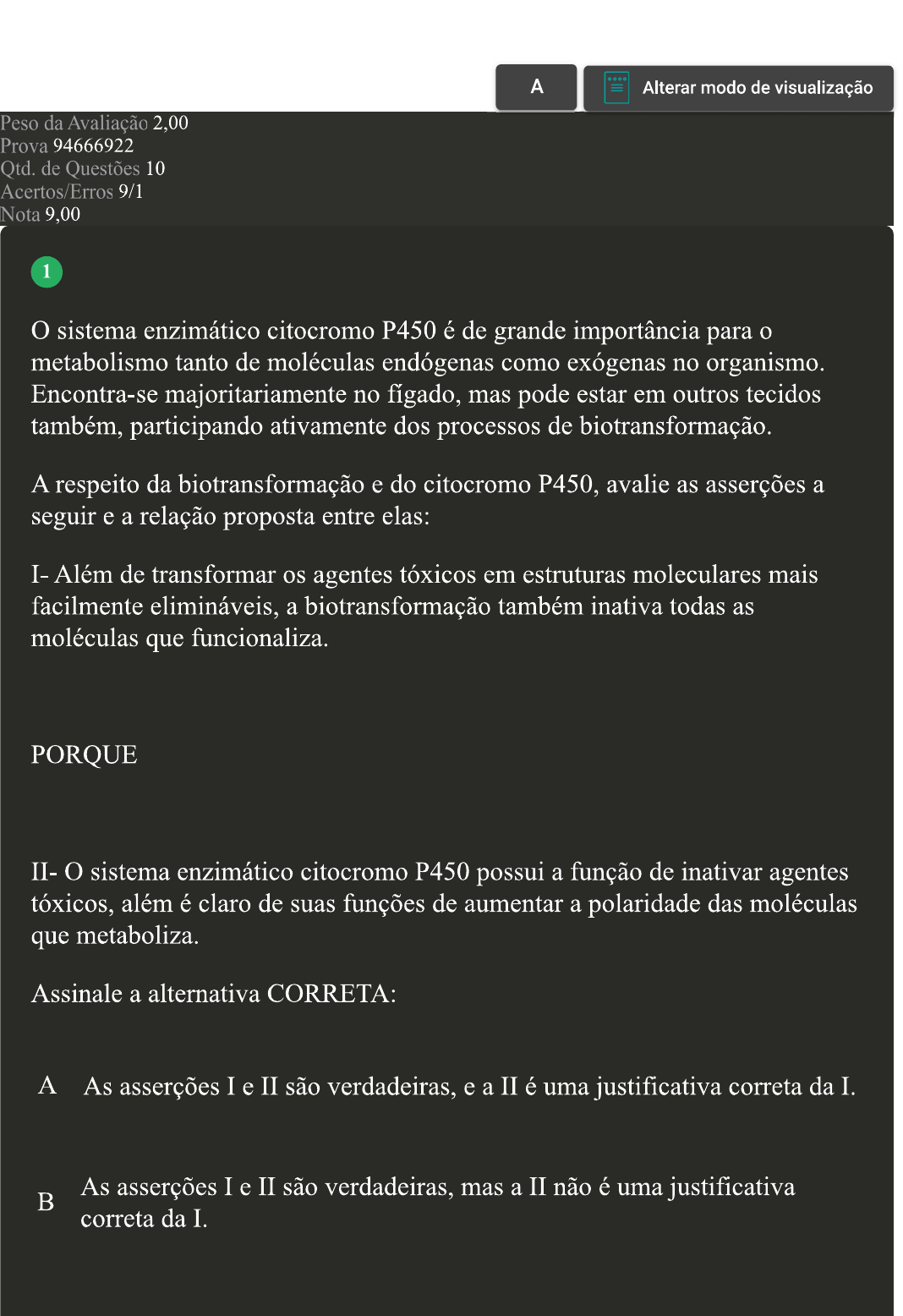 A Alterar modo de visualização Peso da Avaliação 2,00 Prova 94666922 Qtd. de Questões 10 Acertos/Erros 9/1 Nota 9,00 1 O sistema enzimático citocromo P450 é de grande importância para metabolismo tanto de moléculas endógenas como exógenas no organismo. Encontra-se majoritariamente no fígado, mas pode estar em outros tecidos também, participando ativamente dos processos de biotransformação. A respeito da biotransformação e do citocromo P450, avalie as asserções a seguir e a relação proposta entre elas: I Além de transformar os agentes tóxicos em estruturas moleculares mais facilmente elimináveis, a biotransformação também inativa todas as moléculas que funcionaliza. PORQUE O sistema enzimático citocromo P450 possui a função de inativar agentes tóxicos, além é claro de suas funções de aumentar a polaridade das moléculas que metaboliza. Assinale a alternativa CORRETA: A As asserções I e II são verdadeiras, e a II é uma justificativa correta da I. As asserções I e II são verdadeiras, mas a II não é uma justificativa B correta da I.C As asserções I e II são falsas. D A asserção I é uma proposição verdadeira e a II é uma proposição falsa. E A asserção I é uma proposição falsa e a II é uma proposição verdadeira. 2 A história da toxicologia se inicia muito antes desta ser reconhecida como ciência. No decorrer dos séculos, diversos nomes ajudaram a compor que hoje conhecemos como a ciência dos venenos. Dentre estes, um em especial é reconhecido como "Pai da Medicina do Trabalho", por seus estudos relacionados à Toxicologia Ocupacional, principalmente pela publicação do livro "Morbis Artificum Diatriba", traduzido para português como "As doenças dos trabalhadores". O pesquisador ao qual a questão se refere é: A Bernardino Ramazzini. B C Avicena. D Claude Bernard. E Paracelso.3 A distribuição de agentes tóxicos influência de forma drástica os efeitos deletérios que esses podem causar no organismo. Alguns toxicantes distribuem-se com grande facilidade pelos tecidos, já outros tendem a ficar aprisionados em alguns compartimentos. A respeito das vias de absorção dos agentes tóxicos, analise as afirmativas a seguir: I- O fluxo sanguíneo e linfático nos tecidos do organismo influencia drasticamente na distribuição do agente tóxico. II- Características intrínsecas do próprio toxicante, como coeficiente de partição pouco influenciam na distribuição pelo organismo. III- A capacidade do agente tóxico de se ligar a proteínas plasmáticas é de grande importância para comportamento de distribuição do agente tóxico. Uma vez absorvido, agente tóxico pode sofrer processos de distribuição, biotransformação e, finalmente, excreção. Assinale a alternativa CORRETA: A I, II e III, apenas. B I, III e IV, apenas. C II e III, apenas. D I e IV, apenas.E III e IV, apenas. 4 Agentes tóxicos, para que causem danos ao paciente, precisam inicialmente serem expostos a esse. A partir da exposição, a fase seguinte será a absorção, dando início aos fenômenos que compõe a toxicocinética. A respeito das vias de absorção dos agentes tóxicos, analise as afirmativas a seguir: I- Embora seja um tecido de grande extensão em nosso organismo, intoxicações por via dérmica não ocorrem. II- Embora não seja necessariamente proposital, em alguns casos a intoxicação pode ocorrer pela via enteral. A via intraperitoneal é comum em ensaios toxicológicos realizados em animais de experimentação. IV- Agentes tóxicos que são absorvidos por via parenteral são majoritariamente administrados oralmente. Assinale a alternativa CORRETA: A I e IV, apenas. B III e IV, apenas. C II e III, apenas.D I, II e III, apenas. E I, III e IV, apenas. Revisar Conteúdo do Livro 5 A distribuição de substâncias químicas pelo organismo compõe parte importante dos processos de toxicocinética. Os fenômenos que ocorrem nesta fase podem definir potencial dano de um toxicante, bem como antídoto necessário. Acerca da toxicocinética e distribuição, analise as afirmativas a seguir: I É comum que somente agentes tóxicos com baixa polaridade sejam distribuídos pelo sangue. II- A bilirrubina é uma das principais proteínas de ligação de agentes III- O baixo volume de distribuição de um agente tóxico pode estar relacionado à capacidade deste agente de se ligar a proteínas plasmáticas. IV- que se ligam fortemente às proteínas plasmáticas irão apresentar perfil toxicocinético de distribuição mais vagaroso. Assinale a alternativa CORRETA: A I, III e IV, apenas.B apenas. C IV, apenas. D II e III, apenas. E III e IV, apenas. 6 O fígado cumpre uma série de funções endócrinas e metabólicas no organismo, que vão desde a secreção de mediadores proteínas até a formação da bile. Não é por menos que esse órgão está intimamente relacionado a processos tanto de toxicocinética e A respeito das funções do fígado nos fenômenos toxicológicos, avalie as asserções a seguir e a relação proposta entre elas: I- O fígado é principal órgão envolvido nos processos de metabolização de agentes tóxicos. No entanto, esse órgão também pode participar dos processos de depuração dos toxicantes. PORQUE II- O fígado depura substâncias biotransformando estas e, em alguns casos, excretando-as através da bile, que por sua vez será eliminada nas fezes com os toxicantes biotransformados. Assinale a alternativa CORRETA:A As asserções I e II são falsas. As asserções I e II são verdadeiras, mas a II não é uma justificativa B correta da I. C As asserções I e II são verdadeiras, e a II é uma justificativa correta da I. D A asserção I é uma proposição falsa e a II é uma proposição verdadeira. E A asserção I é uma proposição verdadeira e a II é uma proposição falsa. 7 Considerado por muitos como um dos pais das ciências dos venenos e dos remédios, Philippus Aureolus Theophrastus Bombastus vo
