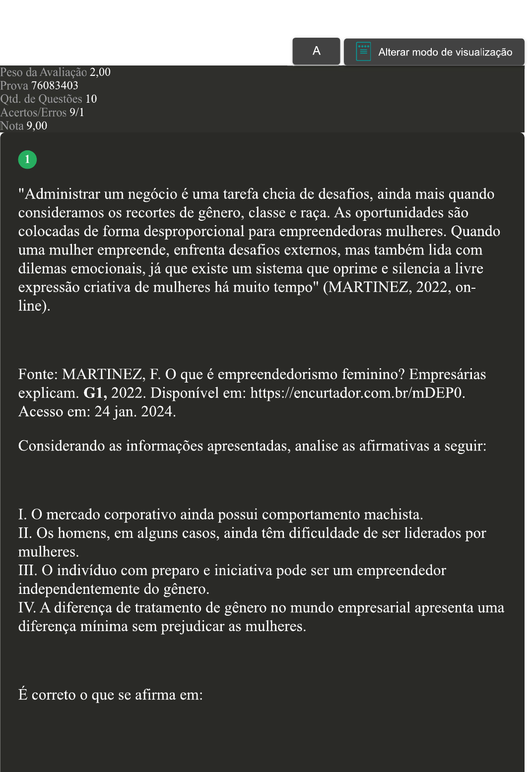 A Alterar modo de visualização Peso da Avaliação 2,00 Prova 76083403 Qtd. de Questões 10 Acertos/Erros 9/1 Nota 9,00 1 "Administrar um negócio é uma tarefa cheia de desafios, ainda mais quando consideramos recortes de classe e raça. As oportunidades são colocadas de forma desproporcional para empreendedoras mulheres. Quando uma mulher empreende, enfrenta desafios externos, mas também lida com dilemas emocionais, já que existe um sistema que oprime e silencia a livre expressão criativa de mulheres há muito tempo" (MARTINEZ, 2022, line). Fonte: MARTINEZ, F. O que é empreendedorismo feminino? Empresárias explicam. G1, 2022. Disponível em: https://encurtador.com.br/mDEPO Acesso em: 24 jan. 2024. Considerando as informações apresentadas, analise as afirmativas a seguir: I. O mercado corporativo ainda possui comportamento machista. II. Os homens, em alguns casos, ainda têm dificuldade de ser liderados por mulheres. III. O indivíduo com preparo e iniciativa pode ser um empreendedor independentemente do IV. A diferença de tratamento de gênero no mundo empresarial apresenta uma diferença mínima sem prejudicar as mulheres. É correto que se afirma em:A I, II e III, apenas. B II, III e IV, apenas. C IV, apenas. D II e III, apenas. 2 O planejamento é uma estratégia poderosa que busca estabelecer um ponto futuro desejado e as atividades e processos atuais que conduzirão a alcançá- lo. O planejamento nas empresas é crucial para definir caminhos, prever crises, otimizar uso de recursos, embasar decisões e promover monitoramento e controle do desempenho organizacional. Ele contribui para a eficiência, eficácia e sustentabilidade dos negócios, possibilitando um crescimento mais sólido e consistente. Com base nas informações apresentadas, avalie as afirmativas a seguir: I. O planejamento contribui para obter bons resultados com uma recorrência concreta. II. O planejamento nas empresas é crucial para definir direcionamentos e antecipar desafios. III. O planejamento é uma estratégia que determina um ponto a ser atingido e as atividades presentes para conquistar os resultados. IV. O planejamento é ineficaz para processo decisório, pois tem a função de promover O monitoramento e controle do desempenho organizacional e a ação compete ao líder somente. É correto que se afirma em:A II e III, apenas. B II, III e IV, apenas. C I, II e III, apenas. D IV, apenas. 3 O conceito que determina que a união faz a força tem feito com que empreendedores de setor específicos tenham juntado esforços para implementar seus modelos de negócios. Assim, artesãos, agricultores, produtores agropecuários, apenas por citar alguns, têm crescido a partir de baixo investimento individual e risco moderado. Considerando as informações apresentadas, avalie as afirmativas a seguir: I. O texto se refere ao empreendedorismo cooperativo. II. Os participantes têm risco variado de acordo com O seu envolvimento. III. O texto cita as características do empreendedorismo de base tecnológica. IV. O baixo investimento se deve ao rateio definido entre todos os participantes do grupo. É correto O que se afirma em: A II, III e IV, apenas. B I e IV, apenas.C II e III, apenas. D I, II e III, apenas. 4 Para identificar oportunidades criativas nos empreendimentos, é crucial manter-se atento às exigências e requisitos dos clientes, aos movimentos do mercado e às tendências tecnológicas. Os empreendedores com inclinações criativas devem permanecer constantemente observadores do mundo ao seu redor, discernindo as necessidades dos clientes e as oportunidades de inovação. A cultura organizacional pode representar um desafio para a criatividade. Empresas com uma cultura excessivamente rígida e burocrática podem restringir a livre expressão de ideias e limitar a capacidade inovadora. Portanto, é essencial que as empresas promovam uma cultura que aprecie a criatividade, a experimentação e a colaboração, estimulando os colaboradores a apresentar novas ideias e soluções. Além da cultura organizacional, a governança e O estabelecimento de relações de confiança com os stakeholders podem acelerar processo de execução das ideias criativas nos negócios (BROWN, 2010). Fonte: adaptado de: BROWN, T. Design Thinking: inovação em negócios. Porto Alegre: Bookman, 2010. Considerando texto apresentado e a importância da cultura organizacional para a criatividade nos negócios, analise as afirmativas a seguir: I. A cultura organizacional influencia a criatividade nos negócios. II. As empresas com uma cultura muito rígida e burocrática desestimulam a livre expressão de ideias. III. As empresas que valorizam a criatividade, a experimentação e a colaboração incentivam os colaboradores a propor novas ideias e soluções. IV. A cultura organizacional voltada para implementação das ideias criativasnos negócios têm seus colaboradores sempre lembrados a se concentrar em suas demandas e metas. É correto que se afirma em: A II, III e IV, apenas. B II e III, apenas. C I e IV, apenas. D I, II e III, apenas. 5 A motivação é caracterizada como um estado interno que impulsiona comportamento Portanto, pode-se conceber a motivação como a disposição que estimula a busca pela realização das necessidades e desejos, tanto individuais quanto coletivos. Isso leva a pessoa a agir com empenho específico, visando alcançar seus objetivos. O ser humano não se submete passivamente à execução de atividades que lhe são impostas e que, por conseguinte, não possuem nenhum significado para ele CANTERI; KOVALESKI, 2019). Fonte: adaptado de: NASCIMENTO, R. F.; CANTERI, M. H. G.; KOVALESKI, J. L. Impacto dos Sistemas de Recompensas na Motivação Organizacional: Revisão Sistemática pelo Método PRISMA. Revista Gestão e Conexões, [S. V. 8, n. 2, p. Disponível em: https://periodicos.ufes.br/ppgadm/article/view/23541. Acesso em: 4 dez. 2023. Com base no texto apresentado, assinale a alternativa