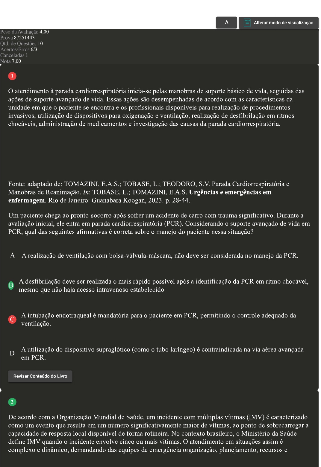 A Alterar modo de visualização Peso da Avaliação 4,00 Prova 87251443 Otd. de Questões 10 Acertos/Erros 6/3 Canceladas 1 Nota 7,00 1 O atendimento à parada cardiorrespiratória inicia-se pelas manobras de suporte básico de vida, seguidas das ações de suporte avançado de vida Essas ações são desempenhadas de acordo com as características da unidade em que o paciente se encontra e os profissionais disponíveis para realização de procedimentos invasivos, utilização de dispositivos para oxigenação e ventilação, realização de desfibrilação em ritmos chocáveis, administração de medicamentos e investigação das causas da parada cardiorrespiratória. Fonte: adaptado de: TOMAZINI, E.A.S.; TOBASE, L.; TEODORO, S.V. Parada Cardiorrespiratória e Manobras de Reanimação. In: TOBASE, L.; TOMAZINI, E.A.S. Urgências e emergências em enfermagem. Rio de Janeiro: Guanabara Koogan, 2023. p. 28-44. Um paciente chega ao pronto-socorro após sofrer um acidente de carro com trauma significativo. Durante a avaliação inicial, ele entra em parada cardiorrespiratória (PCR). Considerando suporte avançado de vida em PCR, qual das seguintes afirmativas é correta sobre manejo do paciente nessa situação? A A realização de ventilação com não deve ser considerada no manejo da PCR. A desfibrilação deve ser realizada mais rápido possível após a identificação da PCR em ritmo chocável, mesmo que não haja acesso intravenoso estabelecido A intubação endotraqueal é mandatória para paciente em PCR, permitindo controle adequado da ventilação. A utilização do dispositivo supraglótico (como tubo laríngeo) é contraindicada na via aérea avançada D em PCR. Revisar Conteúdo do Livro 2 De acordo com a Organização Mundial de Saúde, um incidente com múltiplas vítimas (IMV) é caracterizado como um evento que resulta em um número significativamente maior de vítimas, ao ponto de sobrecarregar a capacidade de resposta local disponível de forma rotineira. No contexto brasileiro, Ministério da Saúde define IMV quando incidente envolve cinco ou mais vítimas. O atendimento em situações assim é complexo e dinâmico, demandando das equipes de emergência organização, planejamento, recursos eprofissionais qualificados. Uma das estratégias utilizadas para atendimento de IMV é processo de triagem pré-hospitalar, que visa identificar e priorizar pacientes que requerem intervenção imediata e/ou remoção. Fonte: adaptado de: LIMA, D. S. et al. Simulação de incidentes com múltiplas vítimas: treinando profissionais e ensinando universitários. Revista do Colégio Brasileiro de Cirurgiões, V. 46, n. 3, p. e20192163, 2019. Disponível em: Acesso em: 7 jul. 2023. Com base nas informações apresentadas, avalie as asserções a seguir e a relação proposta entre elas: I. O método START é um sistema de triagem utilizado em situações de múltiplas vítimas, baseando-se nos critérios: capacidade de deambulação, frequência respiratória, reenchimento capilar ou pulso radial e estado neurológico. Ele classifica as vítimas em quatro categorias de prioridade de atendimento: vermelho, amarelo, verde e preto. PORQUE II. O objetivo do profissional que utiliza método START é classificar as vítimas, não prestando cuidado direto imediato, exceto em casos de controle de hemorragia e abertura de via aérea em vítimas que não estão respirando. Outras intervenções são realizadas por profissionais não envolvidos na triagem. A respeito dessas asserções, assinale a opção correta: A A asserção I é uma proposição verdadeira e a II é uma proposição falsa. B As asserções I e II são verdadeiras, mas a II não é uma justificativa correta da I. As asserções I e II são verdadeiras, e a II é uma justificativa correta da I.D A asserção I é uma proposição falsa e a II é uma proposição verdadeira. 3 Os acidentes de trânsito estão inseridos no rol de causas externas de morbimortalidade e representam um dos desafios mais significativos em termos de saúde pública em âmbito global. Esses eventos não ocorrem de forma aleatória, afetando grupos populacionais de maneira diferenciada, com variações na distribuição conforme fatores relacionados às pessoas, aos espaços e ao tempo. Apesar da complexidade desse fenômeno e da multiplicidade de seus determinantes, é possível adotar medidas preventivas eficazes para evitar os acidentes de trânsito. Fonte: adaptado de: RIOS, P. A. A. et al. Acidentes de trânsito com condutores de veículos: incidência e diferenciais entre motociclistas e motoristas em estudo de base populacional. Revista Brasileira de Epidemiologia, V. 22. p. e190054, 2019. Disponível em: em: 7 jul. 2023. Os dispositivos de segurança são de grande relevância na segurança no trânsito e prevenção de lesões, atuando na redução do risco de trauma em diferentes faixas Considerando os conhecimentos sobre esse tema, classifique V para as sentenças verdadeiras e F para as falsas: ( ) O uso adequado de dispositivos de segurança, como cinto de segurança, airbag, capacete e cadeira infantil, contribui para reduzir risco de lesões graves em casos de acidentes automobilísticos. ( ) O trauma em gestantes apresenta características peculiares devido às alterações anatômicas e fisiológicas da gravidez, tornando ainda mais relevante a utilização de dispositivos de segurança. ( ) Para idosos, uso adequado de capacetes é uma medida eficaz para prevenir lesões traumáticas em acidentes de bicicleta ou motocicleta, especialmente em quedas. ( ) A utilização da cadeirinha infantil é recomendada para crianças com idade inferior a 2 anos, pois após essa faixa etária elas podem utilizar cinto de segurança do veículo sem restrições. Assinale a afirmativa que contempla corretamente a sequência: AB V, F, F. C D 4 A Política Nacional de Urgência (PNAU), implementada no Brasil em 2003, surgiu em resposta à insatisfação