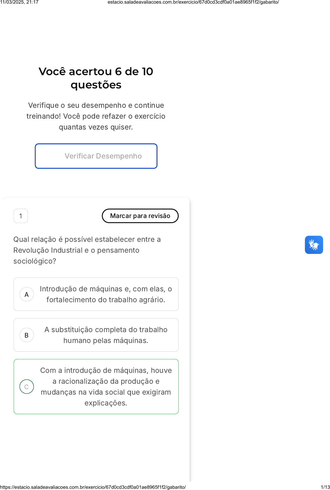 Você acertou 6 de 10 questões Verifique o seu desempenho e continue treinando! Você pode refazer o exercício quantas vezes quiser. Verificar Desempenho A B C 1 Marcar para revisão Qual relação é possível estabelecer entre a Revolução Industrial e o pensamento sociológico? Introdução de máquinas e, com elas, o fortalecimento do trabalho agrário. A substituição completa do trabalho humano pelas máquinas. Com a introdução de máquinas, houve a racionalização da produção e mudanças na vida social que exigiram explicações. 11/03/2025, 21:17 estacio.saladeavaliacoes.com.br/exercicio/67d0cd3cdf0a01ae8965f1f2/gabarito/ https://estacio.saladeavaliacoes.com.br/exercicio/67d0cd3cdf0a01ae8965f1f2/gabarito/ 1/13 D E A introdução das máquinas sem alteração da ordem social. O crescimento das cidades e o abandono do campo. Resposta correta Parabéns, você selecionou a alternativa correta. Confira o gabarito comentado! Gabarito Comentado A alternativa correta é a C. A Revolução Industrial, com a introdução de máquinas, trouxe uma racionalização da produção e mudanças significativas na vida social. Essas mudanças exigiram novas explicações e interpretações, o que contribuiu para o desenvolvimento do pensamento sociológico. Este buscava compreender as transformações sociais decorrentes do processo de industrialização, como a urbanização, a formação da classe operária e as novas relações de trabalho. 2 Marcar para revisão Durante os estudos iniciais da Sociologia, diversos pensadores se destacaram na tentativa de entender e explicar os fenômenos sociais. Em relação ao Auguste Comte, é correto afirmar que: 11/03/2025, 21:17 estacio.saladeavaliacoes.com.br/exercicio/67d0cd3cdf0a01ae8965f1f2/gabarito/ https://estacio.saladeavaliacoes.com.br/exercicio/67d0cd3cdf0a01ae8965f1f2/gabarito/ 2/13 A B C D E a maior contribuição do Auguste Comte foi no campo da biologia, não da sociologia. Auguste Comte não teve relevância significativa nos estudos sociológicos iniciais. Auguste Comte foi introduzido apenas no século XX, após a consolidação da Sociologia como ciência. Auguste Comte foi amplamente rejeitado por pensadores contemporâneos da época. Auguste Comte é reconhecido por criar o termo 'Sociologia' e defendia a superioridade da ciência para explicar fenômenos. Resposta correta Parabéns, você selecionou a alternativa correta. Confira o gabarito comentado! Gabarito Comentado Auguste Comte é um dos pilares da Sociologia e é amplamente reconhecido por sua contribuição significativa à disciplina. Ele não apenas criou o termo "Sociologia", mas também defendia a aplicação da abordagem científica ao estudo dos fenômenos sociais, acreditando 11/03/2025, 21:17 estacio.saladeavaliacoes.com.br/exercicio/67d0cd3cdf0a01ae8965f1f2/gabarito/ https://estacio.saladeavaliacoes.com.br/exercicio/67d0cd3cdf0a01ae8965f1f2/gabarito/ 3/13 A B C D E no poder da ciência para elucidar e explicar tais fenômenos. 3 Marcar para revisão A sociologia surgiu no século XIX diretamente atrelada à consolidação do: Capitalismo. Renascimento. Comunismo. Crescimento do trabalho no campo. Escravismo. Resposta correta Parabéns, você selecionou a alternativa correta. Confira o gabarito comentado! Gabarito Comentado A sociologia, como ciência, surgiu no século XIX, período em que o capitalismo estava se consolidando como sistema econômico dominante. Nesse contexto, a sociologia nasceu com o objetivo de compreender as transformações sociais e econômicas que estavam ocorrendo, principalmente em função da Revolução 11/03/2025, 21:17 estacio.saladeavaliacoes.com.br/exercicio/67d0cd3cdf0a01ae8965f1f2/gabarito/ https://estacio.saladeavaliacoes.com.br/exercicio/67d0cd3cdf0a01ae8965f1f2/gabarito/ 4/13 A B C D E Industrial. Portanto, a alternativa correta é o "Capitalismo". 4 Marcar para revisão Uma universidade decidiu criar um novo curso de Sociologia. Durante o planejamento, houve debates sobre a importância de incluir Auguste Comte e o positivismo funcionalista no currículo. Considerando o texto, analise as afirmativas abaixo. I. Auguste Comte é considerado o fundador da Sociologia. II. O positivismo funcionalista não tem relevância no estudo contemporâneo da Sociologia. III. Comte defendeu a utilização de métodos de ciências como Matemática e Física na Sociologia. Avalie as alternativas. Apenas a afirmativa I está correta. Apenas as afirmativas I e III estão corretas. Apenas a afirmativa II está correta. Apenas as afirmativas II e III estão corretas. Todas as afirmativas estão corretas. 11/03/2025, 21:17 estacio.saladeavaliacoes.com.br/exercicio/67d0cd3cdf0a01ae8965f1f2/gabarito/ https://estacio.saladeavaliacoes.com.br/exercicio/67d0cd3cdf0a01ae8965f1f2/gabarito/ 5/13 A B Resposta correta Parabéns, você selecionou a alternativa correta. Confira o gabarito comentado! Gabarito Comentado A afirmativa I está correta, pois Auguste Comte é frequentemente reconhecido como o fundador da Sociologia. A afirmativa II está incorreta, pois o positivismo funcionalista, embora tenha críticos, ainda é relevante no estudo da Sociologia contemporânea. A afirmativa III está correta, já que Comte defendeu a ideia de que a Sociologia deveria se apropriar dos métodos utilizados por outras ciências. 5 Marcar para revisão Durante os estudos iniciais da Sociologia, diversos pensadores se destacaram na tentativa de entender e explicar os fenômenos sociais. Em relação à transição feudal- capitalista, é correto afirmar que: a transição feudal-capitalista não teve relevância significativa nos estudos sociológicos iniciais. durante a transição do sistema feudal para o capitalista, ocorreram avanços tecnológicos e a consolidação do mundo moderno. 11/03/2025, 21:17 estacio.saladeavaliacoes.com.br/exercicio/67d0cd3cdf0a01ae8965f1f2/gabarito/ https://estacio.saladeavaliacoes.com.br/exercicio/67d0cd3cdf0a01ae8965f1f2/gabarito/ 6/13 