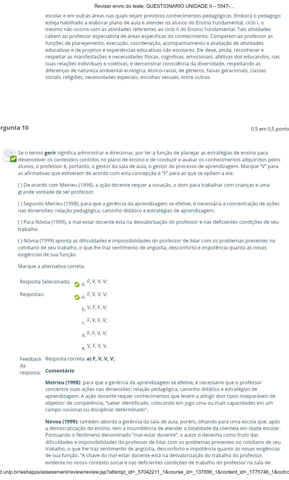 Revisar envio do teste: QUESTIONÁRIO UNIDADE - 5547-.. escolar e em outras áreas nas quais sejam previstos conhecimentos pedagógicos. Embora pedagogo esteja habilitado a elaborar plano de aula e atender os alunos do Ensino Fundamental, ciclo I, mesmo não ocorre com as atividades referentes ao ciclo II do Ensino Fundamental. Tais atividades cabem ao professor especialista de áreas específicas do conhecimento. Competem ao professor as funções de planejamento, execução, coordenação, acompanhamento e avaliação de atividades educativas e de projetos e experiências educativas não escolares. Ele deve, ainda, reconhecer e respeitar as manifestações e necessidades físicas, cognitivas, emocionais, afetivas dos educandos, nas suas relações individuais e coletivas, e demonstrar consciência da diversidade, respeitando as diferenças de natureza ambiental-ecológica, étnico-racial, de gêneros, faixas geracionais, classes sociais, religiões, necessidades especiais, escolhas sexuais, entre outras. rgunta 10 0,5 em 0,5 ponto Se termo gerir significa administrar e direcionar, por ter a função de planejar as estratégias de ensino para desenvolver os conteúdos contidos no plano de ensino e de conduzir e avaliar os conhecimentos adquiridos pelos alunos, o professor é. portanto, o gestor da sala de aula, gestor do processo de aprendizagem. Marque "V" para as afirmativas que estiverem de acordo com esta concepção e "E" para as que se opõem a ela: De acordo com Meirieu (1998), a ação docente requer a vocação, dom para trabalhar com crianças e uma grande vontade de ser professor. Segundo Meirieu (1998), para que a gerência da aprendizagem se efetive, é necessária a concentração de ações nas dimensões: relação pedagógica, caminho didático e estratégias de aprendizagem. Para Nóvoa (1999), mal-estar docente está na desvalorização do professor e nas deficientes condições de seu trabalho. Nóvoa (1999) aponta as dificuldades e impossibilidades do professor de lidar com os problemas presentes no cotidiano de seu trabalho, O que lhe traz sentimento de angústia, desconforto e impotência quanto às novas exigências de sua função. Marque a alternativa correta. Resposta Selecionada: V: a. Respostas: a. b. V, F, F, V; F, V; C. d. F, V; V, F, V. e Feedback Resposta correta: a) F, V, V, V; da resposta: Comentário Meirieu (1998): para que a gerência da aprendizagem se efetive, é necessário que professor concentre suas ações nas dimensões: relação pedagógica, caminho didático e estratégias de aprendizagem. A ação docente requer conhecimentos que levem a atingir dois tipos inseparáveis de objetivo: de competência, "saber identificado, colocando em jogo uma ou mais capacidades em um campo nocional ou disciplinar determinado". Nóvoa (1999): também aborda a gerência da sala de aula, porém, olhando para uma escola que, após a democratização do ensino, tem a incumbência de atender a totalidade da clientela em idade escolar. Pontuando o fenômeno denominado "mal-estar docente", o autor desenha como fruto das dificuldades e impossibilidades do professor de lidar com os problemas presentes no cotidiano de seu trabalho, que lhe traz sentimento de angústia, desconforto e impotência quanto às novas exigências de sua função. "A chave do mal-estar docente está na desvalorização do trabalho do professor, evidente no nosso contexto social e nas deficientes condições de trabalho do professor na sala de