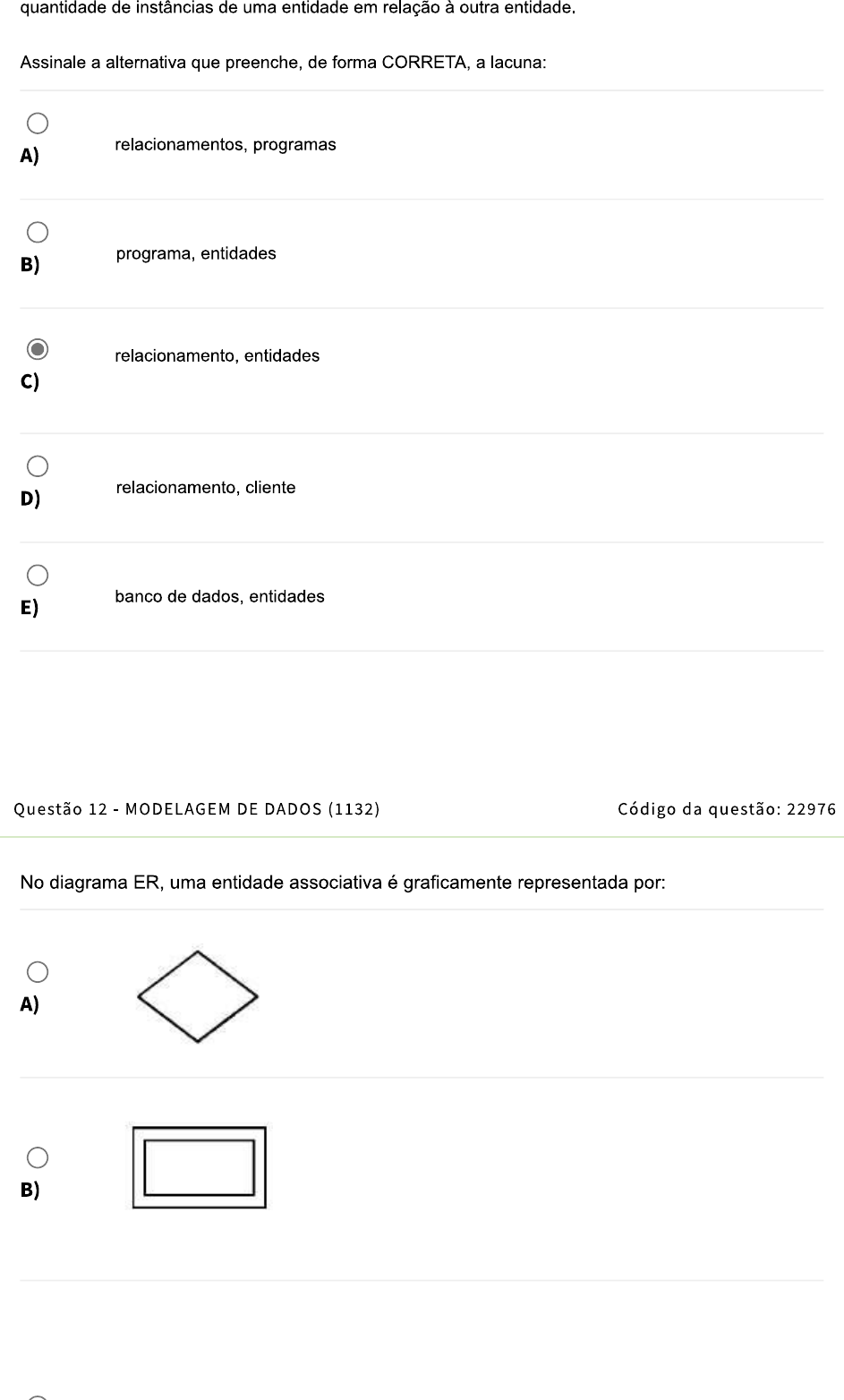 quantidade de instâncias de uma entidade em relação à outra entidade. Assinale a alternativa que preenche, de forma CORRETA, a lacuna: A) relacionamentos, programas B) programa, entidades relacionamento, entidades C) relacionamento, cliente D) banco de dados, entidades E) Questão 12 - MODELAGEM DE DADOS (1132) Código da questão: 22976 No diagrama ER, uma entidade associativa é graficamente representada por: A) B)D) E) Questão 13 - PROGRAMAÇÃO ORIENTADA A OBJETOS Código da questão: 29962 (1343) Java possui 8 tipos primitivos que podem ser usados como tipos de atributos. Assinale a alternativa que apresenta todos os tipos primitivos em Java: byte, short, int, long, float, char, boolean. A) B) string, short, int, long, float, char, boolean. byte, string, int, long, float, char, boolean. D) byte, short, string, long, float, char, boolean. E) byte, short, int, long, string, char, boolean.