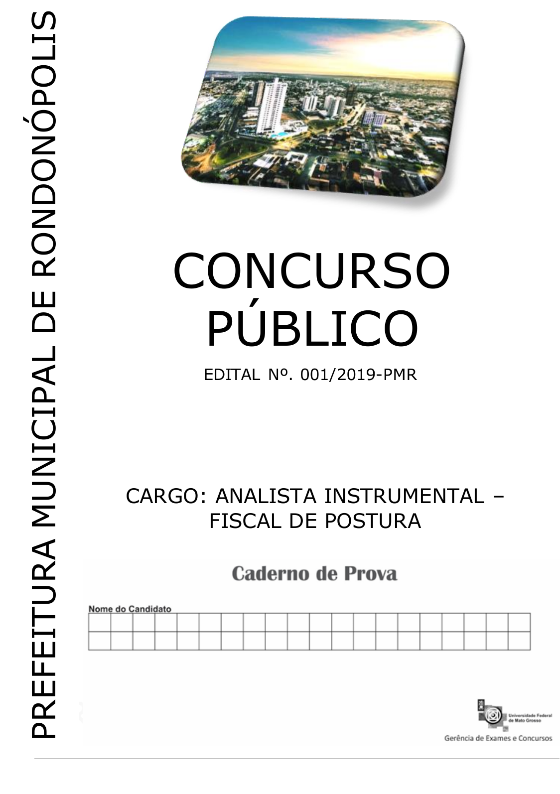 pcimarkpci MDAwMDowMDAwOjAwMDA6MDAwMDowMDAwOmZmZmY6YjViZjozZTlj:VHVlLCAxMSBNYXIgMjAyNSAxNTozOToxNSAtMDMwMA== www.pciconcursos.com.br P R E F E IT U R A M U N IC IP A L D E R O N D O N Ó P O L IS EDITAL Nº. 001/2019-PMR CONCURSO PÚBLICO CARGO: ANALISTA INSTRUMENTAL – FISCAL DE POSTURA pcimarkpci MDAwMDowMDAwOjAwMDA6MDAwMDowMDAwOmZmZmY6YjViZjozZTlj:VHVlLCAxMSBNYXIgMjAyNSAxNTozOToxNSAtMDMwMA== www.pciconcursos.com.br I N S T R U Ç Õ E S LEIA COM ATENÇÃO 1. Este Caderno de Prova, com páginas numeradas de 1 a 17, é constituído de 44 (quarenta e quatro) questões de múltipla escolha, cada uma com 4 (quatro) alternativas, assim distribuídas: 01 a 10 – Língua Portuguesa 11 a 15 – Informática Básica 16 a 19 – História e Geografia de Mato Grosso 20 a 24 – Legislação Básica 25 a 44 – Conhecimentos Específicos 2. Caso o Caderno de Prova esteja incompleto ou tenha qualquer defeito de impressão, solicite ao fiscal que o substitua. 3. Sobre a Marcação do Cartão de Respostas da Prova Objetiva As respostas das questões objetivas deverão ser transcritas com caneta esferográfica de tinta azul ou preta não porosa, fabricada em material transparente, para o Cartão de Respostas, que será o único documento válido para correção. O Cartão de Respostas não será substituído por erro ou dano do candidato. 3.1. Para cada questão existe apenas uma alternativa que a responde acertadamente. Para a marcação da alternativa escolhida no CARTÃO DE RESPOSTAS, pinte completamente o círculo correspondente. Exemplo: Suponha que para determinada questão a alternativa C seja a escolhida. N.º da Questão A B C D 3.2. Será invalidada a questão em que houver mais de uma marcação, marcação rasurada ou emendada, ou não houver marcação. 3.3. Não rasure nem amasse o CARTÃO DE RESPOSTAS. 4. Todos os espaços em branco, neste caderno, podem ser utilizados para rascunho. 5. A duração da prova é 4 (quatro) horas, já incluído o tempo destinado ao preenchimento do CARTÃO DE RESPOSTAS. 6. Somente após decorridas 2 horas e 30 minutos do início da prova, o candidato, depois de entregar seu Caderno de Prova e seu Cartão de Respostas, poderá retirar-se da sala de prova. 7. O candidato que insistir em sair da sala de prova antes desse tempo deverá assinar Termo de Ocorrência declarando sua desistência do concurso. 8. Será permitida a saída de candidatos levando o Caderno de Prova somente na última meia hora de prova. 9. Na página 17 deste Caderno de Prova, encontra-se a Folha de Anotação do Candidato , a qual poderá ser utilizada para a transcrição das respostas das questões objetivas. Essa folha poderá ser levada pelo candidato para posterior conferência com o gabarito somente após decorridas 2 horas e 30 minutos do início da prova. 10. Após o término da prova, o candidato deverá, obrigatoriamente, entregar ao fiscal o CARTÃO DE RESPOSTAS. pcimarkpci MDAwMDowMDAwOjAwMDA6MDAwMDowMDAwOmZmZmY6YjViZjozZTlj:VHVlLCAxMSBNYXIgMjAyNSAxNTozOToxNSAtMDMwMA== www.pciconcursos.com.br 1 de 17 – Prefeitura de Rondonópolis – FISCAL DE POSTURA Instrução: Leia atentamente a charge e responda às questões 01 e 02. (Disponível em: http://conexaobytes.blogspot.com. Acesso em: 18/06/2019.) QUESTÃO 01 Sobre a charge, analise as afirmativas. I- A sequência dos quadrinhos mostra que os seres humanos podem tornar-se dependentes em relação aos produtos tecnológicos. II- A capacidade de pensar, de criar pode ser embaçada pelo uso impensado e acrítico da tecnologia. III- Os trabalhadores têm mente fechada, prendem-se exclusivamente ao que apresentam os produtos tecnológicos. IV- Atualmente, o mercado de trabalho busca o trabalhador especializado, sem integração com a tecnologia. Estão corretas as afirmativas (A) I, II, III e IV. (B) II, III e IV, apenas. (C) III e IV, apenas. (D) I e II, apenas. QUESTÃO 02 Em relação a aspectos linguísticos empregados no texto, marque V para as afirmativas verdadeiras e F para as falsas. ( ) Os termos laptop, smartphone, pen-drive e i-pod pertencem à língua inglesa e não devem ser incorporados na língua portuguesa. ( ) A palavra aqui, no quinto quadrinho, funciona como elemento coesivo em referência à cabeça do personagem masculino. ( ) Os termos mequetrefes e E olhe lá, no último quadrinho, são empregados principalmente na linguagem oral no registro informal. ( ) A fala do personagem, no quarto quadrinho, pode ser reescrita, sem prejuízo do sentido, da seguinte maneira: Quero gravar 10 mil músicas no meu i-pod. Assinale a sequência correta. (A) F, V, V, F (B) F, V, F, V (C) V, F, F, V (D) V, F, V, F LÍNGUA PORTUGUESA pcimarkpci MDAwMDowMDAwOjAwMDA6MDAwMDowMDAwOmZmZmY6YjViZjozZTlj:VHVlLCAxMSBNYXIgMjAyNSAxNTozOToxNSAtMDMwMA== www.pciconcursos.com.br 2 de 17 – Prefeitura de Rondonópolis – FISCAL DE POSTURA Instrução: Leia o parágrafo abaixo pertencente a um artigo científico e responda às questões de 03 a 05. Rodrigues (1999) afirma que a qualidade de vida no trabalho sempre foi focada em simplificar e trazer prazer e bem - estar ao trabalhador na realização de suas funções. Ressalta também que a qualidade de vida sempre foi alvo de preocupação para a humanidade. Exemplificando esse aspecto, o autor menciona técnicas utilizadas na história da espécie humana que facilitaram e trouxeram qualidade de vida em diferentes contextos, como a geração do fogo no período neolítico, que atribuiu um grande avanço, pois assim foi possível se proteger do frio e também preparar alimentos. A criação da roda, no período proto -história, facilitou a vida da humanidade. Ao invés da utilização de antigos trenós, foi possível a utilização de carros o que, por consequência, simplificou o deslocamento de pessoas e cargas e melhorou a qualidade de vida da raça humana. Euclides de Alexandria (300 a.C.) ensinou os princípios da geometria que auxiliaram no aprimoramento das técnicas de agricult
