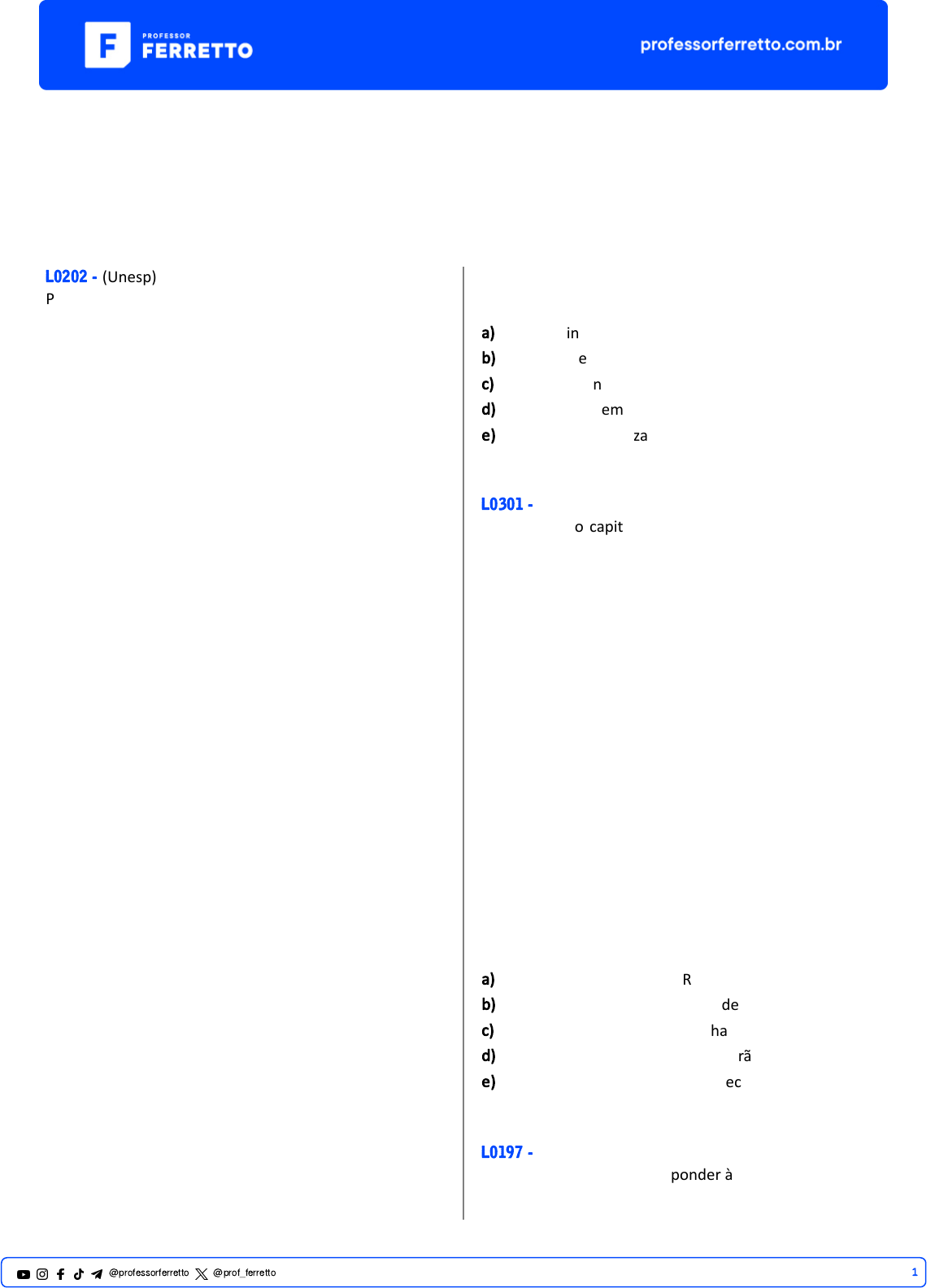 Vestibulares Modernismo - Segunda Fase - Prosa L0202 - (Unesp) Para responder à questão a seguir, leia o fragmento de um romance de Érico Veríssimo (1905-1975). O defunto dominava a casa com a sua presença enorme. Anoitecia, e os homens que cercavam o morto ali na sala ainda não se haviam habituado ao seu silêncio espesso. Fazia um calor opressivo. Do quarto con�guo vinham soluços sem choro. Pareciam pedaços arrancados dum grito de dor único e descomunal, davam uma impressão de dilaceramento, de agonia sincopada. As velas ardiam e o cheiro da cera derre�da se casava com o perfume adocicado das flores que cobriam o caixão. A mistura enjoa�va inundava o ar como uma emanação mesma do defunto, entrava pelas narinas dos vivos e lhes dava a sensação desconfortante duma comunhão com a morte. O velho calvo que estava a um canto da sala, voltou a cabeça para o militar a seu lado e cochichou: — Está fazendo falta aqui é o Tico, capitão. O oficial ainda não conhecia o Tico. Era novo na cidade. Então o velho explicou. O Tico era um sujeito que sabia animar os velórios, contava histórias, �nha um jeito especial de levar a conversa, deixando todo o mundo à vontade. Sem o Tico era o diabo... Por onde andaria aquela alma? Entrou um homem magro, alto, de preto. Cumprimentou com um aceno discreto de cabeça, caminhou devagarinho até o cadáver e ergueu o lenço branco que lhe cobria o rosto. Por alguns segundos fitou na cara morta os olhos tristes. Depois deixou cair o lenço, afastou-se enxugando as lágrimas com as costas das mãos e entrou no quarto vizinho. O velho calvo suspirou. — Pouca gente... O militar passou o lenço pela testa suada. — Muito pouca. E o calor está brabo. — E ainda é cedo. O capitão �rou o relógio: faltava um quarto para as oito. (Um lugar ao sol, 1978.) A capacidade de animar os velórios é atribuída ao Tico pelo velho calvo, porque este a considera a) um meio inadequado de ganhar a vida. b) conveniente para aliviar as tensões naquela situação. c) inapropriada naquela situação social. d) desrespeitosa em face da tristeza geral. e) um modo de enfa�zar as virtudes do morto. L0301 - (Unesp) Sem dúvida, o capital não tem pátria, e é esta uma das suas vantagens universais que o fazem tão a�vo e irradiante. Mas o trabalho que ele explora tem mãe, tem pai, tem mulher e filhos, tem língua e costumes, tem música e religião. Tem uma fisionomia humana que dura enquanto pode. E como pode, já que a sua situação de raiz é sempre a de falta e dependência. Narrar a necessidade é perfazer a forma do ciclo. Entre a consciência narradora, que sustém a história, e a matéria narrável, sertaneja, opera um pensamento desencantado, que figura o co�diano do pobre em um ritmo pendular: da chuva à seca, da folga à carência, do bem-estar à depressão, voltando sempre do úl�mo estado ao primeiro. É a narração, que se quer obje�va, da modés�a dos meios de vida registrada na modés�a da vida simbólica. (Alfredo Bosi. Céu, inferno: ensaios de crí�ca literária e ideológica, 2003. Adaptado.) O comentário aplica-se com precisão à obra a) Vidas secas, de Graciliano Ramos. b) Macunaíma, de Mário de Andrade. c) Os sertões, de Euclides da Cunha. d) Grande sertão: veredas, de Guimarães Rosa. e) A hora da estrela, de Clarice Lispector. L0197 - (Fuvest) Leia o texto abaixo para responder à questão 1@professorferretto @prof_ferretto Omolu espalhara a bexiga na cidade. Era uma vingança contra a cidade dos ricos. Mas os ricos �nham a vacina, que sabia Omolu de vacinas? Era um pobre deus das florestas d’África. Um deus dos negros pobres. Que podia saber de vacinas? Então a bexiga desceu e assolou o povo de Omolu. Tudo que Omolu pôde fazer foi transformar a bexiga de negra em alastrim, bexiga branca e tola. Assim mesmo morrera negro, morrera pobre. Mas Omolu dizia que não fora o alastrim que matara. Fora o 1lazareto. Omolu só queria com o alastrim marcar seus filhinhos negros. O lazareto é que os matava. Mas as macumbas pediam que ele levasse a bexiga da cidade, levasse para os ricos la�fundiários do sertão. Eles �nham dinheiro, léguas e léguas de terra, mas não sabiam tampouco da vacina. O Omolu diz que vai pro sertão. E os negros, os ogãs, as filhas e pais de santo cantam: Ele é mesmo nosso pai e é quem pode nos ajudar... Omolu promete ir. Mas para que seus filhos negros não o esqueçam avisa no seu cân�co de despedida: Ora, adeus, ó meus filhinhos, Qu’eu vou e torno a vortá... E numa noite que os atabaques ba�am nas macumbas, numa noite de mistério da Bahia, Omolu pulou na máquina da Leste Brasileira e foi para o sertão de Juazeiro. A bexiga foi com ele. Jorge Amado, Capitães da Areia. 1lazareto: estabelecimento para isolamento sanitário de pessoas a�ngidas por determinadas doenças. Considere as seguintes afirmações referentes ao texto de Jorge Amado: I. Do ponto de vista do excerto, considerado no contexto da obra a que pertence, a religião de origem africana comporta um aspecto de resistência cultural e polí�ca. II. Fica pressuposta no texto a ideia de que, na época em que se passa a história nele narrada, o Brasil ainda conservava formas de privação de direitos e de exclusão social advindas do período colonial. III. Os contrastes de natureza social, cultural e regional que o texto registra permitem concluir corretamente que o Brasil passou por processos de modernização descompassados e desiguais. Está correto o que se afirma em a) I, somente. b) II, somente. c) I e II, somente. d) II e III, somente. e) I, II e III. L0200 - (Unicamp) Que dizer das personagens? Creio que têm a força e ao mesmo tempo a fraqueza da caricatura. Mas, pensando melhor, não poderemos também alegar em defesa do romancista que a caricatura é uma tendência reconhecida e aceita da arte moderna, principalmente da pintura? Não haverá muito de deformação na obra de grand