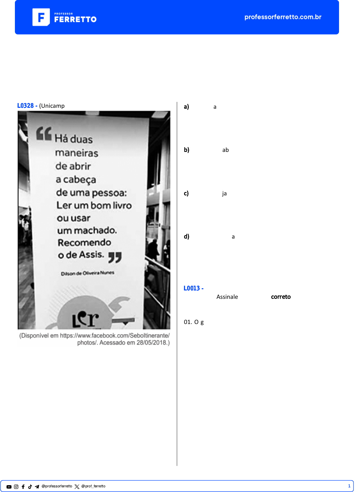 Vestibulares Introdução à Literatura L0328 - (Unicamp) “Acho que só devemos ler a espécie de livros que nos ferem e trespassam. Um livro tem que ser como um machado para quebrar o mar de gelo do bom senso e do senso comum." (Adaptado de “Franz Ka�a, carta a Oscar Pollak, 1904.”) Assinale o excerto que confirma os dois textos anteriores. a) A leitura é, fundamentalmente, processo polí�co. Aqueles que formam leitores – professores, bibliotecários – desempenham um papel polí�co. (Marisa Lajolo, A formação do leitor no Brasil. São Paulo: Á�ca, 1996, p. 28.) b) Pelo que sabemos, quando há um esforço real de igualitarização, há aumento sensível do hábito de leitura, e portanto difusão crescente das obras. (Antonio Candido, Vários escritos. São Paulo: Duas cidades, 2004, p.187.) c) Ler é abrir janelas, construir pontes que ligam o que somos com o que tantos outros imaginaram, pensaram, escreveram; ler é fazer-nos expandidos. (Gilberto Gil, Discurso no lançamento do Ano Ibero- Americano da Leitura, 2004.) d) A leitura é uma forma servil de sonhar. Se tenho de sonhar, por que não sonhar os meus próprios sonhos? (Fernando Pessoa, Páginas ín�mas e de Auto- Interpretação. São Paulo: Á�ca, 1966, p. 23.) L0013 - (Uem) (Adaptada) Assinale o que for correto sobre o gênero lírico. 01. O gênero lírico, em comparação com o gênero épico ou narra�vo, mostra-se marcado por um filtro subje�vo que favorece a expressão individual, bem como a intensificação de sen�mentos e emoções. 02. Embora marcado por grande liberdade temá�ca, o gênero lírico é bastante rigoroso no tocante às formas fixas, de modo que se manifesta apenas em sonetos, odes, elegias, contos e novelas. 04. Em contraste com a presença de um narrador no gênero épico, na lírica nota-se a presença de um eu lírico, que tanto permite a expressão de um mundo interior quanto serve de filtro para a realidade externa. 08. Uma das principais subdivisões do gênero lírico encontra-se no par “comédia” e “tragédia” que, presente desde as primeiras manifestações do gênero, deu origem, já no fim do século XVIII, à “tragicomédia”, com a u�lização de versos livres e brancos. 1@professorferretto @prof_ferretto 16. Recursos formais como a rima, a métrica e o ritmo, embora possam ser verificados em outros gêneros literários, encontram-se especialmente ligados ao gênero lírico, favorecendo sua sonoridade e sua expressividade. Estão corretas apenas as afirma�vas a) 01 e 02. b) 01, 02 e 08. c) 02 e 04. d) 01, 04 e 16. L0006 - (Uece) O amigo da casa A própria menina se prende muito a 1ele, que ainda lhe trouxe a úl�ma boneca, embora agora ela se ponha mocinha: encolhe-se na poltrona da sala sob a luz do abajur e lê a revista de quadrinhos. 2Ele é alemão como o dono da casa. Tem apartamento no hotel da praia e joga tênis no clube, saltando com energia para dentro do campo, a raquete na mão. Assiste às par�das girando no copo de uísque os cubos de gelo. É o amigo da casa. Depois do jantar, passeia com a mãe da menina pelo caminho de pedra do jardim: as duas cabeças – a loira e a preta de cabelos aparados – vão e vêm, a dele já com entradas da calva. 3Ele chupa o cachimbo de fumo cheiroso, que o moço de bordo vai deixar no escritório. O dono da casa é Seu Feldmann. 4Dirige o seu pequeno automóvel e é muito delicado. Cumprimenta sempre todos os vizinhos, até mesmo os mais canalhas como Seu Deca, fiscal da Alfândega. Seu Feldmann cumprimenta. Bate com a cabeça. Compra marcos a bordo e no banco para a 5sua viagem regular à Alemanha. Viaja em companhia do comandante do cargueiro, em camarote especial. Então respira o ar marí�mo no alto do convés, os braços muito brancos e descarnados, na camisa leve de mangas curtas. A fortuna de origem é da mulher: as velhas casas no centro da cidade, os an�gos armazéns, 6o sí�o da serra, de onde ela desce aos domingos em companhia 7do 8outro, que é o amigo da casa, e da menina. 9Saem os dois à noite e 10ele para o seu próprio automóvel sob os coqueiros na praia. 11Decerto brigaram mais uma vez, porque ela volta para casa de olhos vermelhos, enrolando 12nos dedos o lencinho bordado. Recolhe-se a seu quarto (ela e seu Feldmann dormem em quartos separados). Trila o apito do guarda. 13Os faróis do automóvel na rua pincelam de luz as paredes, �ram reflexo do espelho. 14Ela permanece insone: o vidro de sua janela é um retângulo de luz na noite. (Moreira Campos. In Obra Completa– contos II. 1969. p. 120-122. Originalmente publicado na obra O puxador de terço. Texto adaptado.) Para a maioria dos estudiosos da literatura, o texto literário é estruturado em pares de oposição: vida/morte; amor/ódio, etc. Essas oposições constam no texto claramente ou implicitamente. E não é necessário que os dois termos da oposição estejam na super�cie linguís�ca do texto. Se o texto fala somente de morte, a vida está, por oposição, implícita nele. Abaixo você encontrará duas colunas. Na coluna I, haverá um termo que formará, com um termo presente na coluna II, uma oposição. Essas oposições constam no texto claramente ou implicitamente. Nessa perspec�va, numere a coluna II de acordo com a I. Coluna I Coluna II 1. indulgência (__) deslealdade 2. vigor (__) arrogância 3. essência (__) intolerância 4. modés�a (__) fu�lidade 5. afabilidade (__) aparência 6 seriedade (__) rigidez 7. confiabilidade (__) debilidade Está correta, de cima para baixo, a seguinte sequência: a) 1 – 4 – 7 – 2 – 3 – 5 – 6. b) 2 – 7 – 4 – 5 – 6 – 1 – 3. c) 4 – 2 – 5 – 1 – 3 – 6 – 7. d) 7 – 4 – 1 – 6 – 3 – 5 – 2. L0310 - (Unesp) Leia o ensaio “Império reverso”, de Eduardo Gianne�. Império reverso – O filósofo grego Diógenes fez da autossuficiência e do controle das paixões os valores centrais de sua vida: um casaco, uma 