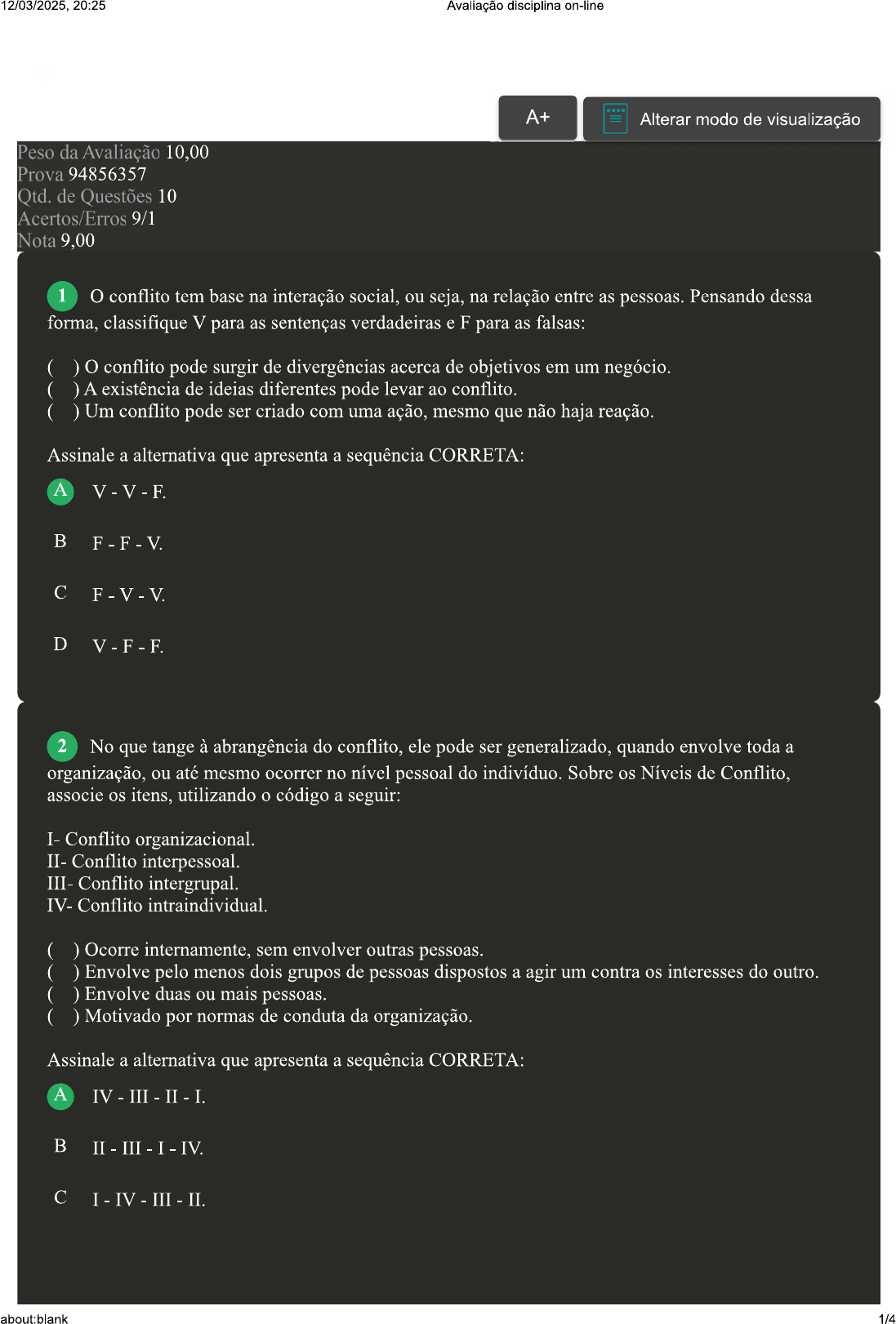 12/03/2025. 20:25 Avaliação disciplina on-line A+ Alterar modo de visualização Peso da Avaliação 10,00 Prova 94856357 Qtd. de Questões 10 Acertos/Erros 9/1 Nota 9,00 1 O conflito tem base na interação social, ou seja, na relação entre as pessoas. Pensando dessa forma, classifique V para as sentenças verdadeiras e F para as falsas: ( ) O conflito pode surgir de divergências acerca de objetivos em um negócio. ( ) A existência de ideias diferentes pode levar ao ( ) Um conflito pode ser criado com uma ação, mesmo que não haja reação. Assinale a alternativa que apresenta a sequência CORRETA: A B C D 2 No que tange à abrangência do conflito, ele pode ser generalizado, quando envolve toda a organização, ou até mesmo ocorrer no nível pessoal do indivíduo. Sobre os Níveis de Conflito, associe os itens, utilizando código a seguir: I- Conflito organizacional. II- Conflito interpessoal. III- Conflito intergrupal. IV- Conflito intraindividual. ( ) Ocorre internamente, sem envolver outras pessoas. ( ) Envolve pelo menos dois grupos de pessoas dispostos a agir um contra os interesses do outro. ( ) Envolve duas ou mais pessoas. ( ) Motivado por normas de conduta da organização. Assinale a alternativa que apresenta a sequência CORRETA: A I. B C I II. about:blank 1/412/03/2025, 20:25 Avaliação disciplina on-line D III IV I II. 3 A existência de conflitos é próprio das relações interpessoais. Não há como pensar na existência de convívio humano sem conflitos, mesmo que sejam esporádicos. A administração de conflitos surge na intenção de evitar que se chegue a situações de: A Debate pacífico. B Mudança de mentalidade por uma das partes envolvidas. C Integração entre as partes de uma entidade. D Agressividade e confronto verbal ou físico 4 Para que um conflito seja bem administrado, é importante se atentar aos cinco estágios que compõe. Assim, conflito pode ser utilizado a favor do progresso, e não como fator de discórdia destrutiva. Assinale a alternativa CORRETA que trata do estágio do Comportamento: A Estágio no qual a parte coloca em prática que decidiu fazer para lidar com a oposição. B Estágio no qual condições anteriores levam ao conflito caso uma ou mais partes envolvidas tenha sido afetada e esteja consciente disso. C Estágio no qual aparecem as condições e os fatores para surgimento do D Estágio em que há a decisão de agir de uma determinada maneira. 5 Há cinco estágios em uma situação conflituosa, cada um com suas características específicas. É importante compreender essa sequência para conseguir administrar conflito ocorrido. Assinale a alternativa CORRETA que trata do estágio da OPOSIÇÃO POTENCIAL: A Estágio no qual aparecem as condições e os fatores para surgimento do conflito. B Estágio no qual a parte coloca em prática que decidiu fazer para lidar com a oposição. C Estágio no qual condições anteriores levam ao conflito caso uma ou mais partes envolvidas tenha sido afetada e esteja consciente disso D Estágio em que há a decisão de agir de uma determinada maneira. Revisar Conteúdo do Livro 6 A administração de conflitos pode ser vista como uma ferramenta gerencial, pois busca melhorar os entraves de relação interpessoal, culminando em uma melhora dos processos. Sobre exposto, classifique V para as sentenças verdadeiras e F para as falsas: about:blank 2/412/03/2025, 20:25 Avaliação disciplina on-line ( ) A melhor situação é aquela em que as próprias partes envolvidas constroem a resolução do conflito. ( ) Pode-se utilizar ferramentas de comunicação fornecidas por profissional com capacidade para administrar situações conflituosas. ( ) Construir um canal de comunicação incentiva os conflitos, pois leva ao debate de ideias, que é causador principal de conflitos. Assinale a alternativa que apresenta a sequência CORRETA: A B D 7 Conflitos não são um fator mitigável, que podem ser completamente excluídos das relações profissionais e pessoais. Logo, como sempre existirá conflito, é primordial que se compreenda com antecedência possíveis razões de sua ocorrência. Uma das causas geradoras de conflitos é a diferença entre informações ou percepções. Sobre ela, analise as sentenças a seguir: I- Por terem diferentes percepções de uma mesma situação, as pessoas tendem a discordar sobre vários aspectos. II- O fato de terem fontes diferentes não induz as pessoas a discordarem. III- Situações assim podem ser percebidas com antecedência. Assinale a alternativa CORRETA: A Somente a sentença I está correta. B As sentenças II e III estão corretas. C As sentenças I e III estão corretas. D As sentenças I e II estão corretas. 8 Um conflito aparece assim que duas ou mais partes apresentam interesses diferentes. Por isso, na maior parte das vezes, um conflito é visto como: A Uma concordância de ideias. B Um embate, uma desavença. C Uma concessão, abrir mão de D Um ponto em comum. about:blank 3/412/03/2025, 20:25 Avaliação disciplina on-line 9 É inevitável lidarmos com conflitos. E, exatamente por isso, é fundamental compreendermos algumas das causas potenciais mais comuns de conflito na negociação, principalmente quando lidamos com nossa vida profissional. Uma das causas é a experiência de frustração. Sobre ela, analise as sentenças a seguir: I- Ocorre quando ao menos uma das partes se sente incapaz de atingir seus objetivos na negociação. II- Não pode ser resultante de limitação pessoal. III- A pessoa vislumbra a possibilidade de não ter seus desejos satisfeitos. Assinale a alternativa CORRETA: A As sentenças I e III estão corretas. B Somente a sentença III está correta. C Somente a sentença I está correta. D As sentenças II e III estão corretas. 10 Na administração de conflitos, existem duas técnicas que tratam de Alterações de Variáveis: a Alteração de Variáveis Humanas e a Alterações de Variáveis Estruturais. Assinale a 
