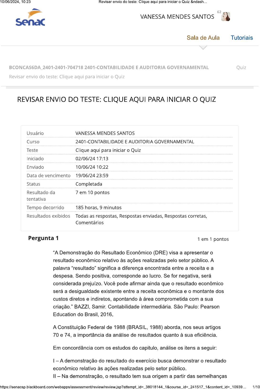 10/06/2024, 10:23 Revisar envio do teste: Clique aqui para iniciar o Quiz &ndash.. 62 VANESSA MENDES SANTOS Senac Sala de Aula Tutoriais BCONCAS6DA_2401-2401-704718 2401-CONTABILIDADE E AUDITORIA GOVERNAMENTAL Quiz Revisar envio do teste: Clique aqui para iniciar Quiz REVISAR ENVIO DO TESTE: CLIQUE AQUI PARA INICIAR O QUIZ Usuário VANESSA MENDES SANTOS Curso 2401-CONTABILIDADE E AUDITORIA GOVERNAMENTAL Teste Clique aqui para iniciar Quiz Iniciado 02/06/24 17:13 Enviado 10/06/24 10:22 Data de vencimento 19/06/24 23:59 Status Completada Resultado da 7 em 10 pontos tentativa Tempo decorrido 185 horas, 9 minutos Resultados exibidos Todas as respostas, Respostas enviadas, Respostas corretas, Comentários Pergunta 1 1 em 1 pontos "A Demonstração do Resultado Econômico (DRE) visa a apresentar o resultado econômico relativo às ações realizadas pelo setor público. A palavra "resultado" significa a diferença encontrada entre a receita e a despesa. Sendo positiva, corresponde ao lucro. Se for negativa, será considerada prejuízo. Você pode afirmar ainda que o resultado econômico será a desigualdade existente entre a receita econômica e o montante dos custos diretos e indiretos, apontando à área comprometida com a sua criação." BAZZI, Samir. Contabilidade intermediária. São Paulo: Pearson Education do Brasil, 2016. A Constituição Federal de 1988 (BRASIL, 1988) aborda, nos seus artigos 70 e 74, a importância da análise de resultados quanto à sua eficiência. Em concordância com os estudos do capitulo, análise os itens a seguir: A demonstração do resultado do exercício busca demonstrar o resultado econômico relativo às ações realizadas pelo setor público. - Na demonstração, o resultado tem sua origem a partir das semelhanças 10939. 1/1010/06/2024, 10:23 Revisar envio do teste: Clique aqui para iniciar o Quiz &ndash... encontradas entre a receita e a despesa. III - - A demonstração do resultado econômico foi inserida através da edição da NBCT TSP ao setor público. IV - A inserção da demonstração e sua elaboração determinam a existência de uma ligação com o sistema de custos. Assim, pode tardar para ocorrer a sua apresentação na prestação de contas evidenciadas aos órgãos institucionais. É verdadeiro o que se afirma em: Resposta Selecionada: I, apenas. a. Respostas: a. I, apenas. b. II, apenas. e III apenas. C. d. III e IV apenas. I, III e IV apenas. e. Comentário Alternativa A: falsa, a busca pelo resultado econômico da resposta: relacionado às ações públicas é apresentada pela demonstração do resultado econômico; - - falsa, a palavra "resultado" na demonstração é oriunda da diferença existente entre receita e despesa; III - verdadeira, a inclusão da demonstração do resultado econômico ao setor público é proveniente da edição da NBCT TSP; IV Pode-se dizer que a introdução e o desenvolvimento da demonstração estabelecem a existência de um vínculo com o sistema de custos, podendo levar tempo para sua apresentação na prestação de contas apresentadas aos órgãos institucionais Pergunta 2 1 em 1 pontos Uma auditoria cujo objeto era a aquisição de equipamentos de informática tinha como critério preestabelecido: artigo 24, inciso IV, da Lei 8.666/93: "Art. 24. É dispensável a licitação: - nos casos de emergência ou de calamidade pública, quando caracterizada urgência de atendimento de situação que possa ocasionar prejuízo ou comprometer a segurança de pessoas, obras, serviços, equipamentos e outros bens, públicos ou particulares, e somente para os bens necessários ao atendimento da situação emergencial ou calamitosa e para as parcelas de obras e serviços que possam ser concluídas no prazo máximo de 180 (cento e oitenta) dias consecutivos e ininterruptos, contados da ocorrência da emergência ou calamidade, vedada a prorrogação dos respectivos A situação encontrada foi: aquisição de equipamentos de informática, nos meses de abril e maio de X0, com licitação dispensada com base no artigo 24, inciso 2/1010/06/2024, 10:23 Revisar envio do teste: Clique aqui para iniciar o Quiz &ndash... IV, da Lei 8.666/93, no valor total de R$ 530.000,00, pago sem preencher os requisitos de situação emergencial. Indique o achado baseado nestas informações. Resposta b. Selecionada: Aquisição de equipamentos de informática para atender uma região atingida por calamidade pública. Respostas: a. Contratação de serviços de informática com dispensa de licitação baseado no baixo valor de contratação. b. Aquisição de equipamentos de informática para atender uma região atingida por calamidade pública. C. Aquisição de equipamentos de informática que foram destruídos em uma situação de calamidade pública. d. Aquisição irregular de equipamentos de informática com dispensa de licitação, sem preencher os requisitos de situação emergencial. e. Aquisição irregular de equipamentos de informática com desvio de verba de situação de calamidade pública. Comentário Alternativa B. achado de auditoria é a discrepância entre o da resposta: critério de auditoria e a situação encontrada. Dessa forma, o critério era a dispensa de licitação nos casos de emergências ou calamidade pública. A situação encontrada foi de aquisição de equipamentos com dispensa de licitação com base em casos emergenciais; entretanto, não havia emergência ou calamidade pública envolvida. Pergunta 3 0 em 1 pontos Do ponto de vista dos parâmetros que orientam os mecanismos de controle antifraude e anticorrupção nas organizações públicas, pode-se afirmar que, conforme entendimento expresso do TCU, eles estão relacionado a áreas específicas de atuação da controladoria externa voltada para ações antifraude e anticorrupção. A respeito da correlação entre esses parâmetros e as ações por eles inspiradas, assinale a alternativa que associa corretamente os termos. Resposta Correção: t
