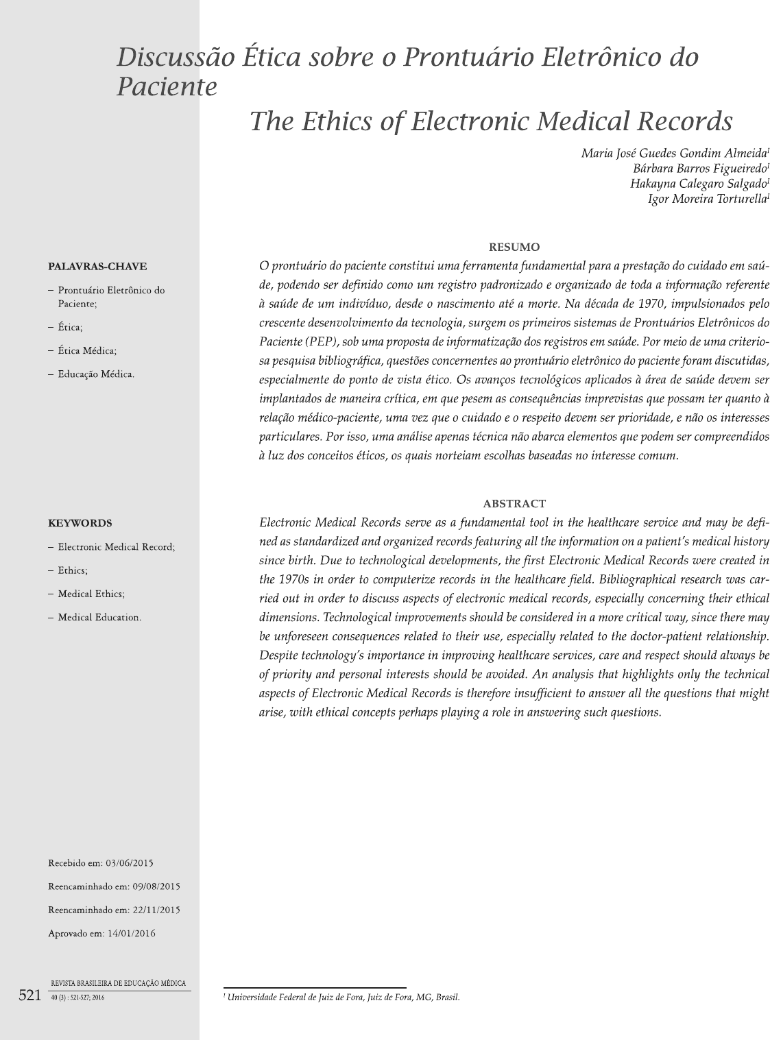 Discussão Ética sobre Prontuário Eletrônico do Paciente The Ethics of Electronic Medical Records Maria José Guedes Gondim Bárbara Barros Hakayna Calegaro Igor Moreira RESUMO PALAVRAS-CHAVE O prontuário do paciente constitui uma ferramenta fundamental para a prestação do cuidado em saú- Prontuário Eletrônico do de, podendo ser definido como um registro padronizado e organizado de toda a informação referente à saúde de um indivíduo, desde nascimento até a morte. Na década de 1970, impulsionados pelo Ética; crescente desenvolvimento da tecnologia, surgem os primeiros sistemas de Prontuários Eletrônicos do Paciente (PEP), sob uma proposta de informatização dos registros em saúde. Por meio de uma criterio- Ética Médica; sa pesquisa bibliográfica, questões concernentes ao prontuário eletrônico do paciente foram discutidas, Educação Médica. especialmente do ponto de vista ético. Os avanços tecnológicos aplicados à área de saúde devem ser implantados de maneira crítica, em que pesem as consequências imprevistas que possam ter quanto à relação médico-paciente, uma vez que o cuidado e respeito devem ser prioridade, e não os interesses particulares. Por isso, uma análise apenas técnica não abarca elementos que podem ser compreendidos à luz dos conceitos éticos, os quais norteiam escolhas baseadas no interesse comum. ABSTRACT KEYWORDS Electronic Medical Records serve as a fundamental tool in the healthcare service and may be defi- Electronic Medical Record; ned as standardized and organized records featuring all the information on a patient's medical history since birth. Due to technological developments, the first Electronic Medical Records were created in Ethics: the 1970s in order to computerize records in the healthcare field. Bibliographical research was car- Medical Ethics: ried out in order to discuss aspects of electronic medical records, especially concerning their ethical Medical Education. dimensions. Technological improvements should be considered in a more critical way, since there may be unforeseen consequences related to their use, especially related to the doctor-patient relationship. Despite technology's importance in improving healthcare services, care and respect should always be of priority and personal interests should be avoided. An analysis that highlights only the technical aspects of Electronic Medical Records is therefore insufficient to answer all the questions that might arise, with ethical concepts perhaps playing a role in answering such questions. Recebido em: 03/06/2015 Reencaminhado em: 09/08/2015 Reencaminhado em: 22/11/2015 Aprovado em: 14/01/2016 REVISTA BRASILEIRA DE EDUCAÇÃO MÉDICA 521 40 Universidade Federal de Juiz de Fora, Juiz de Fora, MG, Brasil.Maria José Guedes Gondim Almeida et al. DOI: http://dx.doi.org/10.1590/1981-52712015v40n3e01372015 INTRODUÇÃO Segundo o Conselho Federal de Medicina brasileiro, o Com os avanços das tecnologias de informação, o desenvol- prontuário pode ser entendido como: vimento do Prontuário Eletrônico do Paciente (PEP) surge como proposta num contexto em que a crescente geração de um documento único, constituído de um conjunto de in- informação, somada a uma demanda de fácil acesso se alia formações, sinais e imagens registrados, gerados a partir de ao progresso da informática para juntas buscarem a melho- fatos, acontecimentos e situações sobre a saúde do paciente ria das diversas formas de atenção. De fato, a informatização e a assistência a ele prestada, de caráter legal, sigiloso e cien- dos registros médicos apresenta potenciais benefícios não tífico, que a comunicação entre membros da equipe mente para a prática da clínica, mas também para a pesquisa, multiprofissional e a continuidade da assistência prestada ao o ensino e o próprio usuário. Entretanto, muitos também são indivíduo (CFM, 2003, resolução n° 1.638/2002, art. os desafios e as implicações da implantação desta tecnologia, sendo necessária uma discussão mais ampla de suas repercus- Na prática clínica, um prontuário bem preenchido contém Questões técnicas relativas a softwares e hardwares, além tudo o que foi realizado e todas as indicações do que preci- de assuntos da informática e engenharia médicas são, de fato, sa ser feito, constituindo um documento legítimo para sa- fundamentais. No entanto, um olhar direcionado para as im- nar quaisquer dúvidas quanto aos procedimentos médicos e plicações éticas, legais e sociais permitirá a consolidação desta quanto às respostas do organismo do tecnologia sobre bases sólidas, de forma que possa alcançar Com o desenvolvimento da informática, esta passa a in- nossa sociedade em sua dimensão integral, além de resultar fluenciar também as ciências da saúde. Na realidade, os pri- num desenvolvimento não só financeiro e administrativo, mas meiros sistemas informatizados de informação hospitalar ain- também humano. da não apresentavam grande importância clínica, mas, sim, A elaboração deste trabalho teórico-reflexivo se realizou administrativa. Com a evolução desta ferramenta, partes do por pesquisa em literatura específica a respeito dos temas: prontuário passam a ser integradas neste sistema, constituin- prontuário médico; PEP; ética; ética médica; e tecnologia de do um esboço inicial de uma finalidade clínica. Na década informação na saúde. As bases eletrônicas de dados consul- 1970, nos Estados Unidos, surgem os primeiros sistemas de tadas foram PubMed/Medline, Bireme e SciELO. Publicações Prontuários Eletrônicos do Paciente nas línguas portuguesa, inglesa e espanhola foram utilizadas. No início dos anos 1990, com a crescente importância as- sumida pelo PEP, o Institute of Medicine dos Estados Unidos PRONTUÁRIO ELETRÔNICO: CONCEITUAÇÃO encomendou um estudo com o objetivo de definir esta nova O Hospital Geral de Massachussets, em 1897, foi uma das ins- fe