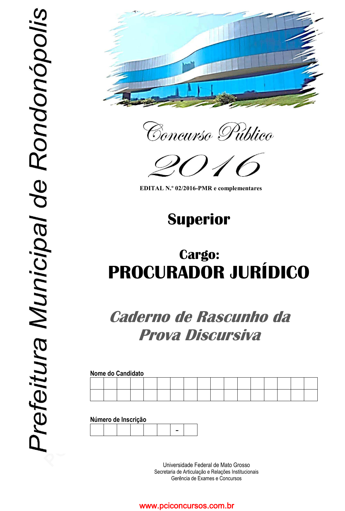 pcimarkpci MDAwMDowMDAwOjAwMDA6MDAwMDowMDAwOmZmZmY6OTU0ZTpiOWFh:V2VkLCAxMiBNYXIgMjAyNSAxODoyODoxNyAtMDMwMA== www.pciconcursos.com.br EDITAL N.º 02/2016-PMR e complementares Superior Caderno de Rascunho da Prova Discursiva Nome do Candidato Número de Inscrição - Cargo: PROCURADOR JURÍDICO Universidade Federal de Mato Grosso Secretaria de Articulação e Relações Institucionais Gerência de Exames e Concursos www.pciconcursos.com.br pcimarkpci MDAwMDowMDAwOjAwMDA6MDAwMDowMDAwOmZmZmY6OTU0ZTpiOWFh:V2VkLCAxMiBNYXIgMjAyNSAxODoyODoxNyAtMDMwMA== www.pciconcursos.com.br Instruções LEIA COM ATENÇÃO 1. Este Caderno de Rascunho, com páginas numeradas de 1 a 11, contém a proposta e o espaço para o texto de rascunho. 2. Caso este Caderno tenha qualquer defeito de impressão, solicite ao fiscal que o substitua. 3. Não ultrapasse o número de linhas destinado à resposta. 4. Para responder a esta prova, poderão ser usados os espaços para rascunho disponíveis neste Caderno de Rascunho, mas as respostas definitivas deverão ser, obrigatoriamente, transcritas nos espaços apropriados das FOLHAS DE RESPOSTAS. A resposta desta Prova Discursiva deve ser, obrigatoriamente, transcrita para seu espaço próprio na FOLHA DE RESPOSTAS, único documento válido para correção. 5. A resposta deverá ser escrita em letra legível e com caneta esferográfica de tinta azul ou preta não porosa, fabricada com material transparente. 6. A duração desta prova é 3 (três) horas, já incluído o tempo destinado à transcrição da resposta da Prova Discursiva para a FOLHA DE RESPOSTAS. www.pciconcursos.com.br pcimarkpci MDAwMDowMDAwOjAwMDA6MDAwMDowMDAwOmZmZmY6OTU0ZTpiOWFh:V2VkLCAxMiBNYXIgMjAyNSAxODoyODoxNyAtMDMwMA== www.pciconcursos.com.br 1 de 11 – Concurso Público da Prefeitura Municipal de Rondonópolis – PROCURADOR JURÍDICO PROVA DISCURSIVA O novo empreendimento da Jales Incorporadora Ltda. é constituído de um loteamento de uma gleba localizada na zona rural do município de Albertópolis, destinado ao lazer e denominado “Chácaras de Recreio Descanso dos Justos”, com cinquenta (50) lotes de quatro (4) hectares cada um, de medida menor do que o módulo rural fiscal mínimo, atribuído ao município. A empresa deu entrada do pleito na administração municipal, com os documentos que entendeu serem os necessários, provocando a autuação e processamento administrativo, com curso normal e final aprovação, após parecer técnico do engenheiro da municipalidade, assim, dando- se início à implantação do projeto de loteamento pretendido. Todo o processamento e fatos se deram na gestão do prefeito municipal Sr. Carlos Mão Aberta que, não obstante recomendações informais do Ministério Público local, pela impropriedade da licença urbanística emitida e mesmo em face de representação de teor igual de um dos vereadores locais, não considerou revogá-la. A impropriedade estaria no confronto entre o conteúdo jurídico e fático da licença e forma do parcelamento da terra com a legislação nacional disciplinadora da matéria. Logo sobrevém o processo eleitoral sucessório e, em meio dele, o órgão do Ministério Público promove uma Ação Civil Pública, pugnando pela anulação da licença e suspensão do empreendimento. Após eleito e empossado, o novo prefeito municipal, Sr. Antonio Ponderado, é citado e envia o documento judicial ao Procurador Geral do Município para que estude o caso e promova a medida jurídica competente, de forma a mais consentânea com os interesses do município e com a legislação e doutrina em vigor. Na condição de procurador jurídico da municipalidade, atenda o conteúdo da determinação do prefeito municipal. ATENÇÃO! Nas Folhas de Resposta da Prova Discursiva, é proibida a identificação do candidato por assinatura, rubrica ou outra marca qualquer fora do campo apropriado, onde a assinatura é obrigatória. www.pciconcursos.com.br pcimarkpci MDAwMDowMDAwOjAwMDA6MDAwMDowMDAwOmZmZmY6OTU0ZTpiOWFh:V2VkLCAxMiBNYXIgMjAyNSAxODoyODoxNyAtMDMwMA== www.pciconcursos.com.br 2 de 11 – Concurso Público da Prefeitura Municipal de Rondonópolis – PROCURADOR JURÍDICO 01 02 03 04 05 06 07 08 09 10 11 12 13 14 15 16 17 18 19 20 21 22 23 24 25 www.pciconcursos.com.br pcimarkpci MDAwMDowMDAwOjAwMDA6MDAwMDowMDAwOmZmZmY6OTU0ZTpiOWFh:V2VkLCAxMiBNYXIgMjAyNSAxODoyODoxNyAtMDMwMA== www.pciconcursos.com.br 3 de 11 – Concurso Público da Prefeitura Municipal de Rondonópolis – PROCURADOR JURÍDICO 26 27 28 29 30 31 32 33 34 35 36 37 38 39 40 41 42 43 44 45 46 47 48 49 50 www.pciconcursos.com.br pcimarkpci MDAwMDowMDAwOjAwMDA6MDAwMDowMDAwOmZmZmY6OTU0ZTpiOWFh:V2VkLCAxMiBNYXIgMjAyNSAxODoyODoxNyAtMDMwMA== www.pciconcursos.com.br 4 de 11 – Concurso Público da Prefeitura Municipal de Rondonópolis – PROCURADOR JURÍDICO 51 52 53 54 55 56 57 58 59 60 61 62 63 64 65 66 67 68 69 70 71 72 73 74 75 www.pciconcursos.com.br pcimarkpci MDAwMDowMDAwOjAwMDA6MDAwMDowMDAwOmZmZmY6OTU0ZTpiOWFh:V2VkLCAxMiBNYXIgMjAyNSAxODoyODoxNyAtMDMwMA== www.pciconcursos.com.br 5 de 11 – Concurso Público da Prefeitura Municipal de Rondonópolis – PROCURADOR JURÍDICO 76 77 78 79 80 81 82 83 84 85 86 87 88 89 90 91 92 93 94 95 96 97 98 99 100 www.pciconcursos.com.br pcimarkpci MDAwMDowMDAwOjAwMDA6MDAwMDowMDAwOmZmZmY6OTU0ZTpiOWFh:V2VkLCAxMiBNYXIgMjAyNSAxODoyODoxNyAtMDMwMA== www.pciconcursos.com.br 6 de 11 – Concurso Público da Prefeitura Municipal de Rondonópolis – PROCURADOR JURÍDICO 101 102 103 104 105 106 107 108 109 110 111 112 113 114 115 116 117 118 119 120 121 122 123 124 125 www.pciconcursos.com.br pcimarkpci MDAwMDowMDAwOjAwMDA6MDAwMDowMDAwOmZmZmY6OTU0ZTpiOWFh:V2VkLCAxMiBNYXIgMjAyNSAxODoyODoxNyAtMDMwMA== www.pciconcursos.com.br 7 de 11 – Concurso Público da Prefeitura Municipal de Rondonópolis – PROCURADOR JURÍDICO 126 127 128 129 130 131 132 133 134 135 136 137 138 139 140 141 142 143 144 145 146 147 148 149 150 www.pciconcursos.com.br pcimarkpci MDAwMDowMDAwOjA