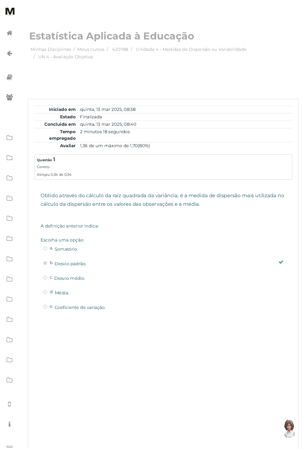 Minhas Disciplinas / Meus cursos / 420788 / Unidade 4 - Medidas de Dispersão ou Variabilidade / UN 4 - Avaliação Objetiva Estatística Aplicada à Educação Iniciado em quinta, 13 mar 2025, 08:38 Estado Finalizada Concluída em quinta, 13 mar 2025, 08:40 Tempo empregado 2 minutos 18 segundos Avaliar 1,36 de um máximo de 1,70(80%) Questão 1 Correto Atingiu 0,34 de 0,34 Obtido através do cálculo da raiz quadrada da variância, é a medida de dispersão mais utilizada no cálculo da dispersão entre os valores das observações e a média. A definição anterior indica: Escolha uma opção: a. Somatório. b. Desvio padrão. c. Desvio médio. d. Média. e. Coeficiente de variação. https://avap.multivix.edu.br/my/ https://avap.multivix.edu.br/course/view.php?id=33091 https://avap.multivix.edu.br/course/view.php?id=33091§ion=5 https://avap.multivix.edu.br/mod/quiz/view.php?id=1877532 https://avap.multivix.edu.br/my/ https://avap.multivix.edu.br/course/view.php?id=33091 https://avap.multivix.edu.br/user/index.php?id=33091 https://avap.multivix.edu.br/course/view.php?id=33091§ion=1 https://avap.multivix.edu.br/course/view.php?id=33091§ion=2 https://avap.multivix.edu.br/course/view.php?id=33091§ion=3 https://avap.multivix.edu.br/course/view.php?id=33091§ion=4 https://avap.multivix.edu.br/course/view.php?id=33091§ion=5 https://avap.multivix.edu.br/course/view.php?id=33091§ion=6 https://avap.multivix.edu.br/course/view.php?id=33091§ion=7 https://avap.multivix.edu.br/course/view.php?id=33091§ion=8 https://avap.multivix.edu.br/course/view.php?id=33091§ion=9 https://avap.multivix.edu.br/course/view.php?id=33091§ion=10 https://avap.multivix.edu.br/course/view.php?id=33091§ion=11 https://avap.multivix.edu.br/course/view.php?id=33091§ion=12 https://avap.multivix.edu.br/course/view.php?id=33091§ion=13 https://avap.multivix.edu.br/hooks/portal/ https://avap.multivix.edu.br/mod/page/view.php?id=1252%2F%22%20target%3D%22_blank https://avap.multivix.edu.br/calendar/view.php/ https://avap.multivix.edu.br/ https://avap.multivix.edu.br/ https://avap.multivix.edu.br/ https://avap.multivix.edu.br/ https://avap.multivix.edu.br/ Questão 2 Correto Atingiu 0,34 de 0,34 Questão 3 Correto Atingiu 0,34 de 0,34 Considerando o conceito da ciência Estatística e suas aplicações, assinale a opção que explica a utilidade das medidas de dispersão: Escolha uma opção: a. Proporciona identificar o quanto o posicionamento dos dados dentro da distribuição pode afetar o resultado dos demais parâmetros. b. Proporciona observar o comportamento de valores quando houver valores acima da média. c. Proporciona observar o comportamento de valores quando houver valores negativos. d. Proporciona encontrar o ponto médio entre valores de uma série. e. Não permite observar valores por apresentar elementos com padrões incomparáveis. Considerando o conteúdo apresentado na Unidade 4 - Medidas de Dispersão ou Variabilidade, marque a opção que indica o procedimento estatístico cujo objetivo é mensurar o quanto o posicionamento dos dados dentro da distribuição pode afetar o resultado dos demais parâmetros. Escolha uma opção: a. Média porque tem o objetivo de apontar onde se encontra o ponto de equilíbrio de uma série de valores ou frequência. b. Medidas de dispersão entre valores porque têm atribuição de medir o distanciamento de cada observação da média da distribuição. c. Somatório porque tem o objetivo de resumir um conjunto de dados em um único número. d. Covariância porque é uma medida da variabilidade conjunta das variáveis aleatórias. e. Medidas de dispersão entre valores porque têm a atribuição de apurar a média entre os valores da série. https://avap.multivix.edu.br/my/ https://avap.multivix.edu.br/course/view.php?id=33091 https://avap.multivix.edu.br/user/index.php?id=33091 https://avap.multivix.edu.br/course/view.php?id=33091§ion=1 https://avap.multivix.edu.br/course/view.php?id=33091§ion=2 https://avap.multivix.edu.br/course/view.php?id=33091§ion=3 https://avap.multivix.edu.br/course/view.php?id=33091§ion=4 https://avap.multivix.edu.br/course/view.php?id=33091§ion=5 https://avap.multivix.edu.br/course/view.php?id=33091§ion=6 https://avap.multivix.edu.br/course/view.php?id=33091§ion=7 https://avap.multivix.edu.br/course/view.php?id=33091§ion=8 https://avap.multivix.edu.br/course/view.php?id=33091§ion=9 https://avap.multivix.edu.br/course/view.php?id=33091§ion=10 https://avap.multivix.edu.br/course/view.php?id=33091§ion=11 https://avap.multivix.edu.br/course/view.php?id=33091§ion=12 https://avap.multivix.edu.br/course/view.php?id=33091§ion=13 https://avap.multivix.edu.br/hooks/portal/ https://avap.multivix.edu.br/mod/page/view.php?id=1252%2F%22%20target%3D%22_blank https://avap.multivix.edu.br/calendar/view.php/ https://avap.multivix.edu.br/ https://avap.multivix.edu.br/ https://avap.multivix.edu.br/ https://avap.multivix.edu.br/ https://avap.multivix.edu.br/ Questão 4 Incorreto Atingiu 0,00 de 0,34 As tabelas a seguir medem a dispersão das notas de duas turmas da nona série. Tabelas – Dispersão das notas da Turma A e da Turma B da nona série Considerando os dados que compõem cada tabela, assinale a resposta correta dentre as afirmativas a seguir. Escolha uma opção: a. A média da turma A é igual a 4,38, enquanto a média da turma B é igual a 4,41. b. A média da turma A é igual a 5,30, enquanto a variância da turma B é igual a 6,00. c. A variância da turma A é igual a 302, enquanto a média da turma B é igual a 324. d. A variância da turma A é igual a 5,30, enquanto a variância da turma B é igual a 6,00. e. A variância da turma A é igual a 4,38, enquanto a variância da turma B é igual a 4,41. https://avap.multivix.edu.br/my/ https://avap.multivix.edu.br/course/view.php?id=33091 https://avap.multivix.edu.br/user/index.php?id=33091 https://avap.multivix.edu.br/course/view.php?id=33091§ion=1 https://avap.multivix.edu.br/cour