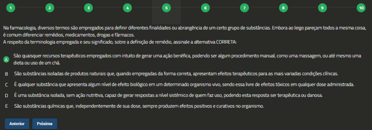 1 2 10 Na farmacologia, diversos termos são empregados para definir diferentes finalidades ou abrangência de um certo grupo de substâncias. Embora ao leigo pareçam todos a mesma coisa, é comum diferenciar remédios, medicamentos, drogas e fármacos. A respeito da terminologia empregada e seu significado, sobre a definição de remédio, assinale a alternativa CORRETA: São quaisquer recursos terapêuticos empregados com intuito de gerar uma ação benéfica, podendo ser algum procedimento manual, como uma massagem, ou até mesmo uma A dieta ou uso de um B São substâncias isoladas de produtos naturais que, quando empregadas da forma correta, apresentam efeitos terapêuticos para as mais variadas condições clínicas. É qualquer substância que apresenta algum nível de efeito biológico em um determinado organismo vivo, sendo essa livre de efeitos tóxicos em qualquer dose administrada. D É uma substância isolada, sem ação nutritiva, capaz de gerar respostas a nível sistêmico de quem faz uso, podendo esta resposta ser terapêutica ou E São substâncias químicas que, independentemente de sua dose, sempre produzem efeitos positivos e curativos no organismo. Anterior Próxima1 2 3 5 10 sistema cardiovascular desempenha um papel vital na manutenção da saúde e do funcionamento adequado do corpo humano. É essencial cuidar da saúde cardiovascular através de de vida saudáveis, como uma dieta balanceada, exercícios regulares, não fumar, controle do estresse e acompanhamento médico regular para prevenir doenças cardiovasculares e promover uma vida longa e saudável. No contexto da farmacologia, indique qual é efeito dos agentes que bloqueiam a produção ou ação da angiotensina no sistema cardiovascular. A Aumentam apenas a resistência vascular periférica. B Aumentam a pressão intravascular através da redução do volume Aumentam a resistência vascular periférica e volume D Reduzem apenas volume sanguíneo. E Reduzem a resistência vascular periférica e volume Anterior Próxima1 2 3 6 7 10 Após a fase inicial de pesquisa pré-clínica de um potencial medicamento, na qual são realizados testes laboratoriais (in vitro) e em animais (in vivo) para avaliar sua segurança e processo de desenvolvimento de um novo fármaco avança para uma fase crucial. Neste estágio, os pesquisadores esperam que os resultados promissores obtidos na fase pré-clínica sejam confirmados. Indique qual dos seguintes procedimentos ocorre após a fase de pesquisa inicial pré-clínica de um potencial medicamento apresentar resultados promissores. A Aprovação imediata pela ANVISA para comercialização. B Testes clínicos em humanos. apenas em laboratório sem testes em animais (in vitro). D Lançamento imediato no mercado farmacêutico para dispensação. E Testes em plataformas in Anterior Próxima1 2 5 7 10 A farmacologia é uma ciência interdisciplinar que estuda os efeitos das substâncias químicas nos organismos vivos, com foco principal nos medicamentos e outras drogas. Ela abrange diversas áreas de estudo, cada uma com suas e objetivos específicos. Indique qual das seguintes áreas de estudo da farmacologia está relacionada ao preparo e conservação das formas A Farmacologia B Farmacocinética D Farmacognosia E Farmacotécnica. Anterior Próxima1 2 5 10 A Fase III dos testes clínicos representa um estágio crucial no processo de desenvolvimento e avaliação de novos medicamentos antes de sua aprovação para uso generalizado. Acerca da Fase III dos testes clínicos, analise as afirmativas a seguir: I- Durante a Fase III dos testes clínicos, medicamento é administrado a um grupo significativamente maior de pacientes para avaliar sua eficácia e segurança em uma escala mais ampla. II- Uma característica importante da Fase III é a comparação do medicamento em teste com tratamento padrão existente no mercado ou com um grupo que recebe placebo, para determinar sua eficácia em relação às opções já disponíveis. III- Os pacientes participantes da Fase III são geralmente divididos em dois grupos: o grupo controle, que recebe tratamento padrão ou placebo, e grupo investigacional, que recebe novo medicamento em teste, permitindo assim uma análise comparativa dos resultados. IV- Na fase III, foco da pesquisa é elucidar mecanismo de ação do fármaco testado.Assinale a alternativa que apresenta a CORRETA: A III e IV, apenas. B I e IV, apenas. I, II e III, apenas. D I, III e IV, apenas. E II e III, apenas. Próxima