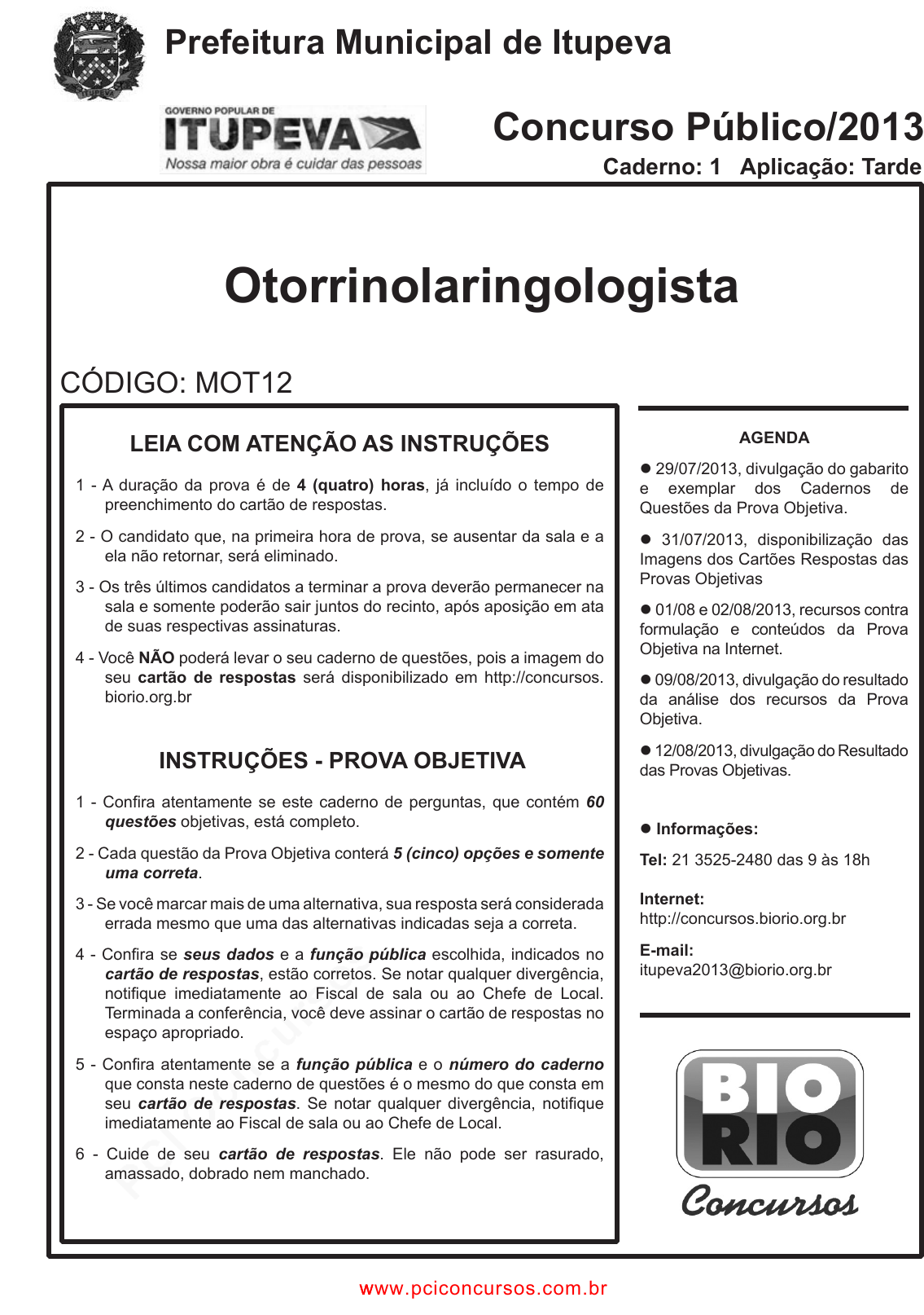 pcimarkpci MDAwMDowMDAwOjAwMDA6MDAwMDowMDAwOmZmZmY6YjViZjozZTlj:VGh1LCAxMyBNYXIgMjAyNSAxMDowNjo1MCAtMDMwMA== www.pciconcursos.com.br Otorrinolaringologista AGENDA l 29/07/2013, divulgação do gabarito e exemplar dos Cadernos de Questões da Prova Objetiva. l 31/07/2013, disponibilização das Imagens dos Cartões Respostas das Provas Objetivas l 01/08 e 02/08/2013, recursos contra formulação e conteúdos da Prova Objetiva na Internet. l 09/08/2013, divulgação do resultado da análise dos recursos da Prova Objetiva. l 12/08/2013, divulgação do Resultado das Provas Objetivas. l Informações: Tel: 21 3525-2480 das 9 às 18h Internet: http://concursos.biorio.org.br E-mail: itupeva2013@biorio.org.br LEIA COM ATENÇÃO AS INSTRUÇÕES 1 - A duração da prova é de 4 (quatro) horas, já incluído o tempo de preenchimento do cartão de respostas. 2 - O candidato que, na primeira hora de prova, se ausentar da sala e a ela não retornar, será eliminado. 3 - Os três últimos candidatos a terminar a prova deverão permanecer na sala e somente poderão sair juntos do recinto, após aposição em ata de suas respectivas assinaturas. 4 - Você NÃO poderá levar o seu caderno de questões, pois a imagem do seu cartão de respostas será disponibilizado em http://concursos. biorio.org.br INSTRUÇÕES - PROVA OBJETIVA 1 - Confira atentamente se este caderno de perguntas, que contém 60 questões objetivas, está completo. 2 - Cada questão da Prova Objetiva conterá 5 (cinco) opções e somente uma correta. 3 - Se você marcar mais de uma alternativa, sua resposta será considerada errada mesmo que uma das alternativas indicadas seja a correta. 4 - Confira se seus dados e a função pública escolhida, indicados no cartão de respostas, estão corretos. Se notar qualquer divergência, notifique imediatamente ao Fiscal de sala ou ao Chefe de Local. Terminada a conferência, você deve assinar o cartão de respostas no espaço apropriado. 5 - Confira atentamente se a função pública e o número do caderno que consta neste caderno de questões é o mesmo do que consta em seu cartão de respostas. Se notar qualquer divergência, notifique imediatamente ao Fiscal de sala ou ao Chefe de Local. 6 - Cuide de seu cartão de respostas. Ele não pode ser rasurado, amassado, dobrado nem manchado. CÓDIGO: MOT12 Concurso Público/2013 Caderno: 1 Aplicação: Tarde Prefeitura Municipal de Itupeva www.pciconcursos.com.br www.pciconcursos.com.br pcimarkpci MDAwMDowMDAwOjAwMDA6MDAwMDowMDAwOmZmZmY6YjViZjozZTlj:VGh1LCAxMyBNYXIgMjAyNSAxMDowNjo1MCAtMDMwMA== www.pciconcursos.com.br OTORRINOLARINGOLOGISTA CADERNO 1 2 LÍNGUA PORTUGUESA TEXTO NORDESTINOS SÃO VÍTIMAS DE PRECONCEITOS Gilberto Dimenstein Muitos costumam desqualificar os nordestinos ao associar a migração para as grandes cidades como São Paulo, à criminalidade. O certo é que a miséria estimula a violência, e a migração, em tempos de pouco emprego, é um ingrediente de degradação urbana. Mas o preconceito de determinado tipo de paulistano contra os nordestinos existe e, assim como o preconceito racial, não é discutido nem assumido. Não são poucos os que veem os migrantes (assim como eram vistos os imigrantes) não como gente disposta a prosperar e trabalhar, mas estorvos que geram pobreza e mesmo violência. Crianças paulistanas acostumam-se a ouvir o substantivo baiano transformado em adjetivo genérico e negativo para designar os nordestinos. Há um indício claro desse preconceito, graças em larga medida ao próprio Poder Público. São Paulo é a maior cidade com presença nordestina no Brasil, mas até hoje (e quase ninguém nem sequer pensa no assunto) não se imaginou um museu para contar a história da presença dos nordestinos na cidade, ao contrário do que existe para italianos, espanhóis, portugueses e judeus. Fala-se, e muito, na introdução nos currículos escolares da questão africana para estudar o negro. Justo, claro. Mas raras escolas estimulam seus professores a discutir com os alunos a questão nordestina. Quando ocorre, geralmente é pelo lado depreciativo, como a pobreza das migrações. 1 - Sobre os preconceitos ligados a nordestinos, a única afirmativa NÃO condizente com o texto de Gilberto Dimenstein é: (A) os preconceitos existem, mas não são assumidos ou discutidos; (B) os nordestinos são vistos por muitos como fonte de violência; (C) a linguagem também mostra traços de preconceitos contra nordestinos; (D) ao contrário dos africanos, os nordestinos não fazem parte de discussões escolares; (E) a história dos nordestinos não é valorizada pelas autoridades. 2 - Segundo o texto, associar a migração para as grandes cidades à criminalidade é: (A) correto, já que a miséria estimula a violência; (B) injusto, pois muitos se dispõem a prosperar e a trabalhar; (C) adequado, já que a migração da pobreza degrada as grandes cidades; (D) incorreto, visto que muitos dos nordestinos prosperaram economicamente; (E) justo, pois as migrações aumentam o desemprego. 3 - “O certo é que a miséria estimula a violência”; assinale a forma de reescrever-se essa frase do texto que altera o seu significado original: (A) O que é certo é que a miséria estimula a violência; (B) Que a miséria estimula a violência, é certo; (C) A miséria, é certo, estimula a violência; (D) A miséria, é certo, é estimulada pela violência; (E) A miséria estimula, é certo, a violência. 4 - “Crianças paulistanas acostumam-se a ouvir o substantivo baiano transformado em adjetivo genérico e negativo para designar os nordestinos”; uma frase que exemplificaria essa afirmação do autor do texto é: (A) Os produtos baianos chegam a São Paulo todos os dias. (B) Os baianos chegam à rodoviária em ônibus de todo o Nordeste. (C) Os operários baianos são os mais preguiçosos entre os nordestinos. (D) O sotaque baiano é mais forte que o pernambucano. (E) O baiano que trabalha na portaria é de Salvador. 5 - 