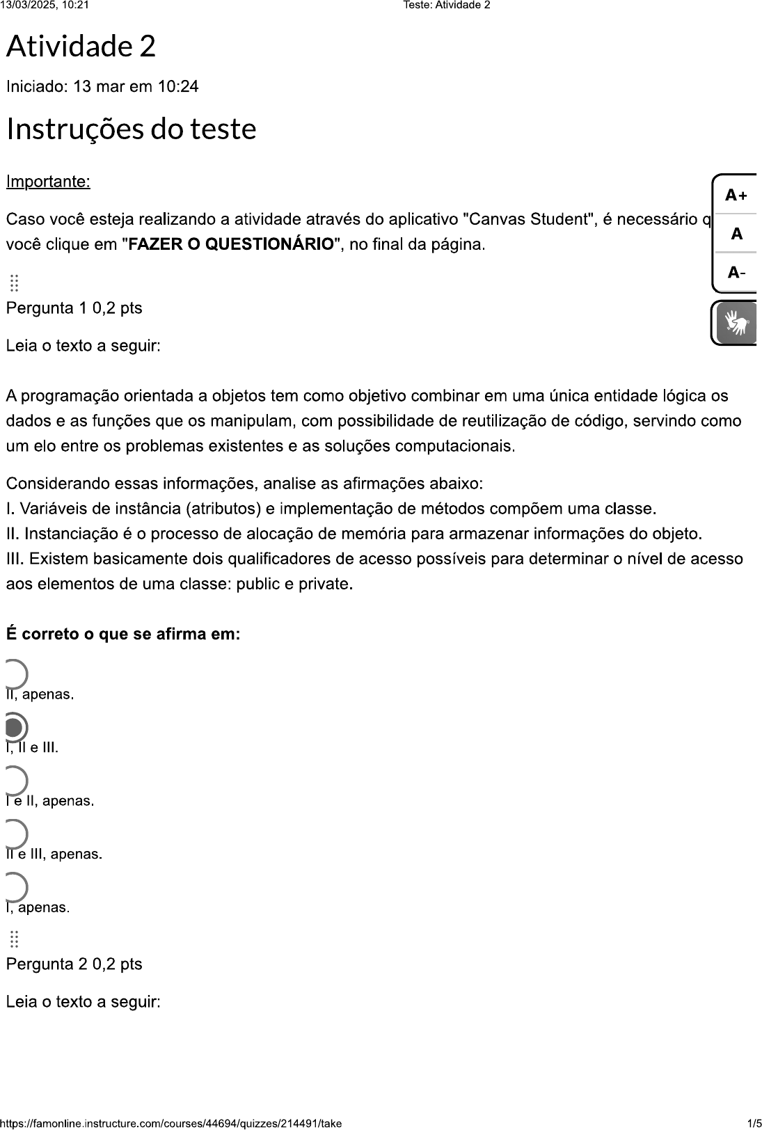 13/03/2025, 10:21 Teste: Atividade 2 Atividade 2 Iniciado: 13 mar em 10:24 Instruções do teste Importante: A+ Caso você esteja realizando a atividade através do aplicativo "Canvas Student", é necessário q A você clique em "FAZER o QUESTIONÁRIO", no final da página. A- Pergunta 1 0,2 pts Leia o texto a seguir: A programação orientada a objetos tem como objetivo combinar em uma única entidade lógica os dados e as funções que os manipulam, com possibilidade de reutilização de código, servindo como um elo entre os problemas existentes e as soluções computacionais. Considerando essas informações, analise as afirmações abaixo: I. Variáveis de instância (atributos) e implementação de métodos compõem uma classe. II. Instanciação é o processo de alocação de memória para armazenar informações do objeto. III. Existem basicamente dois qualificadores de acesso possíveis para determinar o nível de acesso aos elementos de uma classe: public e private. É correto o que se afirma em: II, apenas. e III. II, apenas. III, apenas. apenas. Pergunta 2 0,2 pts Leia o texto a seguir: https://famonline.instructure.com/courses/44694/quizzes/214491/take 1/513/03/2025, 10:21 Teste: Atividade 2 Uma classe na linguagem Java pode ser um tipo de dado usado pelo programador com a instrução class, ou um objeto já definido em algum pacote interno da linguagem. Uma classe possui a característica de agregar objetos, formando um conjunto de objetos (quando houver mais de um objeto definido em uma determinada classe), os quais possuem características de armazenamento de dados (seus atributos) e funcionalidades (seus métodos). Uma classe é declarada com a instrução class, que possui a seguinte sintaxe: A+ class [] { A A- Fonte: MANZANO, J.A. N. G. Java 7: programação de computadores: guia prática de introdução, orientação e desenvolvimento. São Paulo: Érica, 2011. o qualificador é um elemento opcional e, quando usado, deve ser representado por this. public, abstract ou final. int, float, double ou String public, private ou protected. static ou void. Pergunta 3 0,2 pts Leia o texto a seguir: Usando os métodos set e get, você pode validar tentativas de modificações nos dados private e controlar como os dados são apresentados para o chamador esses são benefícios convincentes da engenharia de software. (...) Se a variável de instância fosse public, qualquer cliente da classe https://famonline.instructure.com/courses/44694/quizzes/214491/tal 2/513/03/2025, 10:21 Teste: Atividade 2 isto é, qualquer outra classe que chama os métodos de classe - poderia ver os dados e fazer o que quisesse com eles, inclusive configurá-los como um valor inválido. Fonte: DEITEL, H.; DEITEL, P. Java: como programar. 10. ed. São Paulo: Pearson Education do Brasil, 2017. p. 63. A+ Considerando o que você estudou sobre abstração, analise as afirmações abaixo: A A- I. Atributos representam o estado de um objeto, por armazenar informações particulares sobre outro. II. Métodos representam habilidades de um objeto, por conterem instruções que serão executadas utilizando o estado do objeto. III. Atributos devem ser públicos, caso contrário o estado de um objeto seria constante. IV. Métodos devem ser privados, caso contrário entidades externas poderão interferir no funcionamento do objeto. São corretas as afirmações: III e IV, apenas. e III, apenas. e II, apenas. e IV, apenas. e IV, apenas. Pergunta 4 0,2 pts Leia o trecho a seguir: 3/513/03/2025, 10:21 Teste: Atividade 2 "Todo o código deve estar em alguma classe, pois quando executamos algum aplicativo java nós estamos, na verdade, executando uma classe". DEVMEDIA. Entendendo a estrutura de um código Java. 2005 Disponível em: https://www.devmedia.com.br/entendendo-a-estrutura-de-um-codigo-java/24622 em 29 A+ maio de 2023. A A- Examinando a linha de código em Java Aluno al = new Aluno();, define-se al como um atributo da classe um objeto da classe Aluno. um método da classe Aluno. um método do objeto Aluno. ) um atributo do objeto Aluno. Pergunta 5 0,2 pts Leia o texto a seguir: A maioria das declarações de variável de instância é precedida pela palavra-chave private. Da mesma forma que public, private é um modificador de acesso. As variáveis ou métodos declarados com o modificador de acesso private só são acessíveis a métodos da classe em que isso ocorre. Fonte: DEITEL, H.: DEITEL, P. Java: como programar. 10. ed. São Paulo: Pearson Education do Brasil, 2017. p. 58 Considerando o padrão para garantir o encapsulamento das classes, avalie as afirmações a seguir: I. O método get recebe um atributo como parâmetro. https://famonline.instructure.com/courses/44694/quizzes/214491/take 4/513/03/2025, 10:21 Teste: Atividade 2 II. método set retorna um atributo. III. Métodos get e set podem ser públicos. A+ IV. Devemos criar get e set para todos os atributos. A A- É correto o que se afirma em: e IV, apenas. ) II, apenas. III, apenas. IV, apenas. e III, apenas. Salvo em 10:21 Enviar teste https://famonline.instructure.com/courses/44694/quizzes/214491/take 5/5