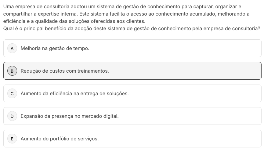 Uma empresa de consultoria adotou um sistema de gestão de conhecimento para capturar, organizar e compartilhar a expertise interna. Este sistema facilita acesso ao conhecimento acumulado, melhorando a eficiência e a qualidade das soluções oferecidas aos clientes. Qual é principal benefício da adoção deste sistema de gestão de conhecimento pela empresa de consultoria? A Melhoria na gestão de tempo. B Redução de custos com treinamentos. C Aumento da eficiência na entrega de soluções. D Expansão da presença no mercado E Aumento do portfólio de serviços.
