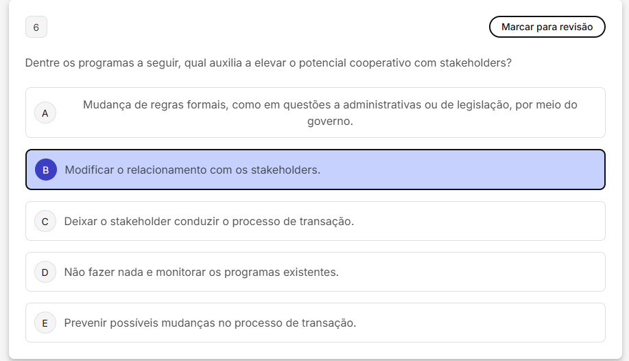 6 Marcar para revisão Dentre os programas a seguir, qual auxilia a elevar potencial cooperativo com stakeholders? Mudança de regras formais, como em questões a administrativas ou de legislação, por meio do A governo. B Modificar relacionamento com os stakeholders. C Deixar stakeholder conduzir O processo de transação. D Não fazer nada e monitorar os programas existentes. E Prevenir possíveis mudanças no processo de transação.