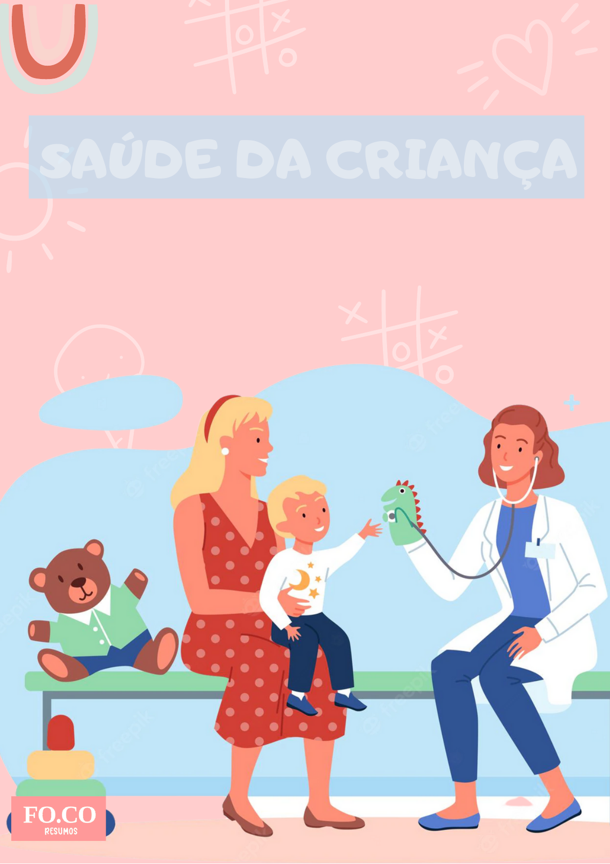SAÚDE DA CRIANÇASAÚDE DA CRIANÇA RESUMOS ILUSTRADOS Licenciado para - M árcio José de B rito - 00195870581 - P rotegido por E duzz.com Olá, tudo bem? Gostaríamos de te agradecer por adquirir um material do @focoresumos. O nosso material é feito com amor para te ajudar a alcançar o seus objetivos nos estudos. Esperamos que você goste e que se sinta bem ao estudar. Este conteúdo destina-se exclusivamente a exibição privada. É proibida toda forma de reprodução, distribuição ou comercialização do conteúdo. Qualquer meio de compartilhamento, seja por google drive, torrent, mega, whatsapp, redes sociais ou quaisquer outros meios se classificam como ato de pirataria, conforme o art. 184 do Código Penal. Caso haja pirataria do material, o cliente registrado no produto estará sujeito a responder criminalmente, conforme o artigo 184 do Código Penal com pena de 3 meses a 4 anos de reclusão ou multa de até 10x o valor do produto adquirido (segundo o artigo 102 da Lei nº 9.610) Entretanto, acreditamos que você é uma pessoa de bem que está buscando se capacitar através dos estudos e que jamais faria uma coisa dessa não é? A equipe Foco Resumos agradece a compreensão e deseja a você um ótimo estudo. Está com alguma dúvida? Envia para suporte@focoresumos.com SAÚDE DA CRIANÇA Licenciado para - M árcio José de B rito - 00195870581 - P rotegido por E duzz.com SAÚDE DA CRIANÇA 1.ASSISTÊNCIA AO RECÉM NASCIDO E REANIMAÇÃO NEONATAL......................................................................01 1.1 PREPARO PARA ATENDER RN EM SALA DE PARTO............................................................................................01 1.2 CUIDADOS NA HORA DO NASCIMENTO..........................................................................................................01 1.2.1 ANAMNESE MATERNA (FATORES ANTENATAIS E FATORES RELACIONADOS AO PARTO..................01 1.3 DISPONIBILIDADE DE MATERIAL PARA O ATENDIMENTO ............................................................................01 1.4 PRESENÇA DE EQUIPE TREINADA EM REANIMAÇÃO NEONATAL................................................................02 1.5 AVALIAÇÃO DA VITALIDADE AO NASCER.........................................................................................................02 1.6 ASSISTÊNCIA IMEDIATA AO RN...........................................................................................................................03 1.7 ASSISTÊNCIA MEDIATA AO RN (VITAMINA K, PROFILAXIA DA OFTALMIA NEONATAL.............................03 1.8 ÍNDICE DE APGAR..................................................................................................................................................04 1.9 CUIDADOS PRESTADOS NO ALOJAMENTO CONJUNTO..............................................................................04 2. REANIMAÇÃO NEONATAL....................................................................................................................05 2.1 INTRODUÇÃO.......................................................................................................................................................05 2.2 PREPARO PARA ASSISTÊNCIA.............................................................................................................................05 2.3 PASSOS INICIAIS DA ESTABILIZAÇÃO.............................................................................................................. 05 2.4 VENTILAÇÃO POR PRESSÃO POSITIVA (VPP)..................................................................................................06 2.5 MASSAGEM CARDÍACA....................................................................................................................................... 06 3. ALEITAMENTO MATERNO.........................................................................................................................................07 3.1 INTRODUÇÃO.......................................................................................................................................................07 3.2 DEFINIÇÃO ...........................................................................................................................................................07 3.3 PRINCIPAIS VANTAGENS ...................................................................................................................................07 3.4 FISIOLOGIA DA AMAMENTAÇÃO.......................................................................................................................07 3.5 TIPOS DE POSIÇÕES.............................................................................................................................................08 3.6 DIFICULDADES......................................................................................................................................................08 3.6 TÉCNICA.................................................................................................................................................................08 3.7 O LEITE MATERNO................................................................................................................................................09 3.8 MANEJO ................................................................................................................................................................ 09 3.9 RELACTAÇÃO.........................................................................................................................................................09 3.10 ORDENHA .............................................................................................................................................................10 3.8 CONTRA INDICAÇÕES ........................................................................................................................................ 10 3