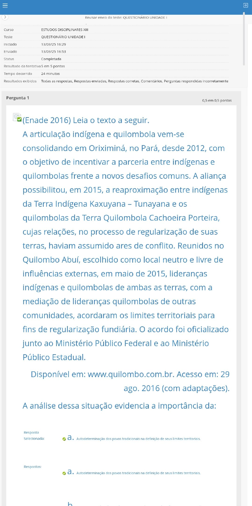 Revisar envio do teste: QUESTIONÁRIO UNIDADE I Curso ESTUDOS DISCIPLINARES XIII Teste QUESTIONÁRIO UNIDADE I Iniciado 13/03/25 16:29 Enviado 13/03/25 16:53 Status Completada Resultado da tentativa 5 em 5 pontos Tempo decorrido 24 minutos Resultados exibidos Todas as respostas, Respostas enviadas, Respostas corretas, Comentários, Perguntas respondidas incorretamente Pergunta 1 em 0,5 pontos (Enade 2016) Leia o texto a seguir. A articulação indígena e quilombola vem-se consolidando em Oriximiná, no Pará, desde 2012, com o objetivo de incentivar a parceria entre indígenas e quilombolas frente a novos desafios comuns. A aliança possibilitou, em 2015, a reaproximação entre indígenas da Terra Indígena Kaxuyana - Tunayana e os quilombolas da Terra Quilombola Cachoeira Porteira, cujas relações, no processo de regularização de suas terras, haviam assumido ares de conflito. Reunidos no Quilombo Abuí, escolhido como local neutro e livre de influências externas, em maio de 2015, lideranças indígenas e quilombolas de ambas as terras, com a mediação de lideranças quilombolas de outras comunidades, acordaram os limites territoriais para fins de regularização fundiária. acordo foi oficializado junto ao Ministério Público Federal e ao Ministério Público Estadual. Disponível em: www.quilombo.com.br. Acesso em: 29 ago. 2016 (com adaptações). A análise dessa situação evidencia a importância da: Resposta Selecionada: a. Autodeterminação dos povos tradicionais na definição de seus limites Respostas: a. Autodeterminação dos povos na definição de seus limitesRevisar envio do teste: QUESTIONÁRIO UNIDADE Pergunta 2 0,5 em 0,5 pontos Leia os quadrinhos a seguir. QUADRINHOS ÁCIDOS EM A TELA DO MEU E MAIS FACIL UMA PECINHA E MAIS FÁCIL IPHONE COMPRAR DO MEU COMPRAR UM CELULAR NOVO! QUEBROUS RÁDIO NOVO! É MAIS FÁCIL DESCARTAR LETTE MEU CASACO E MAIS UMA PECINHA DA MAIS FÁCIL MEU E MAIS RASGOU UM COMPRAR UM MINHA DE COMPRAR UMA COMPUTADOR COMPRAR CASACO NOVO! LAVAR QUEBROU! MÁQUINA MEIO DEVAGAR! UM NOVO! ALCA DA MAIS FÁCIL MEU TENIS MAIS FACIL AH, MAIS MINHA COMPRAR UMA DESCOLANDO COMPRAR UM FICANDO ARRANJAR UM QUEBROU! XICARA NOVA! SOLA! TENIS NOVO! MUITO CHATO! NAMORADO NOVO! Fonte: http://www.quadrinhosacidos.co m.br/2015/07/89-e-mais-facil-descartar.html?m= Acesso em: 17 dez. 2015. Com base na leitura, avalie as afirmativas e assinale a alternativa correta. I. O objetivo dos quadrinhos é criticar o discurso da descartabilidade da sociedade contemporânea, na qual os objetos e as relações pessoais tendem à efemeridade. II. Os quadrinhos enaltecem a sociedade contemporânea, na qual problemas são resolvidos rapidamente com a substituição de produtos. III. A crítica dos quadrinhos concentra-se no machismo, uma vez que os homens esperam que as mulheres resolvam seus problemas cotidianos. Resposta Selecionada: C. Apenas a afirmativa correta.Revisar envio do teste: QUESTIONÁRIO UNIDADE I ALCA DA MAIS FACIL o MEU TENIS TA E MAIS FACIL VOCE TA E MAIS FACIL MINHA COMPRAR UMA DESCOLANDO COMPRAR UM FICANDO ARRANJAR UM QUEBROU! XICARA NOVA! A SOLA! TENIS NOVO! MUITO CHATO! NAMORADO NOVO! Fonte: http://www.quadrinhosacidos.co Acesso em: 17 dez. 2015. Com base na leitura, avalie as afirmativas e assinale a alternativa correta. objetivo dos quadrinhos é criticar o discurso da descartabilidade da sociedade contemporânea, na qual os objetos e as relações pessoais tendem à efemeridade. II. Os quadrinhos enaltecem a sociedade contemporânea, na qual problemas são resolvidos rapidamente com a substituição de produtos. III. A crítica dos quadrinhos concentra-se no machismo, uma vez que os homens esperam que as mulheres resolvam seus problemas cotidianos. Resposta Selecionada: C. Apenas a afirmativa I é correta. Respostas: a. Apenas as afirmativas são b. Apenas as afirmativas le III são C. Apenas a afirmativa correta. d. Apenas a afirmativa> Revisar envio do teste: QUESTIONÁRIO UNIDADE I Pergunta 3 0,5 em 0,5 pontos Leia a charge e a crônica a seguir. Fonte:http://fotografia.folha.uol.com.br/galerias/389 41-charges-outubro-de-2015#foto-562881. Acesso em: 10 dez. 2015. A Foto Luís Fernando Veríssimo Foi numa festa de família, dessas de fim de ano. Já que o bisavô estava morre não morre, decidiram tirar uma fotografia de toda a família reunida, talvez pela última vez. A bisa e o biso sentados, filhos, filhas, noras, genros e netos em volta, bisnetos na frente, esparramados pelo chão. Castelo, o dono da câmera, comandou a pose, depois tirou o olho do visor e ofereceu a câmera a quem ia tirar a fotografia. Mas quem ia tirar a fotografia? Tira você mesmo, Ah, é? E eu não saio na foto? O Castelo era o genro mais velho. O primeiro genro. O que sustentava os velhos. Tinha que estar na fotografia. Tiro eu - disse o marido da Bitinha. Você fica aqui comandou a Bitinha. Havia certa resistência ao marido da Bitinha na família. A Bitinha, orgulhosa, insistia para que o marido reagisse. "Não deixa eles to milharem, Mário Cesar", dizia sempre. O Mário C ^ ou firme onde estava, do lado da mulher. A própria Bitinha fez a sugestão> Revisar envio do teste: QUESTIONÁRIO UNIDADE I L. para se na Janeiro: Objetiva, 2001. Com base na leitura, avalie as afirmativas e assinale a alternativa correta. I. A charge e o texto têm em comum a ideia de que uma fotografia é um relato objetivo e fidedigno da realidade. II. A charge e o texto mostram que as inovações tecnológicas melhoram a vida das pessoas, uma vez que, na crônica, a falta de dispositivos avançados impediu o registro da família toda. III. A charge e o texto mostram a foto como um registro que tem como objetivo expor situações positivas do cotidiano, visando ao olhar de aprovação dos outros nas redes sociais. Resposta Selecionada: a. Nenhuma afirmativa é correta. Respostas: a. Nenhuma afirmativa é correta. b. Apenas as afirmativas e III são C. Apenas as afirmativas são d. Apenas a afirmati