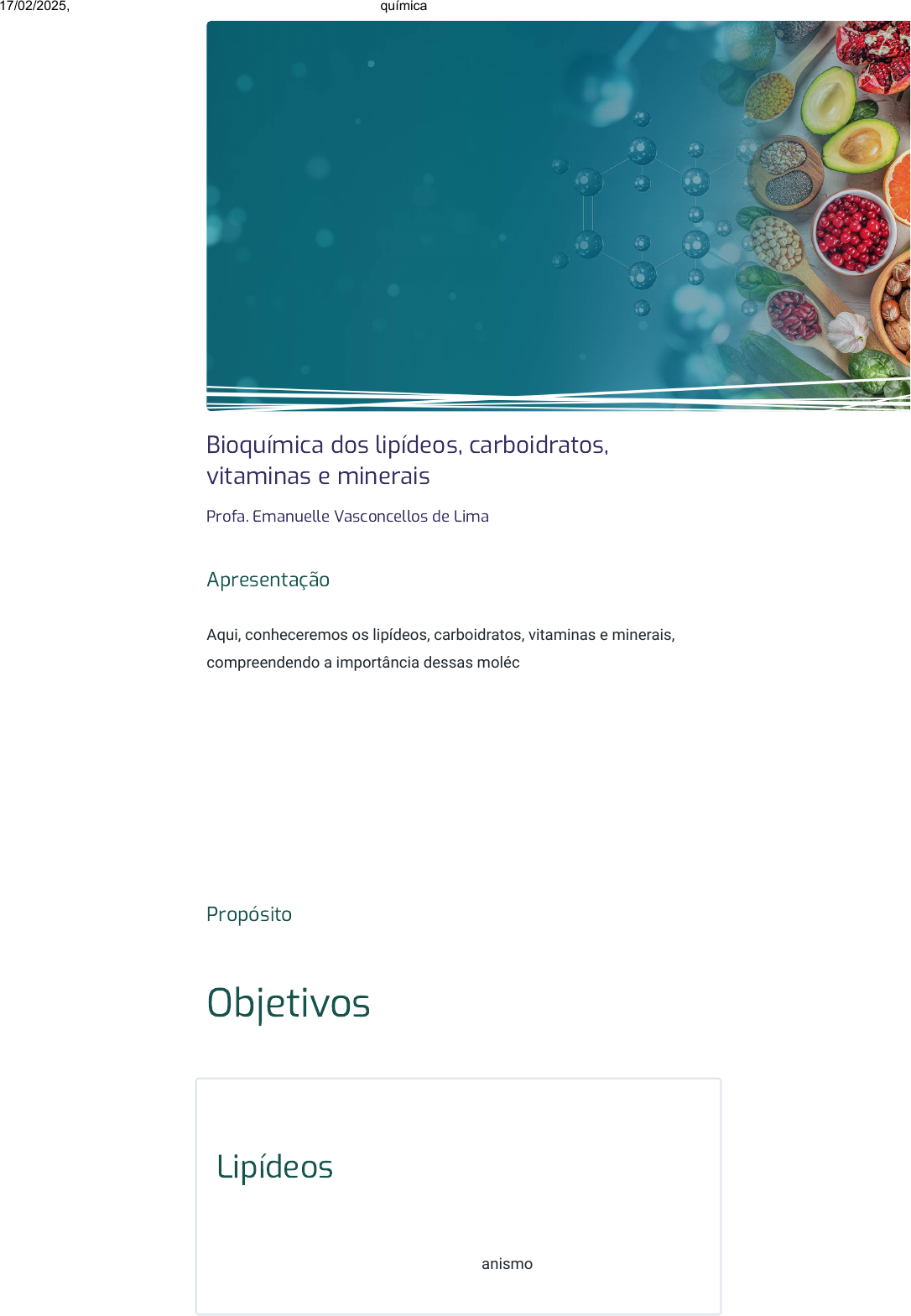 Bioquímica dos lipídeos, carboidratos, vitaminas e minerais Profa. Emanuelle Vasconcellos de Lima Apresentação Aqui, conheceremos os lipídeos, carboidratos, vitaminas e minerais, compreendendo a importância dessas moléculas biológicas na manutenção da homeostasia do organismo e no funcionamento dos sistemas biológicos. Veremos ainda a digestão de lipídeos, o transporte de glicose e o papel crucial das vitaminas e minerais em processos fisiológicos. Esse conhecimento é essencial para profissionais de saúde de diferentes áreas, pois fornece a base científica necessária para entender os mecanismos fundamentais que sustentam a saúde e o bem-estar, além de orientar práticas clínicas e terapêuticas eficazes. Propósito Objetivos Módulo 1 Lipídeos Identificar as propriedades físico-químicas dos lipídeos, seus diferentes tipos e suas funções no organismo 17/02/2025, 15:25 Bioquímica dos lipídeos, carboidratos, vitaminas e minerais https://stecine.azureedge.net/repositorio/00212sa/47246/index.html?brand=estacio# 1/63 Módulo 2 Carboidratos Reconhecer as propriedades físico-químicas dos carboidratos, sua classificação e suas funções no organismo, e o transporte de glicose para dentro das células Módulo 3 Vitaminas e minerais Descrever vitaminas e minerais, suas principais funções no organismo e a importância dessas classes no funcionamento dos sistemas biológicos Introdução Neste conteúdo, você mergulhará no estudo das moléculas que são fundamentais para o funcionamento do nosso organismo: lipídeos, carboidratos, vitaminas e minerais. Vamos explorar como essas substâncias atuam para manter o equilíbrio interno do corpo e garantir a homeostasia do organismo. Discutiremos ainda como os lipídeos são digeridos e utilizados como fonte de energia, o papel do transporte de glicose no fornecimento de combustível para as células, e a importância das vitaminas e minerais na regulação de funções biológicas essenciais. Esses conhecimentos não são apenas teóricos, mas têm uma aplicação direta e prática na área da saúde, influenciando diagnósticos, tratamentos e a prevenção de doenças. Para profissionais de saúde, dominar esses conceitos é fundamental, pois entender esses componentes é essencial para compreender como o corpo humano processa e utiliza nutrientes 17/02/2025, 15:25 Bioquímica dos lipídeos, carboidratos, vitaminas e minerais https://stecine.azureedge.net/repositorio/00212sa/47246/index.html?brand=estacio# 2/63 em atividades vitais para que estejamos preparados para cuidar das pessoas dentro de nossas áreas de atuação. Material para download Clique no botão abaixo para fazer o download do conteúdo completo em formato PDF. Download material 1 - Lipídeos Ao final deste módulo, você será capaz de identificar as propriedades físico-químicas dos lipídeos, seus diferentes tipos e suas funções no organismo. Quem são os lipídeos? Neste vídeo, a especialista explica o que são os lipídeos e suas características, como são classificados e suas diferentes funções no organismo. 17/02/2025, 15:25 Bioquímica dos lipídeos, carboidratos, vitaminas e minerais https://stecine.azureedge.net/repositorio/00212sa/47246/index.html?brand=estacio# 3/63 javascript:CriaPDF() São moléculas biológicas que exibem uma grande variedade estrutural. Formados a partir da associação entre ácidos graxos e álcool, são compostos heterogêneos pouco solúveis em água. Essas moléculas apresentam um esqueleto de carbonos (C) associado a átomos de oxigênio (O) e hidrogênio (H), mas também podem conter outros elementos, como enxofre (S), nitrogênio (N) e fósforo (P). Cadeia de lipídeos. Alguns lipídeos estão combinados a outras classes de compostos, tais como proteínas (lipoproteínas) e carboidratos (glicolipídeos). Eles participam como componentes não proteicos das membranas biológicas, como precursores de compostos essenciais, agentes emulsificantes, isolantes, vitaminas, fonte e transporte de combustível metabólico. Também são componentes de biossinalização intra e intercelular. Contêm maior quantidade de energia que os carboidratos e não precisam de água para hidratá-las. Por isso, trazem uma vantagem em relação a eles no que diz respeito ao seu armazenamento. Classificação dos lipídeos Os lipídeos são classificados de acordo com a sua estrutura. A forma mais simples de classificação é a seguinte. Confira! São líquidos à temperatura ambiente. Eles geralmente contêm ácidos graxos insaturados que possuem uma ou mais ligações Óleos 17/02/2025, 15:25 Bioquímica dos lipídeos, carboidratos, vitaminas e minerais https://stecine.azureedge.net/repositorio/00212sa/47246/index.html?brand=estacio# 4/63 duplas em sua cadeia de carbono. Essas ligações duplas criam "dobras" na estrutura molecular, impedindo que as moléculas se empilhem de forma compacta, o que resulta em um estado líquido. Os óleos são comuns em plantas, como no caso do azeite de oliva, óleo de soja e óleo de canola. São sólidos à temperatura ambiente. Elas contêm predominantemente ácidos graxos saturados que possuem apenas ligações simples entre os átomos de carbono em sua cadeia. Essas cadeias lineares permitem que as moléculas se empilhem mais compactamente, resultando em um estado sólido. Exemplos comuns incluem manteiga e gordura animal. As gorduras são tipicamente encontradas em fontes animais, mas também podem estar presentes em algumas plantas, como no óleo de coco. São sólidos à temperatura ambiente, mas com uma estrutura diferente das gorduras. Elas são compostas por ácidos graxos de cadeia longa esterificados com álcoois de cadeia longa, ao invés de glicerol (como nos óleos e gorduras). Essa estrutura confere às ceras propriedades hidrofóbicas muito fortes, tornando-as úteis como revestimentos impermeabilizantes na natureza, como nas folhas de plantas ou na cera de abelhas. As ceras são