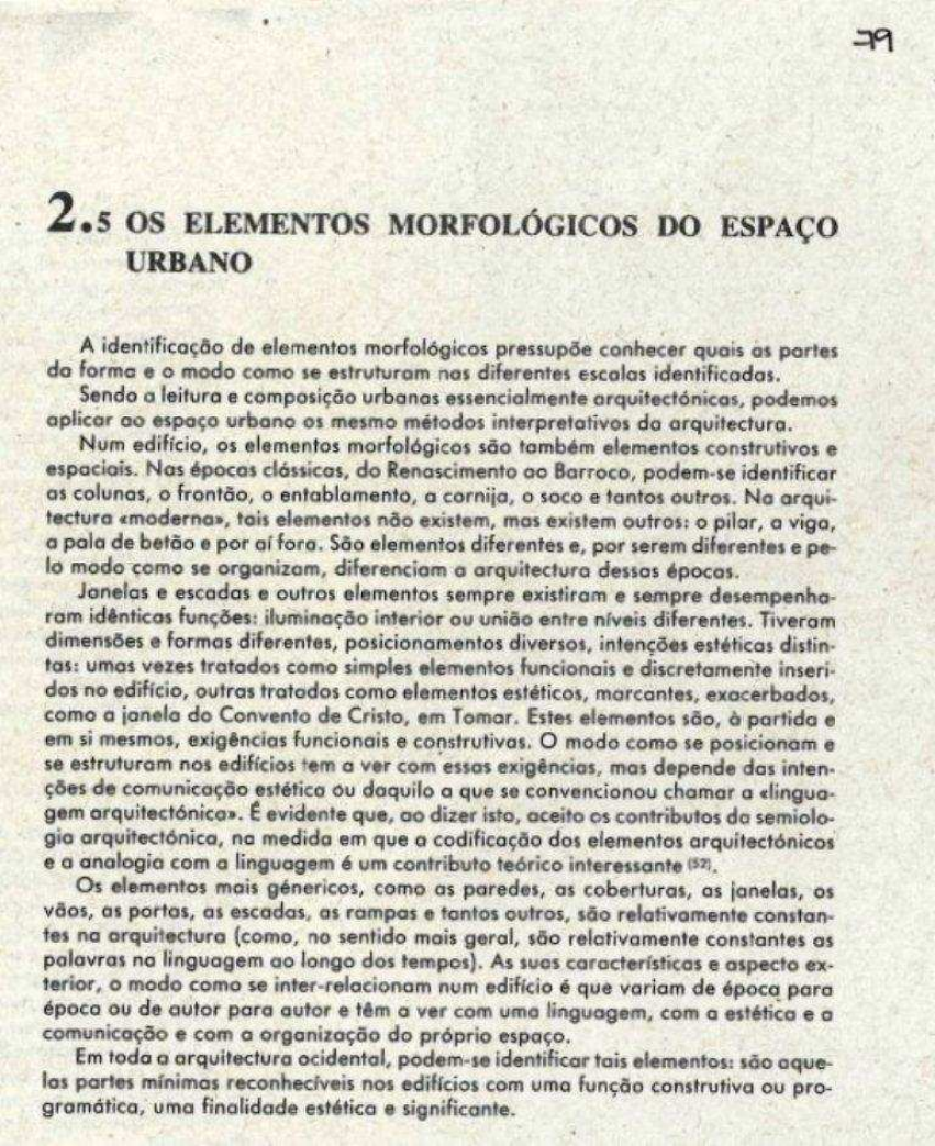 79 2.5 os ELEMENTOS MORFOLÓGICOS DO ESPAÇO URBANO A identificação de elementos morfológicos pressupõe conhecer quais partes do forma e o modo como se diferentes escalas identificadas. Sendo a leitura e composição urbanas essencialmente podemos aplicar espaço urbano os mesmo interpretativos do arquitectura. Num edifício, os elementos morfológicos são também elementos construtivos e espaciais. Nas épocas clássicas, do Renascimento ao Barroco, podem-se identificar as colunas, o frontão, o entablamento, a cornija, o soco e tantos outros. No arqui- tectura tais elementos não existem, mas existem outros: o pilar, a viga, a pala de betão e por fora. São elementos diferentes e, por serem diferentes e pe- lo modo como se organizam, diferenciam a arquitectura dessas Janelas e escadas e outros elementos sempre existiram e sempre desempenha- ram idênticas funções: iluminação interior ou união entre níveis diferentes. Tiveram dimensões e formas diferentes, posicionamentos diversos, intenções tas: umas vezes tratados como simples elementos funcionais e discretamente inseri- dos no edifício, outras tratados como elementos estéticos, marcantes, exacerbados, como a janela do Convento de Cristo, em Tomar. Estes elementos são, à partida e em si mesmos, exigências funcionais e construtivas. modo como se posicionam e se estruturam nos edifícios tem a ver com essas exigências, mas depende das inten- ções de comunicação ou daquilo a que se convencionou chamar a gem É evidente que, dizer isto, aceito os contributos semiolo- no medida em que codificação dos elementos arquitectónicos e a analogia com a linguagem um contributo teórico interessante Os elementos mais génericos, como as paredes, as coberturas, as janelas, os as portas, as escadas, as rampas e outros, são relativamente constan- fes no (como, no sentido mais geral, são relativamente constantes as palavras no linguagem ao longo dos tempos). As características e aspecto ex- terior, modo como se inter-relacionam num edifício é que variam de para époco ou de autor para autor e têm ver com linguagem, com a e o comunicação e com a organização do próprio espaço. Em arquitectura ocidental, podem-se identificar tais elementos: são las partes mínimas nos edifícios com uma função construtiva ou pro- gramática, uma finalidade estética e significante.Recorrendo a analogias estruturalistas da semiologia e com alguma prudência, po- deria comparar a linguagem arquitectónica e os elementos morfológicos dos edifícios com a linguagem (53), na qual existem o texto e as palavras. Estas articulam-se e posicionam-se para formar frases e ideias. Para transmitir uma ideia num texto, existem várias possibilidades linguísticas, literárias, de estilo e de forma, como mesmo edi- ou programa pode ser organizado e construído com formas e arqui- diversas. Pode-se também verificar que, sendo os elementos morfológicos relativamente constantes na arquitectura, é através do como se estruturam e se organizam que provém a comunicação estética do objecto arquitectónico. Esta constatação é também ao espaço urbano. Na cidade, sentido figu- rativo, como obra de arte colectiva, provém dos objectos - edifícios (ou construções) e da sua articulação com espaço por eles definido. que disse sobre os edifícios é extrapolável para o espaço urbano. Todavia, desde logo, existe a necessidade de estabelecer uma de leitura>>, ou seja, estabelecer quais os elementos mínimos na forma urbana! já o havia feito, quando, falar de portas, não mencionei as dobradicas, as fechaduras e batentes, ou, ao falar de escadas, não referi degrau, o cobertor, o espelho, ou, ao falar do espaço urbano, não falei dos postes de iluminação dos fios eléctricos, que também são importantes, mas certamente já em outro nível de leitura. o SOLO o PAVIMENTO É a partir do território existente e da sua topografia que se desenha ou constrói a ci- dade, e no chão que se pisa a identificar os elementos morfológicos do es- paço urbano. É a topografia e modelação do terreno, mas são também os revestimen tos e pavimentos, os degraus e passeios empedrados, os lancis, as faixas asfaltadas, os carris dos eléctricos e tantos outros aspectos. solo-pavimento é um elemento de grande importância no espaço urbano, mas elemento também de grande fragilidade e sujeito a Basta relem- brar as evoluções dos longo dos tempos. Mas, em contrapartida, re- lembraria a enorme de aspecto e comodidade que o correcto tratamento do solo e a pavimentação conferem à cidade. Registo os conflitos dos interesses que disputam o solo público - o tráfego rio e o uso pedonal, pelo menos, e a evolução negativa deste conflito em cidades como Lisboa, em que de ano para o ano solo disponível para o peão vai inexoravelmentePE DE As dos edifícios no forma do de Em boixo direito, um dos mais interessantes conjuntos no Rue Almirante dos junto à Ermido de N. do Destruido em Junho 2000. 81A forma urbana determinado pela dos elementos os edifi- A especulação sobre solo, e dinheiro, determinam a forma do New York. Vistas da meridional de Des. em 1980 822-20. edifício como elemento da forma urbana. conjunto - Ta- 83os EDIFÍCIOS o ELEMENTO MÍNIMO Para definir qual mínimo elemento morfológico na cidade, há que es- tabelecer uma hierarquia de valores e fazer uma selecção entre as colecções de objec- tos que povoam o espaço urbano. Em primeiro lugar, há que mencionar os objectos (54) tão profusa- mente ilustrados nas cidades capitalistas: néons, anúncios, escaparates, montras, etc., sucedem-se em profusão, com variações que alteram a imagem da cidade. A outro es- calão, mobiliário urbano: o banco, a bica, o e ainda a canteiro as plantas caracterizam a imagem do espaço urbano. Estas colecções de objectos são, afectando diferentemente a forma da cidade. Distinguiria, no entanto, a árvore, pela sua importância e papel qua- se idên