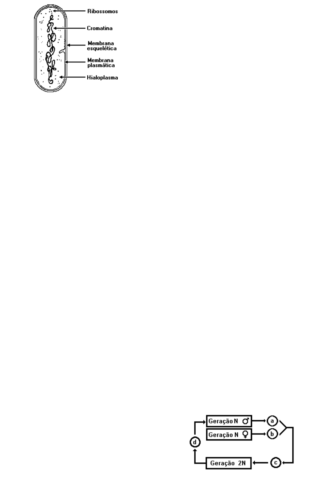 Ele representa a) uma bactéria. b) um protozoário. c) um fungo. d) uma célula animal. e) uma célula vegetal. [A] 2612. O organismo A é um parasita intracelular constituído por uma cápsula protéica que envolve a molécula de ácido nucléico. O organismo B tem uma membrana lipoprotéica revestida por uma parede rica em polissacarídios que envolvem um citoplasma, onde se encontra seu material genético, constituído por uma molécula circular de DNA. Esses organismos são, respectivamente: a) uma bactéria e um vírus. b) um vírus e um fungo. c) uma bactéria e um fungo. d) um vírus e uma bactéria. e) um vírus e um protozoário. [D] 2613. Qual das características a seguir NÃO corresponde às bactérias: a) São seres unicelulares. b) São seres eucariontes.. c) Algumas são patogênicas. d) Algumas vivem em colônias. e) A reprodução assexuada é feita por divisão binária. [B] 2614. Seres de organização celular muito simples, com núcleo não organizado, causadores das infecções e que se encontram por toda parte são: a) algas. b) protozoários. c) vírus. d) fungos. e) bactérias. [E] 2615. Todos os indivíduos pertencentes ao reino Monera, em sua célula, não apresentam: a) DNA. b) ribossomo. c) plasto. d) clorofila. e) membrana plasmática. [C] 2616. Atualmente, um dos grandes problemas enfrentados pela medicina é a resistência das bactérias aos antibióticos, graças à sua variabilidade genética. Dos processos reprodutivos a seguir, assinale aquele que é o principal responsável pelas taxas de mutação desses seres vivos. a) Esporulação b) Regeneração c) Brotamento d) Bipartição e) Conjugação [E] 2617. Os seres vivos necessitam de uma série de elementos químicos essenciais à vida e à sobrevivência. O Nitrogênio é um exemplo destes elementos essenciais. Apesar do ar que respiramos ter 78 % de N2, só conseguimos este elemento através da dieta, pois não somos capazes, como todos os animais e vegetais, de aproveitá-lo diretamente do ar. Os únicos seres capazes de fixar o N2 são as bactérias existentes no solo - as bactérias que compõem o ciclo do Nitrogênio. O Nitrogênio é importante porque ele irá compor nos seres vivos a) proteínas e ácidos nucléicos b) carboidratos e nucleotídeos c) lipídios e carboidratos d) monossacarídeos e aminoácidos e) polissacarídeos e triglicérides [A] 2618. As bactérias não apresentam organelas citoplasmáticas, tais como complexo de Golgi, mitocôndrias, etc., geralmente encontradas em células de seres eucariontes. Entretanto, as bactérias possuem uma invaginação da membrana plasmática chamada MESOSSOMO que apresenta uma função análoga à da organela: a) lisossomo b) mitocôndria c) complexo de Golgi d) plasto e) centríolo [B] 2619. Nas bactérias, o MESOSSOMO apresenta uma coleção enzimática responsável por um processo que também ocorre: a) nas lamelas dos cloroplastos. b) na membrana do retículo endoplasmático rugoso. c) no nucléolo. d) no complexo de Golgi. e) nas cristas mitocondriais. [E] 2620. BACTÉRIAS FAXINEIRAS "Uma das mais ativas participantes da comunidade que habita o andar de cima dos oceanos é a 'P. aeroginosa', bactéria que consegue degradar o óleo despejado no mar." A atividade dessa bactérias é importante para os ecossistemas porque: a) aumenta a entrada de luz do Sol para a fotossíntese. b) aumenta a oxigenação das águas, garantindo o trabalho das bactérias anaeróbicas. c) contribui para o ciclo do carbono, por meio da degradação de hidrocarbonetos. d) permite maior produção de carbono oriundo do óleo degradado. e) facilita a ação dos predadores marinhos através da quebra do óleo em partículas menores. [A] 2621. Considere os procedimentos: I - A produção de bebidas alcoólicas. II - A produção de açúcar a partir da cana. III - O cultivo de plantas leguminosas para aumentar a fertilidade do solo. Os microorganismos atuam em a) I apenas. b) II apenas. c) I e II apenas. d) I e III apenas. e) I, II e III. [D] 2622. Quais dos seguintes grupos de microrganismos são exclusivamente unicelulares: a) leveduras e bactérias. b) fungos e liquens. c) fungos e bactérias. d) algas e fungos. e) leveduras e fungos. [A] 2623. Assinale a alternativa correta. a) As bactérias reproduzem-se, geralmente, por divisão binária, uma forma assexuada de reprodução pela qual uma única bactéria pode originar um "clone", ou seja, uma população de bactérias idênticas. b) As bactérias e as algas cianofíceas distinguem-se de todos os outros seres vivos porque não possuem carioteca envolvendo o material nuclear, isto é, são eucariontes. c) As bactérias só vivem isoladas, embora próximas; nunca formam colônias. d) Em algumas espécies de bactérias observa-se o fenômeno da conjugação, isto é, um tipo de reprodução assexuada. e) As algas cianofíceas assemelham-se às bactérias, porém são heterótrofas, isto é, produzem a matéria orgânica por fotossíntese. [A] 2624. As células procariontes aeróbicas conseguem reduzir a glicose a CO2+H2O, recuperando um total de 40 ATPs por molécula de glicose, com um saldo de 38 ATPs. Dos 40 ATPs, acima citados, são recuperados na cadeia transportadora de elétrons via NADH e FADH: a) 30 ATPs b) 32 ATPs c) 34 ATPs d) 36 ATPs [C] 2625. Em Briófitas como os musgos e as hepáticas a fase duradoura é o(a) a) esporófito. b) gametófito. c) arquegônio. d) anterídio. e) caliptra. [B] 2626. Analisando o esquema a seguir que representa o ciclo vital de um musgo, podemos fazer todas as afirmações, EXCETO: a) as células a e b são gametas produzidos por mitose. b) a geração 2N produz esporo (célula d) por meiose. c) o esporo (célula d) germina por mitose e se diferencia originando a geração N. d) a meiose é final ou gamética. e) o vegetal apresenta metagênese ou alternância de gerações. [D] 226