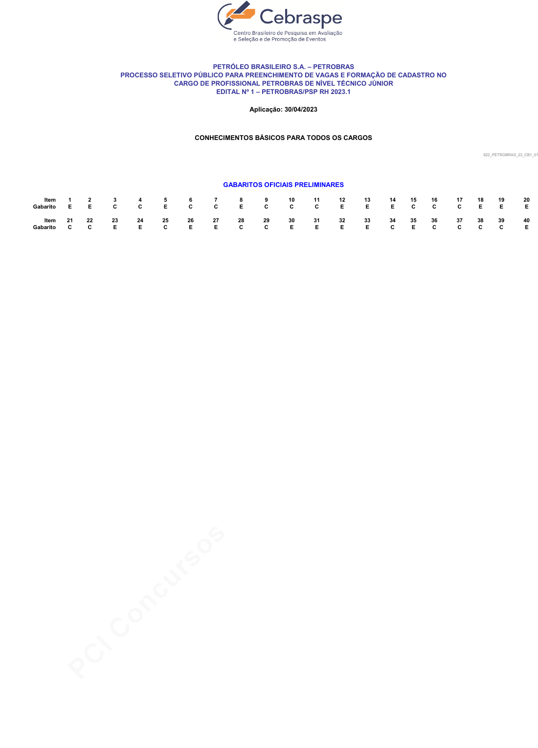 pcimarkpci MDAwMDowMDAwOjAwMDA6MDAwMDowMDAwOmZmZmY6YmFmYjo3Y2Zk:VGh1LCAxMyBNYXIgMjAyNSAyMTowOTozOCAtMDMwMA== www.pciconcursos.com.br PETRÓLEO BRASILEIRO S.A. – PETROBRAS PROCESSO SELETIVO PÚBLICO PARA PREENCHIMENTO DE VAGAS E FORMAÇÃO DE CADASTRO NO CARGO DE PROFISSIONAL PETROBRAS DE NÍVEL TÉCNICO JÚNIOR EDITAL Nº 1 – PETROBRAS/PSP RH 2023.1 Aplicação: 30/04/2023 1 2 3 4 5 6 7 8 9 10 11 12 13 14 15 16 17 18 19 20 E E C C E C C E C C C E E E C C C E E E 21 22 23 24 25 26 27 28 29 30 31 32 33 34 35 36 37 38 39 40 C C E E C E E C C E E E E C E C C C C E 0 0 0 0 0 0 0 0 0 0 0 0 0 0 0 0 0 0 0 0 0 0 0 0 0 0 0 0 0 0 0 0 0 0 0 0 0 0 0 0 0 0 0 0 0 0 0 0 0 0 0 0 0 0 0 0 0 0 0 0 0 0 0 0 0 0 0 0 0 0 0 0 0 0 0 0 0 0 0 0 0 0 0 0 0 0 0 0 0 0 0 0 0 0 0 0 0 0 0 0 0 0 0 0 0 0 0 0 0 0 0 0 0 0 0 0 0 0 0 0 0 0 0 0 0 0 0 0 0 0 0 0 0 0 0 0 0 0 0 0 0 0 0 0 0 0 0 0 0 0 0 0 0 0 0 0 0 0 0 0 0 0 0 0 0 0 0 0 0 0 0 0 0 0 0 0 0 0 0 0 0 0 0 0 0 0 0 0 0 0 0 0 0 0 0 0 0 0 0 0 0 0 0 0 0 0 0 0 0 0 0 0 0 0 0 0 0 0 0 0 0 0 0 0 0 0 0 0 0 0 0 0 0 0 0 0 0 0 0 0 0 0 0 0 0 0 0 0 0 0 0 0 0 0 0 0 0 0 0 0 0 0 0 0 0 0 0 0 0 0 0 0 0 0 0 0 0 0 0 0 0 0 0 0 0 0 0 0 0 0 0 0 0 0 0 0 0 0 0 0 0 0 0 0 0 0 0 0 0 0 0 0 0 0 0 0 0 0 0 0 0 0 0 0 0 0 0 0 0 0 0 0 0 0 0 0 0 0 0 0 0 0 0 0 0 0 0 0 0 0 0 0 0 0 0 0 0 0 0 0 0 Gabarito 822_PETROBRAS_23_CB1_01 0 0 GABARITOS OFICIAIS PRELIMINARES CONHECIMENTOS BÁSICOS PARA TODOS OS CARGOS Item Gabarito Item pcimarkpci MDAwMDowMDAwOjAwMDA6MDAwMDowMDAwOmZmZmY6YmFmYjo3Y2Zk:VGh1LCAxMyBNYXIgMjAyNSAyMTowOTozOCAtMDMwMA== www.pciconcursos.com.br 41 42 43 44 45 46 47 48 49 50 51 52 53 54 55 56 57 58 59 60 C C E E C E C E E C E E C C C C E C E E 61 62 63 64 65 66 67 68 69 70 71 72 73 74 75 76 77 78 79 80 E C E C E E C C E C C E C C E E E E C C 81 82 83 84 85 86 87 88 89 90 91 92 93 94 95 96 97 98 99 100 E E C C C C C E C C C E C E E C E E C E 0 0 0 0 0 0 0 0 0 0 0 0 0 0 0 0 0 0 0 0 0 0 0 0 0 0 0 0 0 0 0 0 0 0 0 0 0 0 0 0 0 0 0 0 0 0 0 0 0 0 0 0 0 0 0 0 0 0 0 0 0 0 0 0 0 0 0 0 0 0 0 0 0 0 0 0 0 0 0 0 0 0 0 0 0 0 0 0 0 0 0 0 0 0 0 0 0 0 0 0 0 0 0 0 0 0 0 0 0 0 0 0 0 0 0 0 0 0 0 0 0 0 0 0 0 0 0 0 0 0 0 0 0 0 0 0 0 0 0 0 0 0 0 0 0 0 0 0 0 0 0 0 0 0 0 0 0 0 0 0 0 0 0 0 0 0 0 0 0 0 0 0 0 0 0 0 0 0 0 0 0 0 0 0 0 0 0 0 0 0 0 0 0 0 0 0 0 0 0 0 0 0 0 0 0 0 0 0 0 0 0 0 0 0 0 0 0 0 0 0 0 0 0 0 0 0 0 0 0 0 0 0 0 0 0 0 0 0 0 0 0 0 0 0 0 0 0 0 0 0 0 0 0 0 0 0 0 0 0 0 0 0 0 0 0 0 0 0 0 0 0 0 0 0 0 0 0 0 0 0 0 0 0 0 0 0 0 0 0 0 0 0 0 0 0 0 0 0 0 0 0 0 0 0 0 0 0 0 0 0 0 0 0 0 0 0 0 0 0 0 0 0 0 0 0 0 0 0 0 0 0 0 0 0 0 0 0 0 0 0 0 0 0 0 0 0 0 0 0 0 0 0 0 0 0 0 0 0 0 0 0 0 0 0 0 0 0 0 0 0 0 0 0 0 0 0 0 0 0 0 0 0 0 0 0 0 0 0 0 0 0 0 0 0 0 0 0 0 0 0 0 0 0 0 0 0 0 0 0 0 0 0 0 0 0 0 0 0 0 0 0 0 0 0 0 0 0 0 0 0 0 0 0 0 0 0 0 0 0 0 Item 0 0 0 GABARITOS OFICIAIS PRELIMINARES PETRÓLEO BRASILEIRO S.A. – PETROBRAS PROCESSO SELETIVO PÚBLICO PARA PREENCHIMENTO DE VAGAS E FORMAÇÃO DE CADASTRO NO CARGO DE PROFISSIONAL PETROBRAS DE NÍVEL TÉCNICO JÚNIOR EDITAL Nº 1 – PETROBRAS/PSP RH 2023.1 Aplicação: 30/04/2023 822_PETROBRAS_23_001_01 Item Cargo: ÊNFASE 1: ENFERMAGEM DO TRABALHO Gabarito Item Gabarito Gabarito pcimarkpci MDAwMDowMDAwOjAwMDA6MDAwMDowMDAwOmZmZmY6YmFmYjo3Y2Zk:VGh1LCAxMyBNYXIgMjAyNSAyMTowOTozOCAtMDMwMA== www.pciconcursos.com.br PETRÓLEO BRASILEIRO S.A. – PETROBRAS PROCESSO SELETIVO PÚBLICO PARA PREENCHIMENTO DE VAGAS E FORMAÇÃO DE CADASTRO NO CARGO DE PROFISSIONAL PETROBRAS DE NÍVEL TÉCNICO JÚNIOR EDITAL Nº 1 – PETROBRAS/PSP RH 2023.1 Aplicação: 30/04/2023 41 42 43 44 45 46 47 48 49 50 51 52 53 54 55 56 57 58 59 60 C E E C E E C C C C E E E C C C E E C E 61 62 63 64 65 66 67 68 69 70 71 72 73 74 75 76 77 78 79 80 E E C C E E C E C E C C E E E E E C C C 81 82 83 84 85 86 87 88 89 90 91 92 93 94 95 96 97 98 99 100 E C E C E E E C E E C C E E C E C E C E 0 0 0 0 0 0 0 0 0 0 0 0 0 0 0 0 0 0 0 0 0 0 0 0 0 0 0 0 0 0 0 0 0 0 0 0 0 0 0 0 0 0 0 0 0 0 0 0 0 0 0 0 0 0 0 0 0 0 0 0 0 0 0 0 0 0 0 0 0 0 0 0 0 0 0 0 0 0 0 0 0 0 0 0 0 0 0 0 0 0 0 0 0 0 0 0 0 0 0 0 0 0 0 0 0 0 0 0 0 0 0 0 0 0 0 0 0 0 0 0 0 0 0 0 0 0 0 0 0 0 0 0 0 0 0 0 0 0 0 0 0 0 0 0 0 0 0 0 0 0 0 0 0 0 0 0 0 0 0 0 0 0 0 0 0 0 0 0 0 0 0 0 0 0 0 0 0 0 0 0 0 0 0 0 0 0 0 0 0 0 0 0 0 0 0 0 0 0 0 0 0 0 0 0 0 0 0 0 0 0 0 0 0 0 0 0 0 0 0 0 0 0 0 0 0 0 0 0 0 0 0 0 0 0 0 0 0 0 0 0 0 0 0 0 0 0 0 0 0 0 0 0 0 0 0 0 0 0 0 0 0 0 0 0 0 0 0 0 0 0 0 0 0 0 0 0 0 0 0 0 0 0 0 0 0 0 0 0 0 0 0 0 0 0 0 0 0 0 0 0 0 0 0 0 0 0 0 0 0 0 0 0 0 0 0 0 0 0 0 0 0 0 0 0 0 0 0 0 0 0 0 0 0 0 0 0 0 0 0 0 0 0 0 0 0 0 0 0 0 0 0 0 0 0 0 0 0 0 0 0 0 0 0 0 0 0 0 0 0 0 0 0 0 0 0 0 0 0 0 0 0 0 0 0 0 0 0 0 0 0 0 0 0 0 0 0 0 0 0 0 0 0 0 0 0 0 0 0 0 0 0 0 0 0 0 0 0 0 0 0 0 0 0 0 0 0 0 0 0 0 0 0 0 0 0 0 0 0 0 0 Item Gabarito Item Gabarito 0 Item Gabarito 822_PETROBRAS_23_002_01 0 0 GABARITOS OFICIAIS PRELIMINARES Cargo: ÊNFASE 2: INSPEÇÃO DE EQUIPAMENTOS E INSTALAÇÕES pcimarkpci MDAwMDowMDAwOjAwMDA6MDAwMDowMDAwOmZmZmY6YmFmYjo3Y2Zk:VGh1LCAxMyBNYXIgMjAyNSAyMTowOTozOCAtMDMwMA== www.pciconcursos.com.br PETRÓLEO BRASILEIRO S.A. – PETROBRAS PROCESSO SELETIVO PÚBLICO PARA PREENCHIMENTO DE VAGAS E FORMAÇÃO DE CADASTRO NO CARGO DE PROFISSIONAL PETROBRAS DE NÍVEL TÉCNICO JÚNIOR EDITAL Nº 1 – PETROBRAS/PSP RH 2023.1 Aplicação: 30/04/2023 41 42 43 44 45 46 47 48 49 50 51 52 53 54 55 56 57 58 59 60 C E E C C E C E E C C E C E E C E C C C 61 62 63 64 65 66 67 68 69 70 71 72 73 74 75 76 77 78 79 80 E E E C E C E E C C C E E E E E C E C C 81 82 83 84 85 86 87 88 89 90 91 92 93 94 95 96 97 98 99 100 C C E C E E C C E C E E C C E E C C C E 0 0 0 0 0 0 0 0 0 0 0 0 0 0 0 0 0 0 0 0 0 0 0 0 0 0 0 0 0 0 0 0 0 0 0 0 0 0 0 0 0 0 0 0 0 0 0 0 0 0 0 0 0 0 0 0 0 0 0 0 0 0 0 0 0 0 0 0 0 0 0 0 0 0 0 0 0 0 0 0 0 0 0 0 0 0 0 0 0 0 0 0 0 0 0 0 0 0 0 0 0 0 0 0 0 0 0 0 0 0 0 0 0 0 0 0 0 0 0 0 0 0 0 0 0 0 0 0 0 0 0 0 0 0 0 0 0 0 0 0 0 0 0 0 0 0 0 0 0 0 0 0 0 0 0 0 0 0 0 0 0 0 0 0 0 0 0 0 0 0 0 0 0 0 0 0 0 0 0 0 0 0 0 0 0 0 0 0 0 0 0 0 0 0 0 0 0 0 0 0 0 0 0 0 0 0 0 0 0 0 0 0 0 0 0 0 0 0 0 0 0 0 0 0 0 0 0 0 0 0 0 