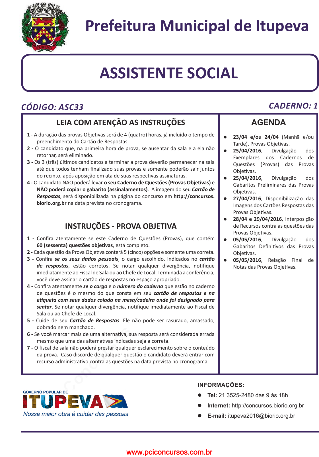 pcimarkpci MDAwMDowMDAwOjAwMDA6MDAwMDowMDAwOmZmZmY6YjViZjozZTlj:VGh1LCAxMyBNYXIgMjAyNSAwODo1NDozMCAtMDMwMA== www.pciconcursos.com.br LEIA COM ATENÇÃO AS INSTRUÇÕES 1 - A duração das provas Objetivas será de 4 (quatro) horas, já incluído o tempo de preenchimento do Cartão de Respostas. 2 - O candidato que, na primeira hora de prova, se ausentar da sala e a ela não retornar, será eliminado. 3 - Os 3 (três) últimos candidatos a terminar a prova deverão permanecer na sala até que todos tenham finalizado suas provas e somente poderão sair juntos do recinto, após aposição em ata de suas respectivas assinaturas. 4 - O candidato NÃO poderá levar o seu Caderno de Questões (Provas Objetivas) e NÃO poderá copiar o gabarito (assinalamentos). A imagem do seu Cartão de Respostas, será disponibilizada na página do concurso em http://concursos. biorio.org.br na data prevista no cronograma. INSTRUÇÕES - PROVA OBJETIVA 1 - Confira atentamente se este Caderno de Questões (Provas), que contém 60 (sessenta) questões objetivas, está completo. 2 - Cada questão da Prova Objetiva conterá 5 (cinco) opções e somente uma correta. 3 - Confira se os seus dados pessoais, o cargo escolhido, indicados no cartão de respostas, estão corretos. Se notar qualquer divergência, notifique imediatamente ao Fiscal de Sala ou ao Chefe de Local. Terminada a conferência, você deve assinar o cartão de respostas no espaço apropriado. 4 - Confira atentamente se o cargo e o número do caderno que estão no caderno de questões é o mesmo do que consta em seu cartão de respostas e na etiqueta com seus dados colada na mesa/cadeira onde foi designado para sentar. Se notar qualquer divergência, notifique imediatamente ao Fiscal de Sala ou ao Chefe de Local. 5 - Cuide de seu Cartão de Respostas. Ele não pode ser rasurado, amassado, dobrado nem manchado. 6 - Se você marcar mais de uma alternativa, sua resposta será considerada errada mesmo que uma das alternativas indicadas seja a correta. 7 - O fiscal de sala não poderá prestar qualquer esclarecimento sobre o conteúdo da prova. Caso discorde de qualquer questão o candidato deverá entrar com recurso administrativo contra as questões na data prevista no cronograma. AGENDA l 23/04 e/ou 24/04 (Manhã e/ou Tarde), Provas Objetivas. l 25/04/2016, Divulgação dos Exemplares dos Cadernos de Questões (Provas) das Provas Objetivas. l 25/04/2016, Divulgação dos Gabaritos Preliminares das Provas Objetivas. l 27/04/2016, Disponibilização das Imagens dos Cartões Respostas das Provas Objetivas. l 28/04 e 29/04/2016, Interposição de Recursos contra as questões das Provas Objetivas. l 05/05/2016, Divulgação dos Gabaritos Definitivos das Provas Objetivas. l 05/05/2016, Relação Final de Notas das Provas Objetivas. CADERNO: 1 INFORMAÇÕES: l Tel: 21 3525-2480 das 9 às 18h l Internet: http://concursos.biorio.org.br l E-mail: itupeva2016@biorio.org.br CÓDIGO: ASC33 Prefeitura Municipal de Itupeva ASSISTENTE SOCIAL www.pciconcursos.com.br pcimarkpci MDAwMDowMDAwOjAwMDA6MDAwMDowMDAwOmZmZmY6YjViZjozZTlj:VGh1LCAxMyBNYXIgMjAyNSAwODo1NDozMCAtMDMwMA== www.pciconcursos.com.br ASSISTENTE SOCIAL CADERNO 1 2 LÍNGUA PORTUGUESA TEXTO DENGUE E VISTORIA As equipes de combate ao Aedes aegypti já vistoriaram 18,6 milhões de imóveis em todo país. O balanço é do segundo ciclo de campanha de caça ao mosquito, iniciado este mês. Mas nem todo mundo atendeu ao chamado dos agentes de saúde: muitos imóveis visitados estavam fechados ou os moradores não abriram suas portas. Até agora, a vistoria só aconteceu de fato em 33,4% do total de 67 milhões de residências que deveriam ser monitoradas. Nesse segundo ciclo de visitas, os agentes já visitaram 22,4 milhões de imóveis. Desses, 3,8 milhões não foram vistoriados, de acordo com informações do Ministério da Saúde. A abrangência das visitas também foi divulgada. Dos 5.570 municípios brasileiros, 4.438 já registraram as visitas no Sistema Informatizado de Monitoramento da Presidência da República (SIM-PR), segundo o novo balanço, concluído no dia 24. Os agentes de saúde encontraram focos de larvas de Aedes aegypti em 3,2% dos locais visitados. QUESTÃO 1 O texto é classificado como informativo; a seguinte característica NÃO é representativa desse gênero textual: (A) o enunciador domina uma informação que não é do domínio do receptor. (B) o enunciador supõe um interesse na informação por parte do receptor. (C) a mensagem deve criar estratégias de interesse pela leitura do texto. (D) o conteúdo da mensagem deve apoiar-se em dados bastante objetivos. (E) os fatos apresentados devem obedecer a uma sequência cronológica. QUESTÃO 2 Abaixo estão cinco manchetes retiradas de jornais do Rio de Janeiro; a manchete que NÃO mostra a imparcialidade diante do conteúdo da mensagem é: (A) Alunos ocupam mais uma escola estadual. (B) Governo vai à Justiça para liberar colégio; (C) Santos Dumont terá voos durante a madrugada. (D) Ministro afirma que União não pagará adicionais este mês. (E) Justiça finalmente suspende nova taxa tributária. QUESTÃO 3 “Até agora, a vistoria só aconteceu de fato em 33,4% do total de 67 milhões de residências que deveriam ser monitoradas”; a presença do vocábulo “só” nesse segmento do texto indica que: (A) o número de vistorias está além do esperado. (B) as vistorias foram realizadas em quantidade reduzida. (C) as autoridades não estão trabalhando de forma satisfatória. (D) o número de residências a serem monitoradas é muito pequeno. (E) as residências que deveriam ser monitoradas é maior do que o necessário. QUESTÃO 4 “Nesse segundo ciclo de visitas, os agentes já visitaram 22,4 milhões de imóveis. Desses, 3,8 milhões não foram vistoriados, de acordo com informações do Ministério da Saúde”. As formas demonstrativas “nesse” e “desses”: (A) obedecem a uma mesma regra de estruturação textual. (B