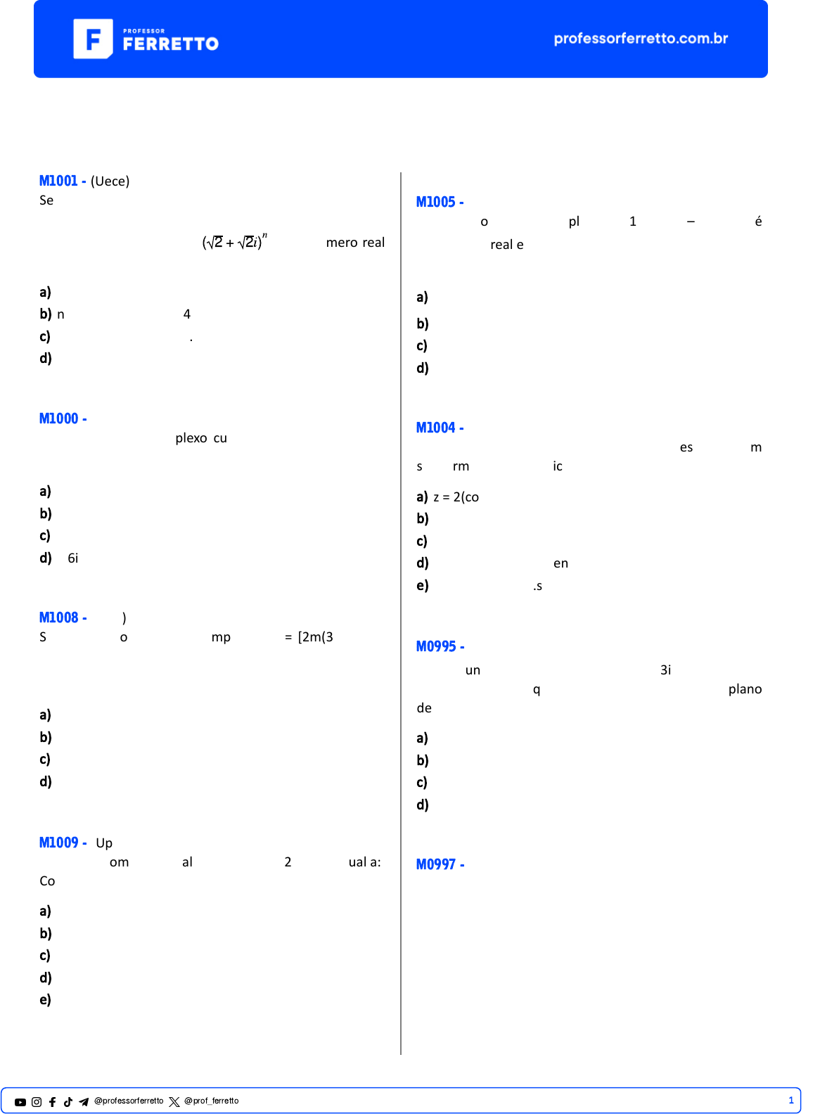 Números complexos M1001 - (Uece) Se i é o número complexo cujo quadrado é igual a –1, e n é um número natural maior do que 2, então, pode-se afirmar corretamente que (√2 + √2𝑖) 𝑛 é um número real sempre que a) n for ímpar. b) n for um múl�plo de 4. c) n for um múl�plo de 3. d) n for um múl�plo de 5. M1000 - (Uece) Se i é o número complexo cujo quadrado é igual a -1, então, o valor de 5i227 + i6 – i13 é igual a a) i + 1. b) 4i – 1. c) – 6i – 1. d) – 6i. M1008 - (Eear) Sabe-se que os números complexos Z1 = [2m(3 + m)] + (3n + 5)i e Z2 = (2m2 + 12) + [4(n + 1)]i são iguais. Então, os valores de m e n são, respec�vamente a) 3 e 1 b) 2 e 1 c) 2 e – 1 d) 3 e – 1 M1009 - (Upf) O número complexo z, tal que 5z + z* = 12 + 16i é igual a: Considere z* como o conjugado de z. a) –2 + 2i b) 2 – 3i c) 3 + i d) 2 + 4i e) 1 + 2i M1005 - (Unicamp) Considere o número complexo z = (1 + ai)/(a – i) onde a é um número real e i é a unidade imaginária, isto é, i2 = –1. O valor de z2016 é igual a a) a2016. b) 1. c) 1 + 2016i. d) i. M1004 - (Feevale) O número complexo z = 1 + i pode ser representado, em sua forma trigonométrica, por a) z = 2(cos(π) + i.sen(π)) b) z = (cos(π) + i.sen(π)) c) z = √2 (cos(π/4) + i.sen(π/4)) d) z = √2 (cos(π/2) + i.sen(π/2)) e) z = 2(cos(π/4) + i.sen(π/4)) M0995 - (Eear) Se i é a unidade imaginária, então 2i3 + 3i2 + 3i + 2 é um número complexo que pode ser representado no plano de Argand-Gauss no __________ quadrante. a) primeiro b) segundo c) terceiro d) quarto M0997 - (Pucsp) Em relação ao número complexo z = i87.(i105 + √3) é correto afirmar que 1@professorferretto @prof_ferretto a) sua imagem pertence ao 3º quadrante do plano complexo. b) é imaginário puro. c) o módulo de z é igual a 4. d) seu argumento é igual ao argumento do número complexo v = (1/2) – (√3)i/2. M0996 - (Mackenzie) Se (2 + i)/(𝛽 + 2i) tem parte imaginária igual a zero, então o número real 𝛽 é igual a a) 4 b) 2 c) 1 d) -2 e) -4 M1007 - (Uece) No sistema de coordenadas cartesianas usual com origem no ponto O, considere os números complexos, na forma trigonométrica, dados por z = 2(cos60˚ + i.sen60˚) e w = 2(cos30˚ + i.sen30˚). Os pontos do plano que representam estes números e a origem O são vér�ces de um triângulo cuja medida da área é a) 1,0 u.a. b) 0,5 u.a. c) 2,0 u.a. d) 1,5 u.a. M1003 - (Fac. Albert Einstein) Sejam os números complexos u = 2√2 (cos315˚ + i.sen315˚) e w = u2. Se P e Q são as respec�vas imagens de u e w, no plano complexo, então a equação da reta perpendicular a PQ, traçada pelo seu ponto médio, é a) 3x + y + 2 = 0 b) 3x – y + 2 = 0 c) x + 3y + 14 = 0 d) x – 3y + 14 = 0 M0998 - (Pucsp) Considere os números complexos z1 = –1 – i, z2 = k + i, com k um número real posi�vo e z3 = z1 . z2. Sabendo que |z3| = √10 é correto afirmar que a) |z1 + z2| = √7 b) (z2 / z3) = (–1 + i) / 2 c) O argumento de z2 é 225˚. d) z3 . z2 = –1 + 2i M1002 - (Fuvest) O polinômio P(x) = x3 – 3x2 + 7x – 5 possui uma raiz complexa 𝜆 cuja parte imaginária é posi�va. A parte real de 𝜆3 é igual a a) – 11 b) – 7 c) 9 d) 10 e) 12 M1006 - (Pucrs) Uma das criações na Matemá�ca que revolucionou o conceito de número foi a dos números complexos. O matemá�co italiano Rafael Bombelli (1526-1572) foi o primeiro a escrever as regras de adição e mul�plicação para esses números, o que facilitou o estudo das raízes de um polinômio. Esse fato veio a contribuir para a resolução de problemas como o que segue. Os pontos do plano complexo que são raízes de um polinômio de grau 4 com coeficientes reais são unidos por segmentos de reta paralelos aos eixos coordenados. Se duas dessas raízes são 2 + 3i e –1 + 3i, então a figura ob�da será um a) triângulo. b) quadrado. c) retângulo. d) trapézio. e) losango. M0999 - (Unicamp) Sejam a e b números reais não nulos. Se o número complexo z = a + bi é uma raiz da equação quadrá�ca x2 + bx + a = 0, então a) |z| = 1/√3 b) |z| = 1/√5 c) |z| = √3 d) |z| = √5 2@professorferretto @prof_ferretto