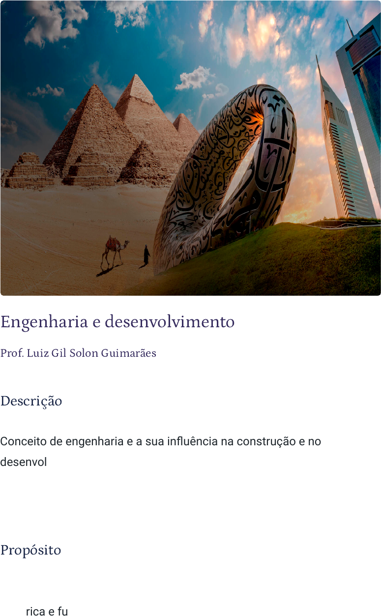 Engenharia e desenvolvimento Prof. Luiz Gil Solon Guimarães Descrição Conceito de engenharia e a sua influência na construção e no desenvolvimento da civilização ocidental, análise dos seus impactos na organização de países e impérios, bem como seu possível papel como agente estratégico de desenvolvimento de um país. Propósito Identificar a essência da profissão, por meio da sua importância histórica e futura, como elemento motivador, para ter, ao longo do curso e da carreira, uma postura ativa diante das oportunidades de construção das habilidades e competências inerentes ao exercício pleno da engenharia. Objetivos Módulo 1 Engenharia na construção da civilização ocidental Identificar o papel da engenharia na construção da civilização ocidental. Módulo 2 Processo evolutivo da industrialização Reconhecer o papel da engenharia formal no processo evolutivo da industrialização. Módulo 3 A engenharia e o desenvolvimento Analisar as relações entre a engenharia e o desenvolvimento. Módulo 4 A atuação do engenheiro e o mercado de trabalho Identificar as possibilidades de atuação dos engenheiros, suas competências e responsabilidades. Introdução Olá! Antes de começarmos, assista ao vídeo e entenda sobre os principais aspectos da engenharia e seu desenvolvimento. 1 - Engenharia na construção da civilização ocidental Ao �nal deste módulo, você será capaz de identi�car o papel da engenharia na construção da civilização ocidental. Conceitos de engenharia Neste vídeo, você compreenderá o conceito de engenharia e seus marcos históricos. Assista! Construção de um conceito para a engenharia A etimologia (estudo da origem das palavras) nos fornece bases para compreender a adoção e a manutenção da palavra engenharia para denominar a profissão ao longo de tantos anos. Saiba mais A palavra latina ingenium, associada a significados como talento e inteligência, características inatas, originou a palavra engenhosidade. Dessa forma, entende-se que a engenharia seja uma profissão que carrega em si um forte viés de criação direcionada para a inovação (engenhosidade). Ao se apresentar como engenheiro, o profissional gera uma expectativa de ser uma pessoa engenhosa, criativa, com grande capacidade intelectual e prática, voltada para a solução de problemas. Agora, vamos listar algumas definições conhecidas para a engenharia: 1920 S. E. Lindsay Engenharia é a prática da aplicação segura e econômica das leis científicas que governam as forças e materiais da natureza, por meio da organização, do design e da construção, para o benefício da humanidade. 1939 Vannevar Bush Engenharia, em um sentido amplo, é a aplicação da ciência de maneira econômica para as necessidades da humanidade. 1941 T. J. Hoover e J. C. L. Fish Engenharia é a aplicação profissional e sistemática da ciência para a utilização eficiente dos recursos naturais a fim de produzir riqueza. 1963 John C. Calhoun Jr. É responsabilidade do engenheiro estar atento às necessidades sociais e decidir como as leis da ciência podem ser mais bem adaptadas por meio da engenharia a fim de cumprir essas necessidades. 1982 Comitê de Certi�cação de Engenharia e Tecnologia dos Estados Unidos Engenharia é a profissão na qual o conhecimento das ciências matemáticas e naturais, obtido mediante o estudo, a experiência e a prática, é aplicado com julgamento no desenvolvimento de novos meios de utilizar, economicamente, os materiais e as forças da natureza para o benefício da humanidade. Saiba mais Após tantas definições, convido você a um exercício de reflexão. Construa uma versão inicial e pessoal do seu entendimento de engenharia. Se, ocasionalmente, você revisitar esse conceito, certamente ele haverá se transformado e evoluído. Obter o real entendimento da profissão que escolheu seguramente fará de você um profissional melhor. Engenhosidade e história Como já é possível calcular a dimensão do significado da engenharia, podemos pensar na sua participação na história das civilizações. Proponho, como exercício inicial, que você pense no seu dia a dia e que elimine, um por um, os recursos de que dispomos que sejam relacionados à engenharia. Digamos que eliminássemos os celulares e, na sequência, os computadores pessoais de nossas vidas. Seria um retrocesso de 40 anos. Agora, imagine o fim da aviação e dos automóveis; da tecnologia associada à saúde e da energia elétrica. Nesse sentido, já teríamos retrocedido mais de um século, e se pensarmos nas grandes edificações e no saneamento, rapidamente chegaríamos à Idade Média. Saiba mais Formalmente focada em ensinos técnicos, a primeira escola de engenharia surgiu na França, em 1747, com o nome de École des Ponts et Chaussées. Em 1774, foi fundada a École Polytechnique com forte fundamentação teórica e, em sequência, escolas de engenharia foram surgindo em vários países. Não é coincidência a Revolução Industrial ter se desenvolvido a partir de 1760, ao longo de aproximadamente 80 anos. Vamos finalmente iniciar nosso passeio pela história, destacando e analisando fatos relevantes da civilização ocidental e suas relações com a engenharia, ou com a engenhosidade, em uma linha do tempo de início indefinido até a formalização universitária da profissão. É muito difícil dissociar a história da humanidade da engenharia, visto que o ser humano busca soluções engenhosas para resolver seus problemas desde sempre. Engenharia no Egito Confira neste vídeo as contribuições e invenções do Egito para a engenharia. Egito Considera-se que o primeiro engenheiro foi Imhotep, responsável por projetar e construir a primeira pirâmide do Egito, em degraus, para abrigar o túmulo do Faraó Djoser (2630–2611 AEC). No entanto, o uso da denominação engenheiro começou a ser utilizada somente no século XI para definir alguém que atuava com criati