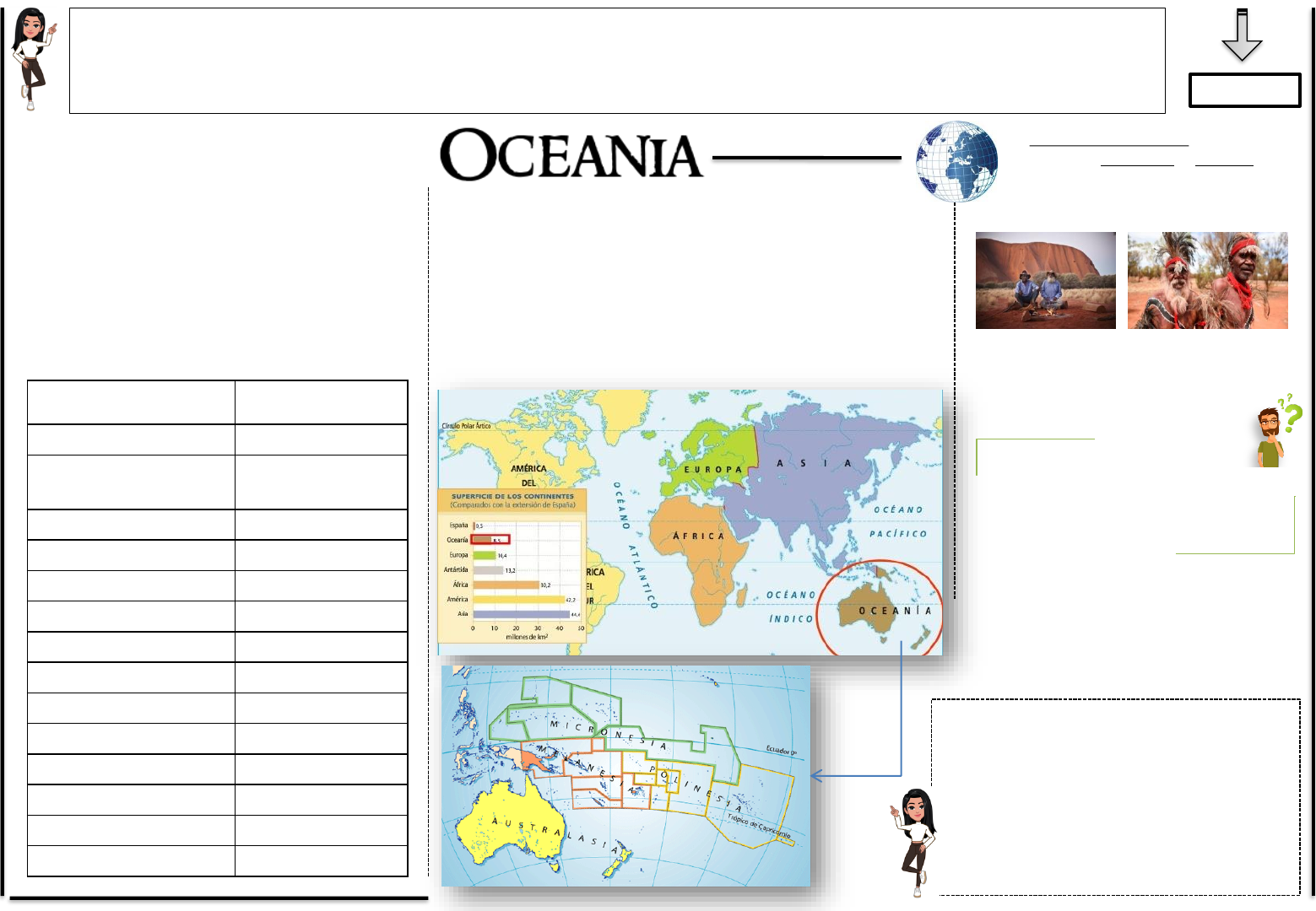 ESCOLA MUNICIPAL DE ENSINO FUNDAMENTAL SÃO JOÃO BATISTA - ATIVIDADES DE ESTUDOS MONITORADOS 9ª QUINZENA - 13/09/2021 a 04/10/2021 – 9º ANO DISCIPLINA: GEOGRAFIA - 06 PERÍODOS – 03 AULAS Prof.ª Tatiana Santos NOME: 1ª AULA A Oceania é um continente localizado a sudeste da Ásia, compreendendo um conjunto de ilhas somado à Austrália, essa última considerada como uma massa continental chamada de “Australásia”. Possui uma área total de 8.480.355 km², onde habitam aproximadamente 38 milhões de pessoas. Por ter sido o último continente a ser colonizado pelos europeus, a Oceania é chamada de “novíssimo continente”, em distinção a Europa (o velho mundo) e à América (o novo mundo), segundo a regionalização eurocêntrica da Terra. Há uma regionalização envolvendo essas ilhas, dividindo-as em quatro grandes zonas: 1. Australásia: Abarca os territórios de países como a Austrália, Nova Zelândia e Nova Guiné, que são as (“maiores ilhas”) 2. Melanésia (que significa “ilhas dos negros”) 3. Polinésia (“muitas ilhas”) 4. Micronésia (“pequenas ilhas”) Apesar de existirem milhares de ilhas na região, há apenas 14 Estados independentes, além de alguns territórios ou colônias de outros países, com destaque para a Polinésia Francesa, protetorado francês onde se encontra o Taiti. PAÍSES DA OCEANIA E SUAS CAPITAIS Ao todo, a Oceania possui 14 países e cerca de 22 dependências administradas por nações de outros continentes, não havendo entre esses territórios nenhuma fronteira terrestre. Nessas 14 nações, vivem, aproximadamente, 40.117.432 de habitantes que falam diversas línguas, como Castelhano, Fidjiano, Francês, Bislamá, Indonésio, Inglês, Maori, entre outras. A seguir, confira nosso quadro com os países da Oceania e suas respectivas capitais: País Capital Austrália Camberra Estados Federados da Micronésia Palikir Fiji Suva Ilhas Marshall Majuro Ilhas Salomão Honiara Kiribati Tawara do Sul Nauru Yaren Nova Zelândia Wellington Palau Ngerulmud Papua Nova Guiné Port Moresby Samoa Apia Tonga Nuku'alofa Tuvalu Funafuti Vanuatu Port Vila Observe no mapa! A Indonésia faz parte da Oceania? Considerada um país transcontinental, a Indonésia por vezes, é associada à Oceania. O país encontra-se entre o Sudeste Asiático e a Austrália. A colonização da Oceania se iniciou de fato, apenas em 1779 quando os presos ingleses começaram a ser enviados ao local para cumprir suas penas. A população da Oceania se constitui de caucasianos, aborígenes e asiáticos, sendo o grupo dos caucasianos predominante em todo o continente devido ao processo de colonização, bastante tardio por sinal. 2ª AULA É possível encontrar áreas com predominância de desertos e savanas. O clima também é diversificado, podendo ser encontradas, ao longo do continente, áreas de clima árido e semiárido, subtropical e tropical mediterrâneo. Os países foram colonizados principalmente pelos britânicos, que ainda possuem territórios no continente. A Austrália foi incorporada em 1770, e a Nova Zelândia, por volta de 1840. De modo geral, a maioria das ilhas que compõem a Oceania é originária de atividades vulcânicas devido as atividades sísmicas elevadas na região. Os vulcões Mauna Loa e Kilauea são os recordistas mundiais em quantidade de lava expelida. Apesar disso, o territórios apresentam características distintas, havendo algumas regiões montanhosas e outras de relevo plano. RELEVO Vulcão Mauna Loa Em termos econômicos, os dois principais países são a Austrália e a Nova Zelândia, considerados uns dos únicos países desenvolvidos do mundo que se localizam no hemisfério sul. São grandes potências minerais e, na pecuária ovina, além de possuírem avançados modelos agroindustriais e turísticos, essa última atividade é a predominante no restante do continente. Com exceção dos dois países citados, todas as nações dependem da importação de alimentos para a própria sustentação, haja vista que a existência de terras agricultáveis é escassa. ECONOMIA A fauna apresenta muitas espécies endêmicas e bastantes características como, por exemplo, os cangurus que existem apenas na Austrália. Existem mais de 50 espécies deles e as espécies variam desde os pequenos wallabies até os maiores marsupiais do planeta, os cangurus marrons. Outros animais típicos são os coalas, o diabo da tasmânia – que ganhou esse nome devido aos dentes afiadíssimos e bastante aparentes e que quase foi extinto, o dingo – uma espécie de cão selvagem, e o curioso ornitorrinco, um mamífero que bota ovos, tem pelo, bico de pato e um ferrão na cauda. FAUNA O crocodilo também um animal típico da Austrália e também um dos mais perigosos. Mas perde de longe para uma água viva, a “Box Jellyfish” ou “Sea Wasp”. Seus tentáculos podem chegar a vários metros de comprimento e liberam uma toxina mortal. Outra água viva, a “Irukandji” é o menor animal do mundo com a capacidade de matar um homem adulto. Até mesmo os cangurus, considerados pragas na Austrália, podem representar perigo devido ao grande número de acidentes causados por eles nas estradas. TESTES NUCLEARES O Atol de Bikini, localizado no arquipélago das ilhas Marshall, no Oceano Pacífico, foi alvo de testes nucleares entre as décadas de 40 e 50, pelos Estados Unidos. Tais ações fizeram com que esta região ficasse isolada do contato humano durante mais de quatro décadas. O maior teste nuclear foi responsável por pulverizar 3 ilhas e abriu uma cratera que pode ser vista em imagens de satélite (na imagem abaixo). Ao fim do século passado, em 1996, o atol foi declarado seguro - relatórios declararam o atol livre de radiações perigosas, deixando seu estado de isolamento. Em 2010, o atol de Bikini foi declarado Patrimônio Cultural da Humanidade pela Unesco. 3ª AULA ATIVIDADE OS 20 ANOS DE GUERRA NO AFEGANISTÃO A Guerra no Afeganistão foi o confl