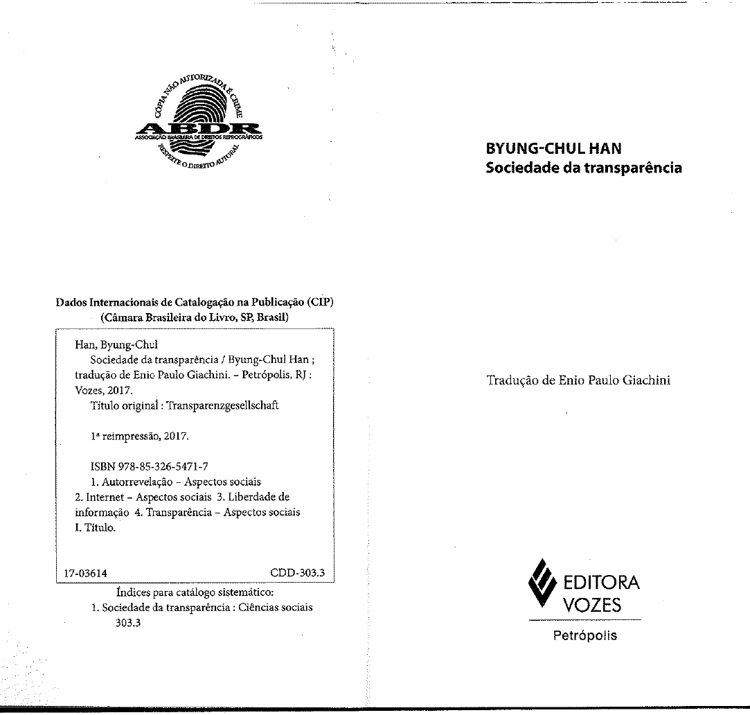 BDR ASSOCIAÇÃO DE BYUNG-CHUL HAN o DIREITO Sociedade da transparência Dados Internacionais de Catalogação na Publicação (CIP) (Câmara Brasileira do Livro, SP, Brasil) Han, Byung-Chul Sociedade da transparência / Byung-Chul Han ; tradução de Enio Paulo Giachini. - RJ : Tradução de Enio Paulo Giachini Vozes, 2017. Título original : Transparenzgesellschaft reimpressão, 2017. ISBN 978-85-326-5471-7 1. Autorrevelação Aspectos sociais 2. Internet - Aspectos sociais 3. Liberdade de informação 4. Transparência - Aspectos sociais I. Título. 17-03614 CDD-303.3 EDITORA Índices para catálogo sistemático: 1. Sociedade da transparência : Ciências sociais VOZES 303.3 Petrópolis2012 Matthes & Seitz Verlag, Berlin. Título original em alemão: Transparenzgesellschaft Direitos de publicação em língua portuguesa - Brasil: 2017, Editora Vozes Ltda. Rua Frei 100 25689-900 Petrópolis, RJ www.vozes.com.br Brasil Todos os direitos reservados. Nenhuma parte desta obra poderá ser reproduzida ou transmitida por qualquer forma e/ou quaisquer meios (eletrônico ou mecânico, incluindo fotocópia e gravação) ou arquivada em qualquer sistema ou banco de dados sem permissão escrita da CONSELHO EDITORIAL Diretor Gilberto Gonçalves Garcia Editores Aline dos Santos Carneiro Edrian Josué Pasini Marilac Loraine Oleniki Welder Lancieri Marchini Conselheiros Daquilo de que os outros Francisco Morás Ludovico Garmus não sabem sobre mim, Teobaldo Heidemann Volney J. Berkenbrock disso eu vivo. Secretário executivo João Batista Kreuch Peter Editoração: Gleisse Dias dos Reis Chies Diagramação: Sheilandre Gráfico Revisão gráfica: Nilton Braz da Rocha Projeto gráfico de capa: Pierre Fauchau Arte-finalização de capa: Sérgio Cabral ISBN 978-85-326-5471-7 (Brasil) ISBN 978-3-88221-595-3 (Alemanha) Editado conforme o novo acordo ortográfico. 1. HANDKE, P. Am Felsfenster morgens. Salzburg, 1998, Este livro foi composto e impresso pela Editora Vozes Ltda p. 336.Sumário 1 Sociedade positiva, 9 2 Sociedade da exposição, 27. 3 Sociedade da evidência, 39 4 Sociedade pornográfica, 51 5 Sociedade da aceleração, 69 6 Sociedade da intimidade, 79 7 Sociedade da informação, 87 8 Sociedade do desencobrimento, 97 9 Sociedade do controle, 105I msmo 1 Sociedade positiva Discuss publico S Nos dias atuais não há mote que domi- L ne mais o discurso público do que o tema da transparência. Ele é evocado enfaticamente e conjugado sobretudo com o tema da liber- dade de informação. A exigência de transpa- rência, presente por todo lado, intensifica-se de tal modo que se torna um fetiche e um tema totalizante, remontando a uma mudança de paradigma que não se limita ao âmbito da política e da sociedade. Assim, a sociedade da negatividade dá espaço a uma sociedade na qual vai se desconstruindo cada vez mais a ne- gatividade em favor da positividade. Portanto, a sociedade da transparência vai se tornando uma sociedade positiva. As coisas se tornam transparentes quando eliminam de S1 toda e qualquerimages quando se tornam rasas e planas, quando se desconhece seu real alcance. Ela é uma coa- encaixam sem qualquer resistência ao curso sistêmica que abarca todos os processos raso do capital, da comunicação e da informa- sociais, submetendo-os a uma modificação As ações se tornam transparentes quando profunda. Hoje, o sistema social submete se transformam em operacionais, quando se todos os seus processos a uma coação por subordinam a um processo passível de cálculo, transparência, para operacionalizar e acelerar governo e controle. O tempo se torna transpa- esses processos. A pressão pelo movimen- rente quando é aplainado na sequência de um to de aceleração caminha lado a lado com a presente disponível. Assim, também o futuro é desconstrução da negatividade. A comunica- positivado em um presente otimizado. O tem- ção alcança sua velocidade máxima ali onde po transparente é um tempo sem destino e sem o igual responde ao igual, onde ocorre uma evento. As imagens tornam-se transparentes reação em cadeia do igual. A negatividade da quando, despojadas de qualquer dramaturgia, alteridade e do que é alheio ou a resistência do coreografia e cenografia, de toda profundida- outro atrapalha e retarda a comunicação rasa de hermenêutica, de todo sentido, tornam-se do igual. A transparência estabiliza e acelera pornográficas, que é o contato imediato entre sistema, eliminando o outro ou o estranho. imagem e olho. As coisas tornam-se transpa- Essa coação sistêmica transforma a sociedade rentes quando depõem sua singularidade e se da transparência em sociedade uniformizada expressam unicamente no preço. O dinheiro, (gleichgeschaltet). Nisso reside seu traço tota- que iguala tudo com tudo, desfaz qualquer litário, em uma "nova palavra para dizer uni- incomensurabilidade, qualquer singularidade formização: das coisas. Portanto, a sociedade da transpa- pois rência é um abismo infernal (Hölle) do igual. Quem relaciona a transparência apenas 2. Assim lemos no registro feito em seu diário por Ulrich Schacht, de 23/06/2011. Cf. SCHACHT, U. Über Schnee und com a corrupção e a liberdade de informação Geschichte. Berlim, 2012. 10 11m A linguagem transparente é formal; sim, por transparência nivela o próprio ser huma- uma linguagem puramente mecânica, opera- no a um elemento funcional de um sistema. cional, que elimina toda ambivalência. O pró- Nisso reside a violência da transparência. prio Humboldt já chamara a atenção para a in- A alma humana necessita naturalmente transparência fundamental que é constitutiva de esferas onde possa estar junto de si mesma, da linguagem humana: "Na palavra, ninguém sem o olhar do outro. Pertence a ela uma im- pensa justa e precisamente aquilo que o outro permeabilidade. Uma total "iluminação" iria [pensa], e por menor que seja a diferença, ela carbonizar a alma e provocar nela uma espé- oscila, como um círcu