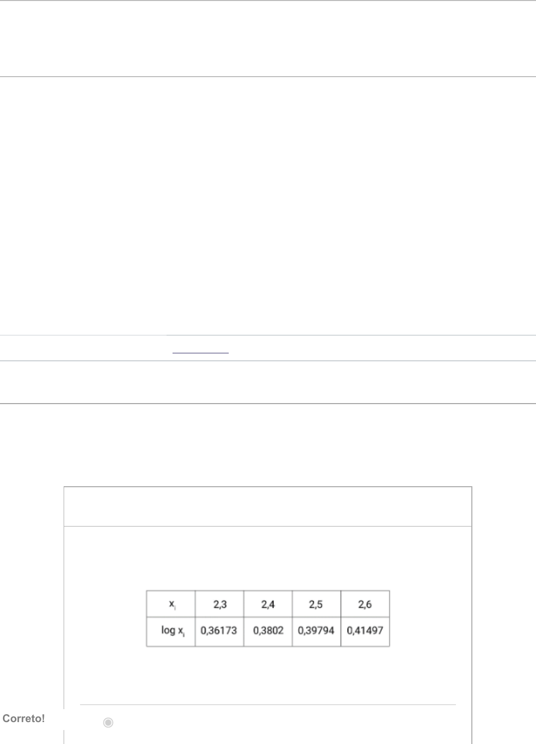 * Algumas perguntas ainda não avaliadas PRV - Prova Entrega 12 dez em 23:59 Pontos 4 Perguntas 12 Disponível 5 dez em 19:00 - 12 dez em 23:59 Limite de tempo 180 Minutos Instruções Histórico de tentativas Tentativa Tempo Pontuação MAIS RECENTE Tentativa 1 57 minutos 1,8 de 4 * Pontuação deste teste: 1,8 de 4 * Enviado 8 dez em 22:19 Esta tentativa levou 57 minutos. Olá, Aluno A prova será composta por 10 questões objetivas valendo 0,2 pontos cada, além de 2 questões dissertativas valendo 1 ponto cada. Totalizando 4 pontos, que serão somados com as atividades realizadas durante o trimestre. Lembrando que a prova terá um prazo de 3 horas para realização a partir do momento que você acessa-la. Boa Prova! 0,2 / 0,2 ptsPergunta 1 Considere a tabela a seguir. Utilize o polinômio de Lagrange e calcule o valor de log 2,45. 0,38916 Correto!Correto! https://ucaead.instructure.com/courses/66777/quizzes/235905/history?version=1 0,36003 0,37100 0,37003 0,35003 0,2 / 0,2 ptsPergunta 2 Dada a matriz A = [3 2 1 1] encontre a matriz A .-1 A = [1 -2 -5 3]-1 A = [1 -2 -1 3]Correto!Correto! -1 A = [3 -2 -1 3]-1 A = [1 -2 -1 8]-1 A = [1 -2 -1 7]-1 0,2 / 0,2 ptsPergunta 3 Suponha que um sistema homogêneo tenha quatro equações e seis incógnitas e que A seja sua matriz completa. Marque a alternativa correta. Esse sistema tem solução única. Se duas linhas se tornarem nulas no processo de escalonamento, esse sistema terá duas variáveis independentes. A matriz completa desse sistema tem seis linhas e quatro colunas. Se a linha 1 e a linha 2 forem múltiplas, mas as demais não, o sistema terá três variáveis independentes. Correto!Correto! Esse sistema tem apenas uma variável independente. 0 / 0,2 ptsPergunta 4 As matrizes têm aplicação na Computação Gráfica, por exemplo, nas imagens. Elas são formadas por pixels que são elementos de uma matriz. É por meio de operações com matrizes que programas gráficos alteram a posição dos pixels que compõem uma imagem, fazendo-a girar, mudar de posição ou de escala. Essas transformações, chamadas na Computação Gráfica de transformações geométricas, são muito úteis. Nesse contexto, encontre a nova posição do ponto (4,5) após uma rotação de 180° no sentido anti-horário, em torno da origem, assinalando a alternativa correta. Dica: aplica a matriz de rotação: A nova posição será (−4,−5). esposta corretaesposta correta A nova posição será (2,−5). A nova posição será (3,−5). A nova posição será (4,5). A nova posição será (4,−5). ocê respondeuocê respondeu 0,2 / 0,2 ptsPergunta 5 Obtenha o polinômio interpolador de Lagrange para certa função f sabendo que f(-1) = 1; f(0) = -1; f(2) = 2 e f(3) = 2. x – 19x + 3x + 123 2 (5x – 19x + 12)Correto!Correto! 3 2 x – x + 7x + 123 2 (x – x + 12)3 2 (x – 19x )3 2 0,2 / 0,2 ptsPergunta 6 Os sistemas usados para o desenvolvimento de modelos matemáticos apresentam diferentes classificações. É fundamental conhecê-las e entender suas principais diferenças para optar pelo sistema mais adequado com vistas a auxiliar na tomada de decisão. Sobre o sistema contínuo, marque a alternativa correta. É um modelo para dados que são não discretos e que utilizam os dados aleatórios. É aquele em que a relação entre a variável e o sinal de interesse é descrita de forma contínua no tempo. Correto!Correto! É um sistema em que a relação entre a variável de saída e o sinal de interesse é descrita de forma contínua no espaço. É um modelo típico que leva em conta um sistema de equações diferenciais parciais. É um sistema em que a relação entre a variável de entrada e o sinal de saída é descrita de forma contínua no espaço. 0,2 / 0,2 ptsPergunta 7 Com relação às técnicas de modelagem matemática, assinale a alternativa correta. Após definir as variáveis de um problema matemático, ele está concluído. O modelo matemático é uma representação simplificada (abstração) do problema real. Correto!Correto! Os modelos de simulação são os mais utilizados na prática. A modelagem matemática pode ser utilizada somente para a área da engenharia. O primeiro passo de um problema matemático é encontrar a função objetivo. 0,2 / 0,2 ptsPergunta 8 Encontre a área do triângulo determinado pelos vértices A(1,1,1), B(2,3,-5) e C(0,2,2). 8 Correto!Correto! 4 1 3 0,2 / 0,2 ptsPergunta 9 Em muitos problemas tratados pela geometria analítica, há a necessidade de determinarmos a distância de um ponto a uma reta. É possível determinar a distância do ponto P(x0,y0) à reta Ax+By+C=0 pela fórmula: Qual a distância aproximada do ponto P(2,6) à reta y=-3x+10 ? 0,63 unidades de comprimento Correto!Correto! 2,61 unidades de comprimento 0,82 unidades de comprimento 0,24 unidades de comprimento 0,95 unidades de comprimento 0,2 / 0,2 ptsPergunta 10 Você trabalha no laboratório de metrologia de uma grande multinacional e, baseado nos conceitos de tendência e correção dos erros de medição, você precisa solucionar um problema. O padrão utilizado para a calibração tem a medida de 50 mm, e você mediu repetidas vezes com um micrômetro milesimal encontrando um resultado médio de 50,237 mm. Qual é a tendência do instrumento e qual é a correção que deve ser aplicada? Tendência de -0,237 mm e correção de +0,237 mm. Tendência de +0,237 mm e correção de +0,237 mm. Tendência de -0,237 mm e correção de -0,237 mm. Tendência de +0,23 mm e correção de -0,23 mm. Tendência de +0,237 mm e correção de -0,237 mm. Correto!Correto! Não avaliado ainda / 1 ptsPergunta 11 vimos três diferentes métodos para determinar raízes reais de funções contínuas. Em teoria, desde que as funções sejam contínuas e as devidas condições de convergência de cada método sejam satisfeitas, podemos dizer que o método de Newton supera o de Bissecção e o da Falsa Posição. Agora você fará o comparativo dos três métodos. A in