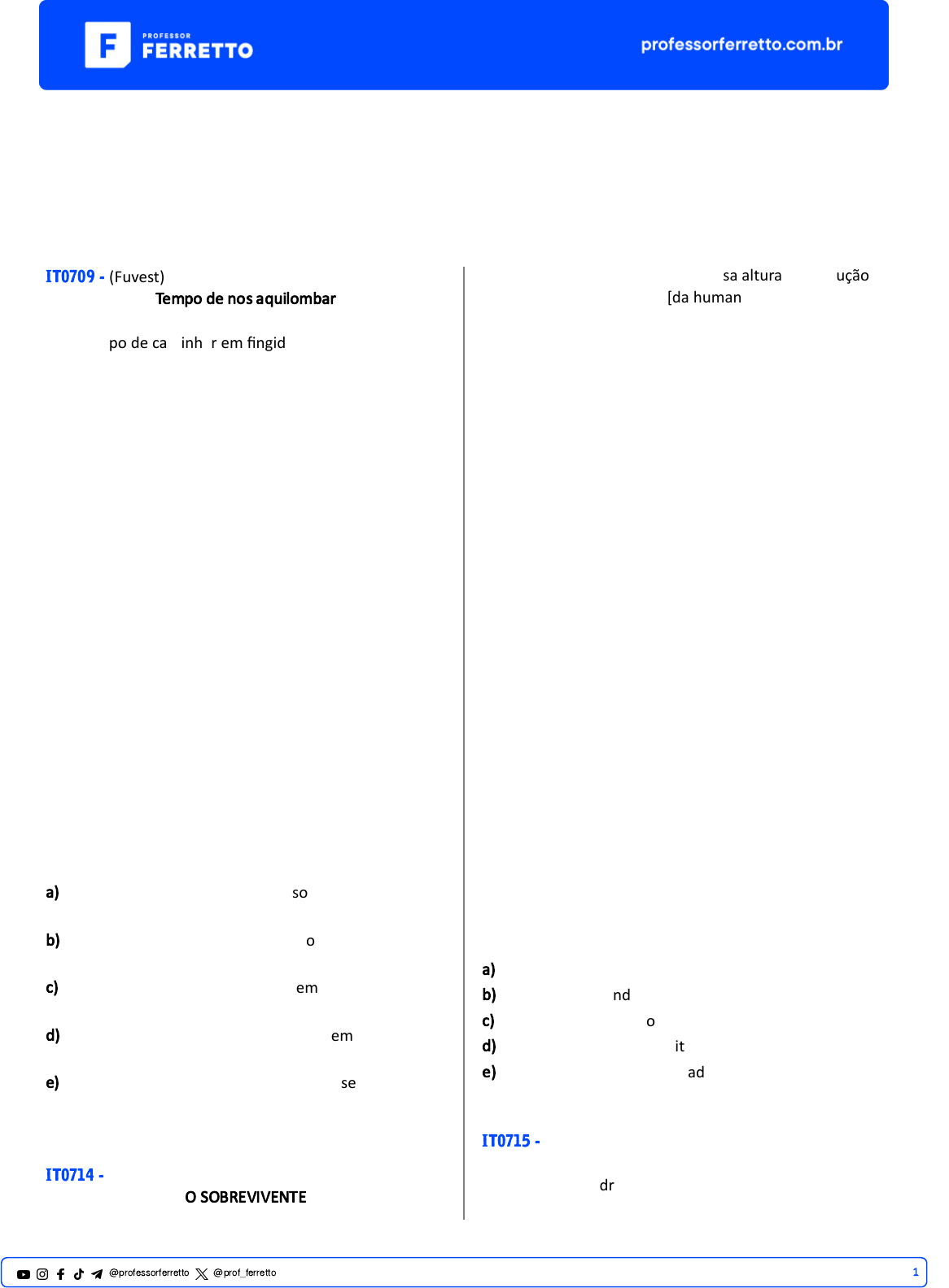 Vestibulares Texto Poético, Intertextualidade e Interdiscursividade IT0709 - (Fuvest) Tempo de nos aquilombar É tempo de caminhar em fingido silêncio, e buscar o momento certo no grito, aparentar fechar um olho evitando o cisco e abrir escancaradamente o outro. É tempo de fazer os ouvidos moucos para os vazios lero-leros, e cuidar dos passos assuntando as vias, ir se vigiando atento, que o buraco é fundo. É tempo de ninguém se soltar de ninguém, mas olhar fundo na palma aberta a alma de quem lhe oferece o gesto. O laçar de mãos não pode ser algemas, sim acertada tá�ca, necessário esquema. É tempo de formar novos quilombos, em qualquer lugar que estejamos e que venham dias futuros, salve 2020 A mís�ca quilombola persiste afirmando: "a liberdade é uma luta constante". Conceição Evaristo. Jornal O Globo, 31/12/2019. Considerando o enfoque do texto na denúncia social, o eu lírico revela, predominantemente, a) a crí�ca às reações da nossa sociedade frente aos problemas que ficaram no passado. b) as jus�fica�vas para a segregação social no mundo contemporâneo. c) as tensões sociais presentes há tempos, sob a luz dos embates do momento atual. d) a importância de contornar os problemas sociais do passado. e) as peculiaridades das diferentes classes sociais ao enfrentar os problemas sociais atuais. IT0714 - (Fuvest) O SOBREVIVENTE Impossível compor um poema a essa altura da evolução [da humanidade. Impossível escrever um poema - uma linha que seja - de [verdadeira poesia O úl�mo trovador morreu em 1914. Tinha um nome de que ninguém se lembra mais. Há máquinas terrivelmente complicadas para as [necessidades mais simples. Se quer fumar um charuto aperte um botão. Paletós abotoam-se por eletricidade. Amor se faz pelo sem fio. Não precisa estômago para digestão. Um sábio declarou a O jornal que ainda falta muito para a�ngirmos um nível razoável de cultura. Mas até lá, felizmente, estarei morto. Os homens não melhoraram e matam-se como percevejos. Os percevejos heroicos renascem. Inabitável o mundo é cada vez mais habitado. E se os olhos reaprendessem a chorar seria um segundo [dilúvio (Desconfio que escrevi um poema.) Carlos Drummond de Andrade. Alguma Poesia, 1930. Entre o primeiro e o úl�mo verso, há uma aparente contradição, que, todavia, não se sustenta porque a) os entraves à plenitude lírica são removidos. b) os trovadores ainda inspiramos enamorados. c) a sabedoria controla o poder das máquinas. d) os heróis sempre ressuscitam neste mundo. e) a poesia resiste à nega�vidade do seu tempo. IT0715 - (Fuvest) [...] Um sino de vidro claro, 1@professorferretto @prof_ferretto uma ampola cristalina e contrá�l, flutua calma no seu caminho. “Peixinho, peixinho, deixe-a ir! Peixinho, peixinho, se apresse em fugir!” Ali atrás, longos fios transparentes se arrastam e os olhos do peixinho a um banquete convidam. “Serão, por acaso, minhocas o que eu vejo de repente?” “Peixinho, peixinho, deixe-me alertar! Peixinho, peixinho, não se deixe enganar!” Próximo demais o peixinho chegou: “Ai, ai, ai, agora ela me pegou! Firme me amarrou e não consigo me soltar! Firme me envolve e arde de matar!” [...]. Tradução e adaptação de Flavia Souza, Stefano Hagen e Luiz Fontes. O fragmento de poema apresentado foi escrito pelo naturalista Fritz Müller para suas filhas. O trecho do poema permite afirmar que a predação é realizada por um/uma a) camarão. b) água-viva. c) tubarão. d) lula. e) plâncton. IT0721 - (Fuvest) O QUINTO IMPÉRIO Triste de quem vive em casa, Contente com o seu lar, Sem que um sonho, no erguer de asa, Faça até mais rubra a brasa Da lareira a abandonar! Triste de quem é feliz! Vive porque a vida dura. Nada na alma lhe diz Mais que a lição da raiz — Ter por vida a sepultura. Eras sobre eras se somem No tempo que em eras vem. Ser descontente é ser homem. Que as forças cegas se domem Pela visão que a alma tem! E assim, passados os quatro Tempos do ser que sonhou, A terra será teatro Do dia claro, que no atro Da erma noite começou. Grécia, Roma, Cristandade, Europa — os quatro se vão Para onde vai toda idade. Quem vem viver a verdade Que morreu D. Sebas�ão? Fernando Pessoa. Mensagem. De acordo com o texto, a ideia de felicidade, também nuclear em outros poemas de Mensagem, a) alimenta as aspirações humanas. b) compreende-se como superação da morte. c) iden�fica-se com o des�no heroico. d) compõe a mediocridade co�diana. e) situa-se como finalidade da existência. IT0722 - (Fuvest) “Migna terra tê parmeras Che ganta inzima o sabiá. As aves che stó aqui, Tambê tu�os sabi gorgeá. (...) Os rio lá sô maise grandi Dus rio di tu�as naçó; I os ma�o si perdi di vista, Nu meio da imensidó.” BANANÉRE, Juó. “Migna terra”. La Divina Increnca. São Paulo: Irmãos Marrano Editora, 1924 Assinale a alterna�va que melhor expressa as relações entre o poema e a inserção social de imigrantes italianos no Brasil. a) O poema traça uma analogia entre a paisagem natural da Itália e do Brasil, sob os olhos de um imigrante. b) A referência à oralidade era um reconhecimento à contribuição desta comunidade para a nova literatura brasileira. c) O poema tema�za a revolta dos imigrantes camponeses italianos ao chegarem nas fazendas de café. d) O caráter lírico presente no poema indica a emo�vidade e o desejo de aceitação por parte dos imigrantes. e) A linguagem adotada no poema expressava uma maneira caricata de representar o idioma daquela comunidade. IT0726 - (Fuvest) 2@professorferretto @prof_ferretto Nun'Álvares Pereira Que auréola te cerca? É a espada que, volteando, Faz que o ar alto perca Seu azul negro e brando. Mas que espada é que, erguida, Faz esse halo no céu? É Excalibur, a ungida, Que o Rei Artur te deu. 'Sperança consumada, S. Portugal em ser, Ergue a luz da tua espada Para a estrada se ver! Fernando Pessoa. In: “A Coroa”, P