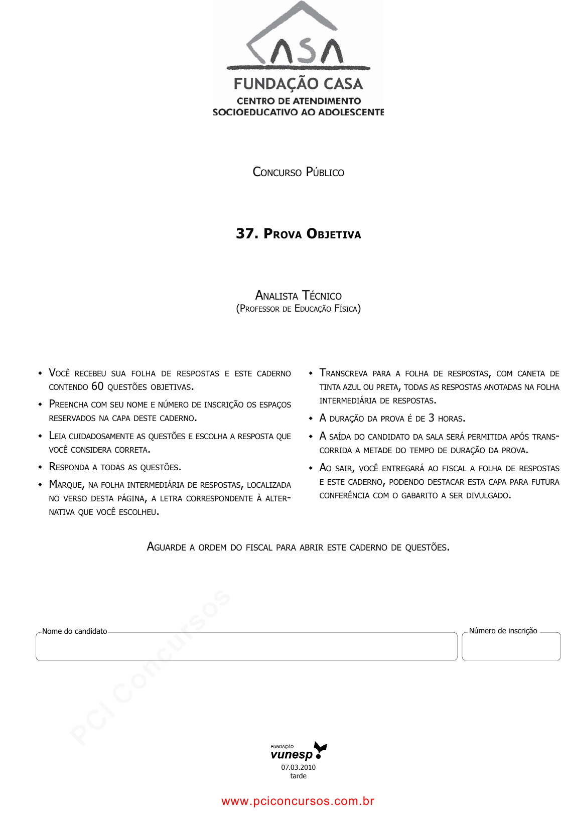 pcimarkpci MjgwNDowNTZjOmI0OWM6NTUwMDozYzI2OmNiNDQ6MDg4Nzo3ZWJh:RnJpLCAxNCBNYXIgMjAyNSAyMjozMTo0NCAtMDMwMA== www.pciconcursos.com.br CONCURSO PÚBLICO 37. PROVA OBJETIVA ANALISTA TÉCNICO (PROFESSOR DE EDUCAÇÃO FÍSICA) � VOCÊ RECEBEU SUA FOLHA DE RESPOSTAS E ESTE CADERNO CONTENDO 60 QUESTÕES OBJETIVAS. � PREENCHA COM SEU NOME E NÚMERO DE INSCRIÇÃO OS ESPAÇOS RESERVADOS NA CAPA DESTE CADERNO. � LEIA CUIDADOSAMENTE AS QUESTÕES E ESCOLHA A RESPOSTA QUE VOCÊ CONSIDERA CORRETA. � RESPONDA A TODAS AS QUESTÕES. � MARQUE, NA FOLHA INTERMEDIÁRIA DE RESPOSTAS, LOCALIZADA NO VERSO DESTA PÁGINA, A LETRA CORRESPONDENTE À ALTER- NATIVA QUE VOCÊ ESCOLHEU. � TRANSCREVA PARA A FOLHA DE RESPOSTAS, COM CANETA DE TINTA AZUL OU PRETA, TODAS AS RESPOSTAS ANOTADAS NA FOLHA INTERMEDIÁRIA DE RESPOSTAS. � A DURAÇÃO DA PROVA É DE 3 HORAS. � A SAÍDA DO CANDIDATO DA SALA SERÁ PERMITIDA APÓS TRANS- CORRIDA A METADE DO TEMPO DE DURAÇÃO DA PROVA. � AO SAIR, VOCÊ ENTREGARÁ AO FISCAL A FOLHA DE RESPOSTAS E ESTE CADERNO, PODENDO DESTACAR ESTA CAPA PARA FUTURA CONFERÊNCIA COM O GABARITO A SER DIVULGADO. AGUARDE A ORDEM DO FISCAL PARA ABRIR ESTE CADERNO DE QUESTÕES. Nome do candidato Número de inscrição 07.03.2010 tarde www.pciconcursos.com.br pcimarkpci MjgwNDowNTZjOmI0OWM6NTUwMDozYzI2OmNiNDQ6MDg4Nzo3ZWJh:RnJpLCAxNCBNYXIgMjAyNSAyMjozMTo0NCAtMDMwMA== www.pciconcursos.com.br 2CASA0902/37-AnalistaTécnico-ProfEducFísica FOLHA INTERMEDIÁRIA DE RESPOSTAS ANALISTA TÉCNICO (PROFESSOR DE EDUCAÇÃO FÍSICA) www.pciconcursos.com.br pcimarkpci MjgwNDowNTZjOmI0OWM6NTUwMDozYzI2OmNiNDQ6MDg4Nzo3ZWJh:RnJpLCAxNCBNYXIgMjAyNSAyMjozMTo0NCAtMDMwMA== www.pciconcursos.com.br 3 CASA0902/37-AnalistaTécnico-ProfEducFísica LÍNGUA PORTUGUESA Leia o texto para responder às questões de números 01 a 15. O futuro é um mistério Nesta época do ano, é impossível escapar da tentação de fazer previsões. Afinal, desde a pré-história, o homem não deixa de que- rer conhecer o futuro e de dominá-lo. Das técnicas de adivinhação inventadas pelos povos da Antiguidade aos métodos “científicos” elaborados por técnicos, os meios de predição variam: astrologia, leitura da borra de café ou cartas, até por internet. Pouco importa. Cada época tem necessidade de sonhar com um amanhã: melhor ou pior. Oráculos, profecias, predições, utopias, todas as anteci- pações que os homens construíram, no decorrer da história, não se realizaram. Mas elas são reflexos de suas esperanças e crenças. (...) Um poeta disse que, para ser profeta, bastava ser pessimista. Já na metade do século 19, havia quem escrevesse sobre um mundo futuro mecanizado, sem ideias espirituais, vivendo-se ao ritmo das crises econômicas e ameaças de guerra. Marcados pela Primeira Guerra Mundial, muitos pensadores fizeram coro ao pessimismo. Freud contestou a ideia de progresso e supôs a existência de um instinto de destruição. Não faltou quem visse nas marcas do tem- po o anúncio do fim de tudo, ou uma caminhada na direção ao sofrimento, como predisse o escritor George Orwell. Boa parte desse pessimismo se enraizava na tomada de consciência de uma distância crescente entre progresso técnico e progresso moral. Para solucionar essa pendência, em 1971, o Clube de Roma reu- niu uma elite de pensadores. Conclusão? O grupo anteviu que o crescimento demográfico e econômico provocaria uma catástrofe e uma crise ecológica sem precedentes, em meados do século 21. E nós ainda acreditamos em previsões? Acho que, se os brasi- leiros mudaram, foi no sentido de não acreditarem mais nelas. Dei- xamos para trás a atitude infantil de insistir em sonhos que acabam em decepções. Ou de crer em falsas promessas. Nunca o futuro foi tão misterioso quanto neste início de século 21. Nenhuma máquina de previsão conseguiu explicar a complexidade do mundo atual, onde tudo se confunde, onde realidade e espetáculo se misturam, valores e ideologias desmoronam, tudo se desencanta. Aquecimento do planeta, desastres climáticos, aumento do nível dos oceanos, fim das florestas, fome, corrupção em toda a parte, empobrecimento dos mais pobres, enriquecimento dos mais ricos, enfim, a lista é longa. A resposta, talvez, esteja em fugir das previsões de futuro e jogar no presente. Vivê-lo com delicadeza e investir nos pequenos prazeres. Fórmula excelente para enfrentarmos o apocalipse, como querem muitos. Ou o paraíso, como esperam outros. (Mary Del Priore, O Estado de S.Paulo, 03.01.2010. Adaptado) 01. Sobre as previsões, é correto afirmar que a autora, no primeiro parágrafo, (A) reconhece a eficácia que elas têm, já que se constituíram em um método seguro de aprender com o passado para prever o futuro. (B) admite que elas são perigosas, já que, a partir delas, as pessoas traçam planos para conduzir a vida. (C) confere-lhes legitimidade científica, pois elas vêm se pau- tando por critérios comprovados pelas ciências em geral. (D) discorda da maneira como são praticadas hoje, cada vez mais distanciadas dos modelos concebidos na Antiguidade. (E) aceita a validade delas para nutrir as aspirações humanas, apesar de não se realizarem concretamente. 02. Assinale a alternativa correta quanto às relações que podem ser estabelecidas entre Freud, George Orwell e o Clube de Roma. (A) As conclusões do Clube de Roma contrapõem-se às expectativas pessimistas de Freud e de George Orwell. (B) George Orwell e Freud previram, como o Clube de Roma, que o século 21 teria um progresso inimaginável, apesar de toda a crise ecológica que se deflagraria. (C) As previsões de George Orwell caminham na direção contrária às previsões otimistas do Clube de Roma sobre o século 21. (D) As previsões do Clube de Roma confirmam a negativi- dade contida nas posições de Freud e de George Orwell. (E) O instinto de destruição e o sofrimento, previstos, res- pectivamente, por Freud e Orwell, foram negados pelo Clube